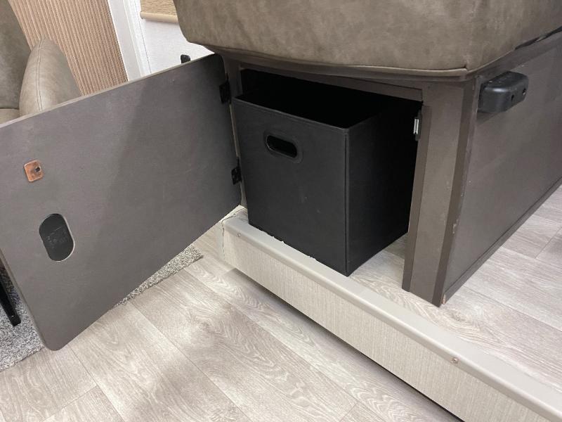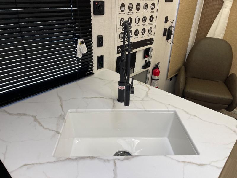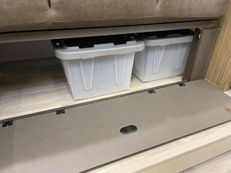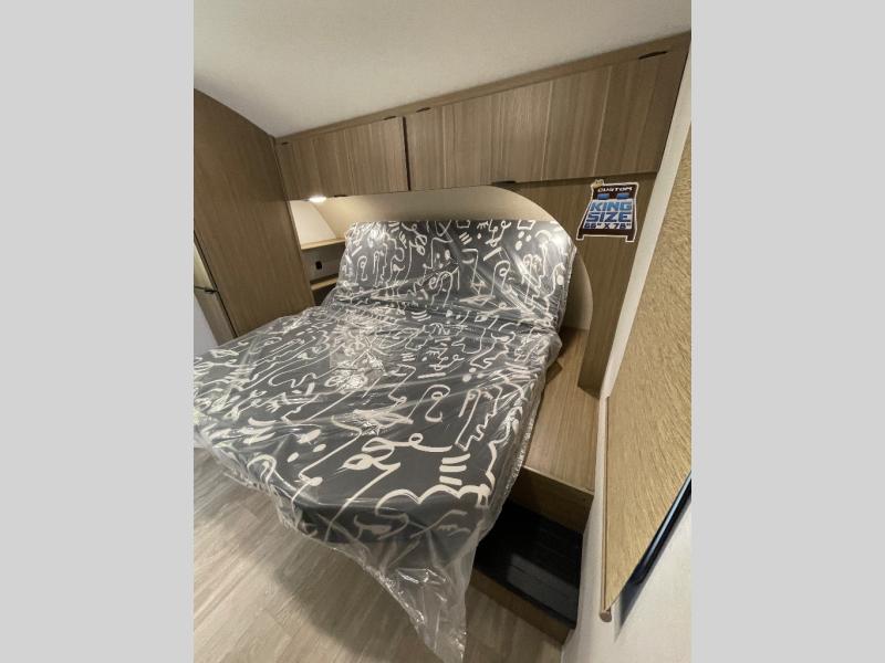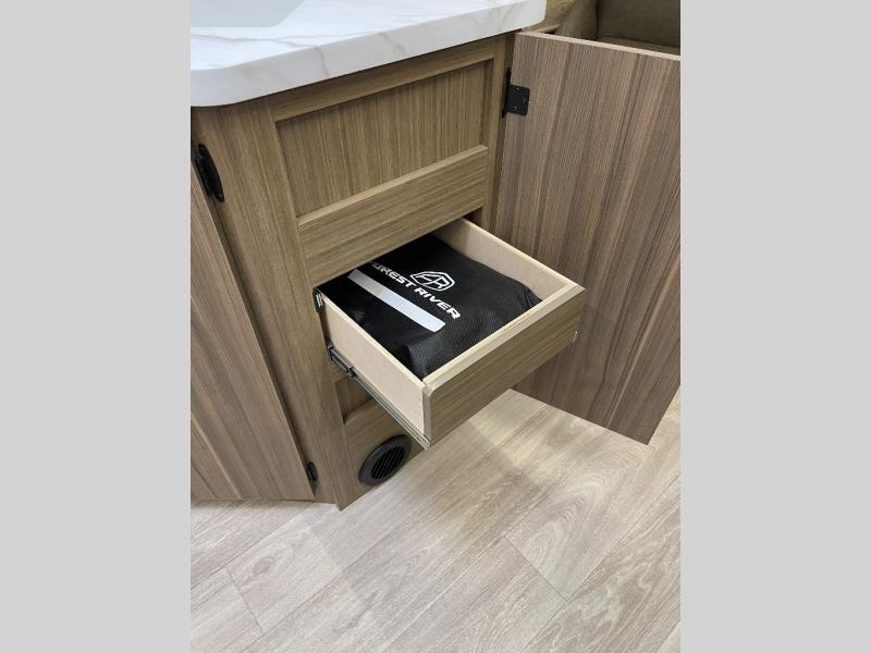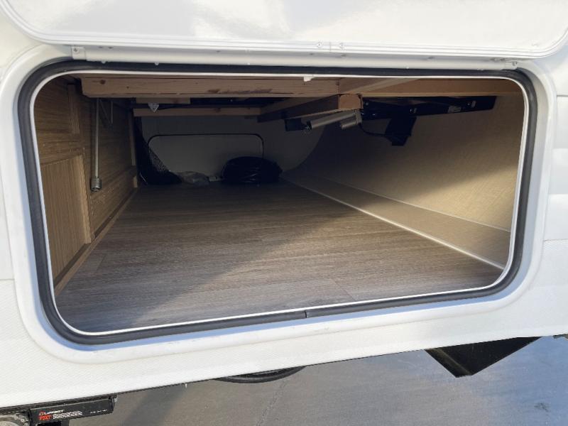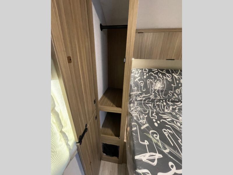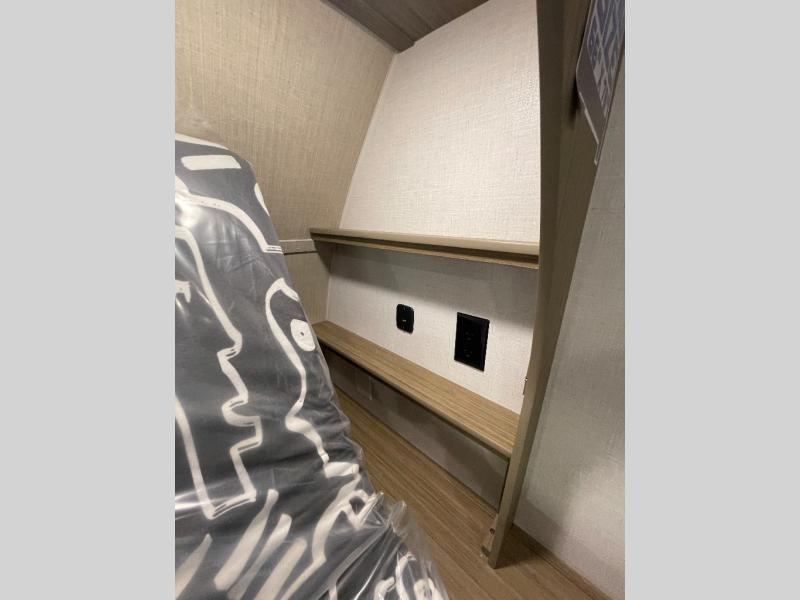 Comfort comes easy in this spacious travel trailer for three to four! The rear living area includes dual lounge chairs and a picture window so you can sit with your coffee and book in the morning. Once the chef of your crew has made breakfast in the fully equipped kitchen, you can dine at the booth dinette or take your plate outdoors under the awning. There is also a Versa-Lounge beside the dinette for more seating spaces. An entertainment center with a fireplace will make your space cozier, and you'll appreciate the hidden pantry behind for dry goods, movies, games and more! The walk-thru bath leads to the master bedroom where you'll find a walk-around Versa-Tilt custom king bed, a bedroom closet, and overhead storage so everything has a place!