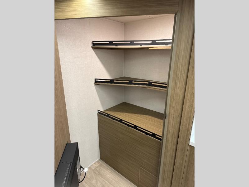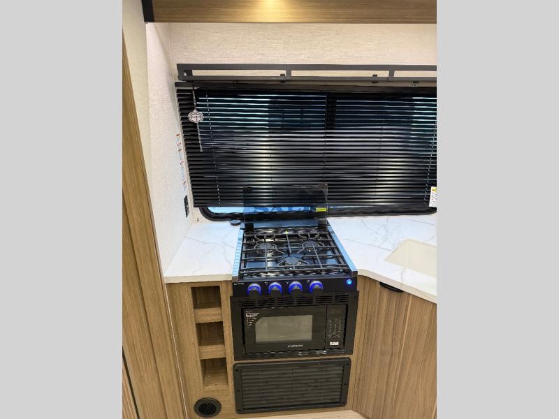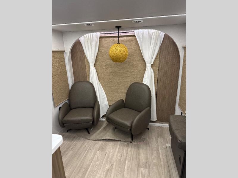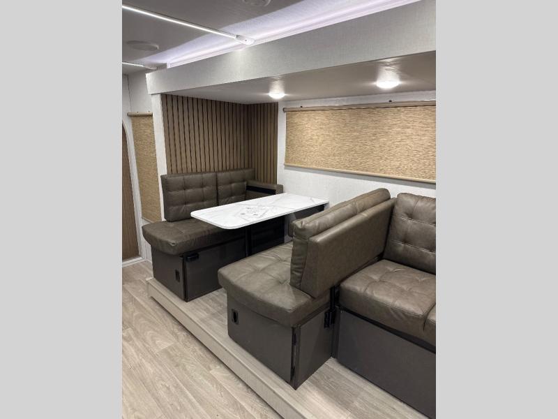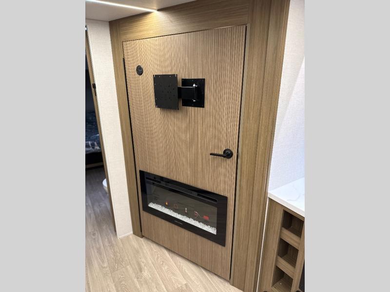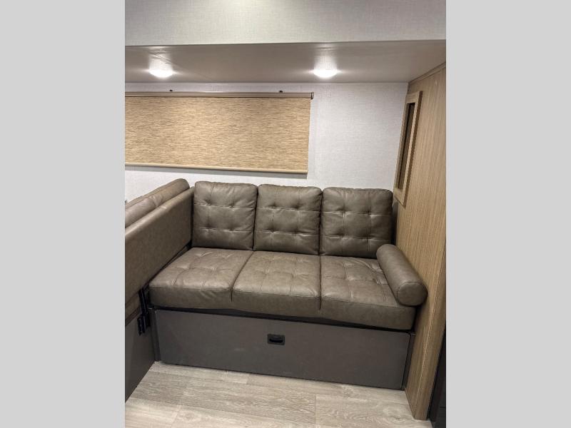 Comfort comes easy in this spacious travel trailer for three to four! The rear living area includes dual lounge chairs and a picture window so you can sit with your coffee and book in the morning. Once the chef of your crew has made breakfast in the fully equipped kitchen, you can dine at the booth dinette or take your plate outdoors under the awning. There is also a Versa-Lounge beside the dinette for more seating spaces. An entertainment center with a fireplace will make your space cozier, and you'll appreciate the hidden pantry behind for dry goods, movies, games and more! The walk-thru bath leads to the master bedroom where you'll find a walk-around Versa-Tilt custom king bed, a bedroom closet, and overhead storage so everything has a place!