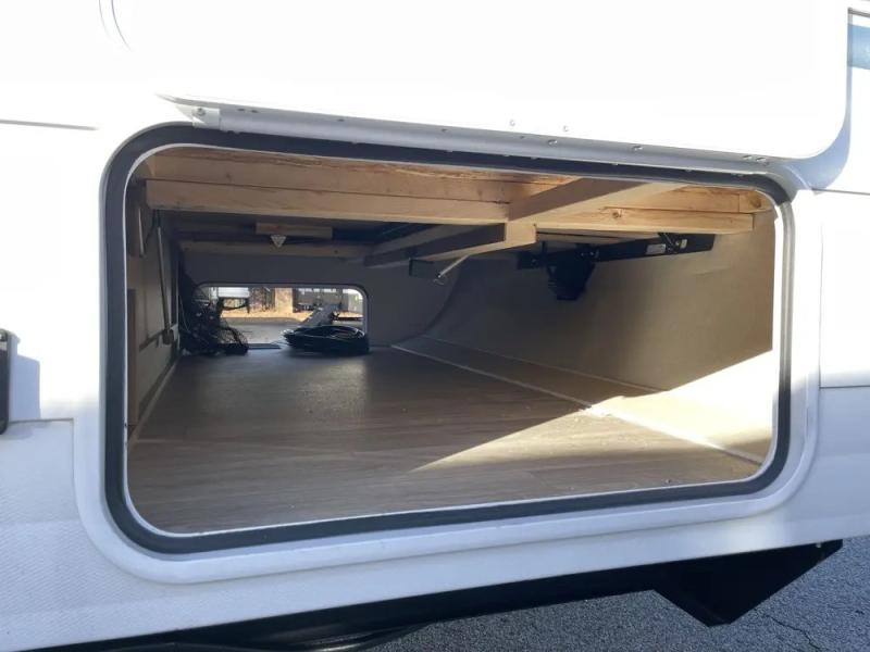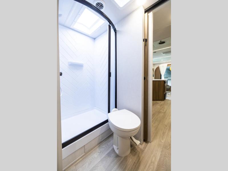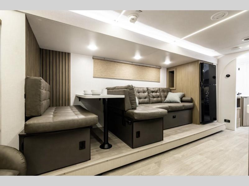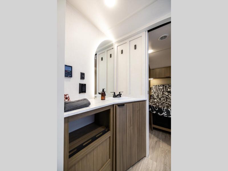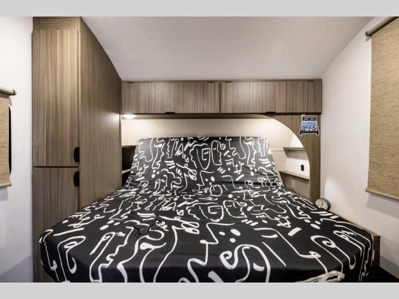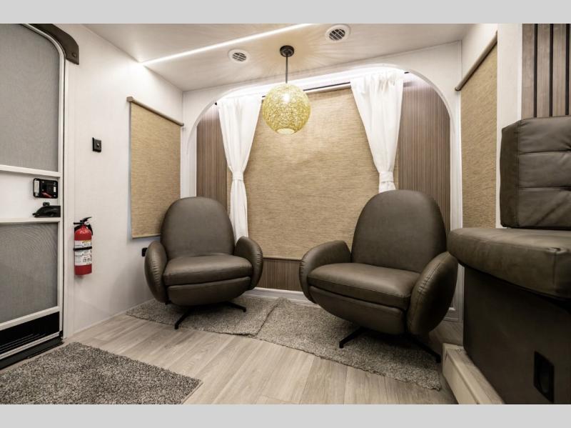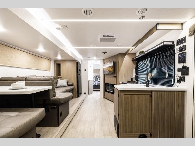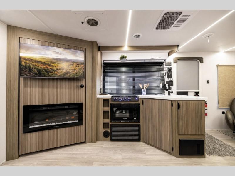 Comfort comes easy in this spacious travel trailer for three to four! The rear living area includes dual lounge chairs and a picture window so you can sit with your coffee and book in the morning. Once the chef of your crew has made breakfast in the fully equipped kitchen, you can dine at the booth dinette or take your plate outdoors under the awning. There is also a Versa-Lounge beside the dinette for more seating spaces. An entertainment center with a fireplace will make your space cozier, and you'll appreciate the hidden pantry behind for dry goods, movies, games and more! The walk-thru bath leads to the master bedroom where you'll find a walk-around Versa-Tilt custom king bed, a bedroom closet, and overhead storage so everything has a place!