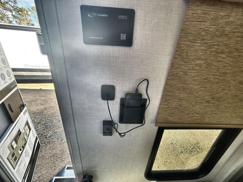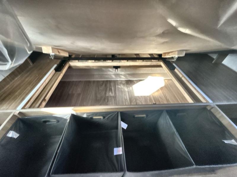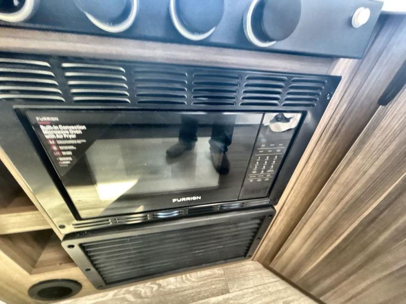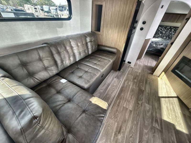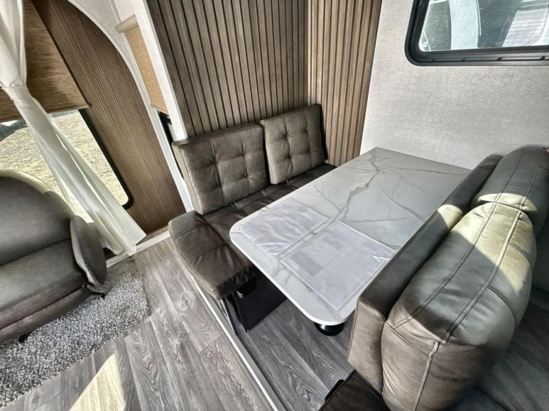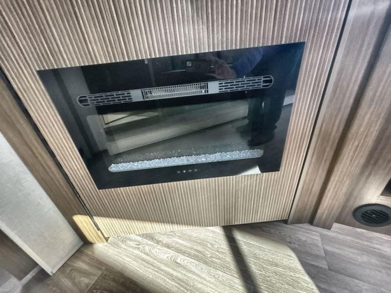 Comfort comes easy in this spacious travel trailer for three to four! The rear living area includes dual lounge chairs and a picture window so you can sit with your coffee and book in the morning. Once the chef of your crew has made breakfast in the fully equipped kitchen, you can dine at the booth dinette or take your plate outdoors under the awning. There is also a Versa-Lounge beside the dinette for more seating spaces. An entertainment center with a fireplace will make your space cozier, and you'll appreciate the hidden pantry behind for dry goods, movies, games and more! The walk-thru bath leads to the master bedroom where you'll find a walk-around Versa-Tilt custom king bed, a bedroom closet, and overhead storage so everything has a place!