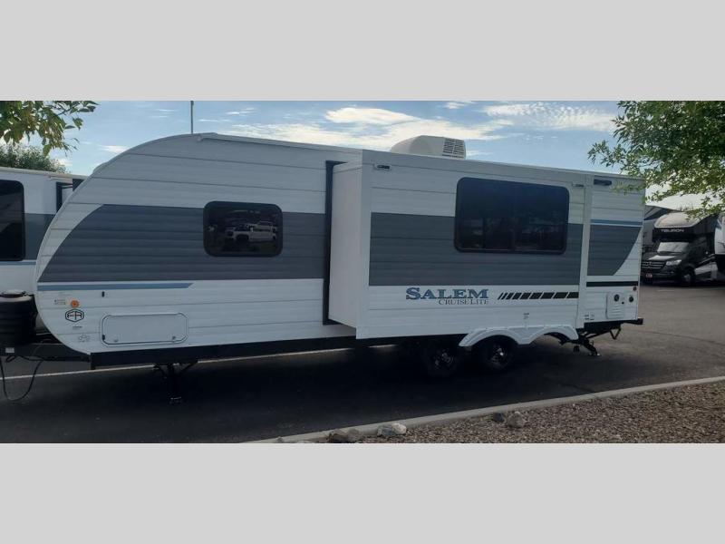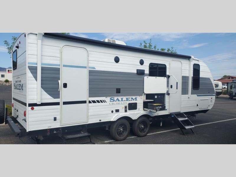 The Salem Cruise Lite travel trailers and toy haulers are value-minded units packed with great camping features! There are a variety of floorplans to choose from between two different regions. The enclosed Accessibelly will help protect against the elements and debris during transport, and the exterior retro/metal redesign is sure to be eye-catching! There are stylish roller shades inside, along with updated backsplash, elegant curtain rods and curtains, plus many more interior comforts! Choose a Salem Cruise Lite today for quality and value!