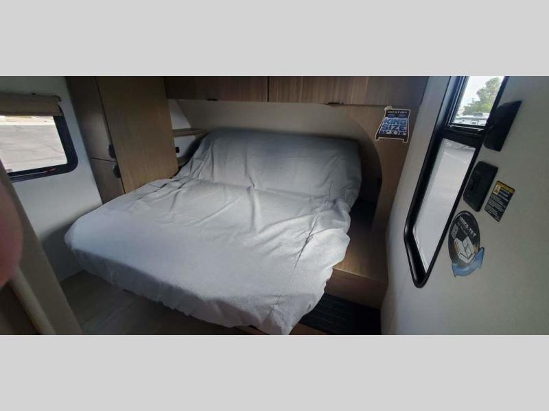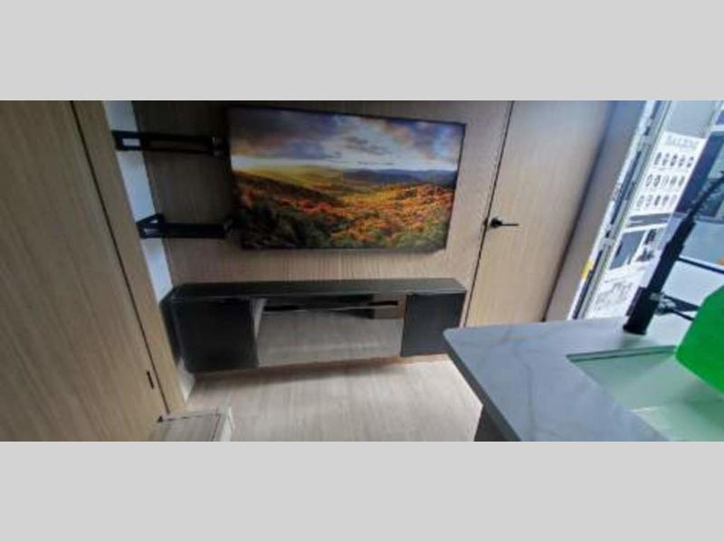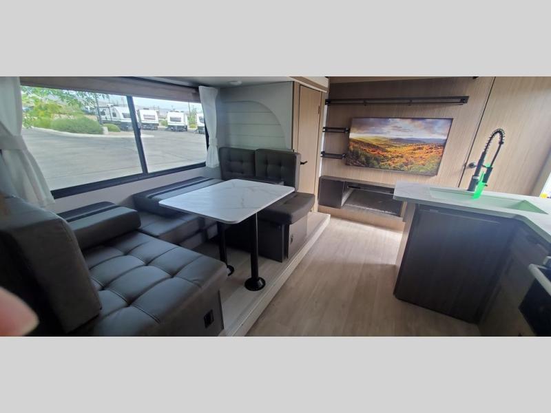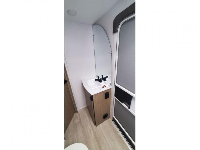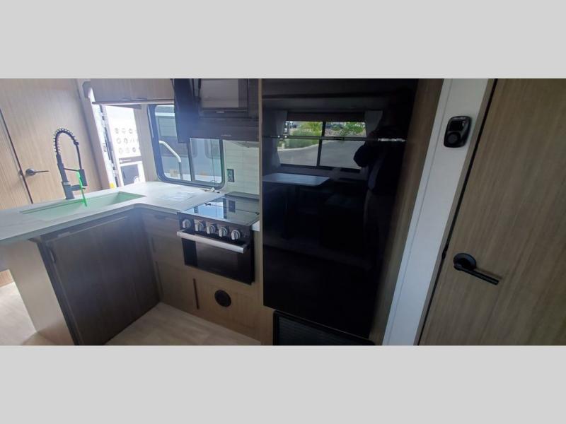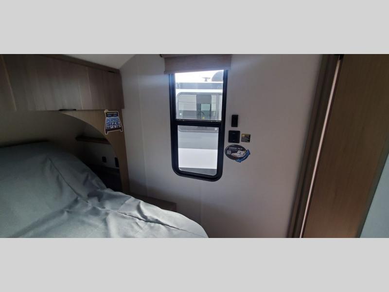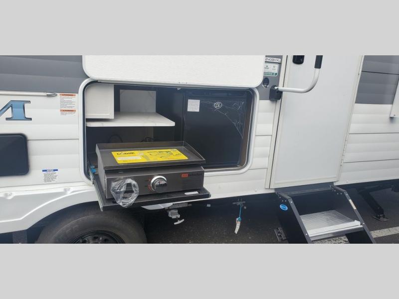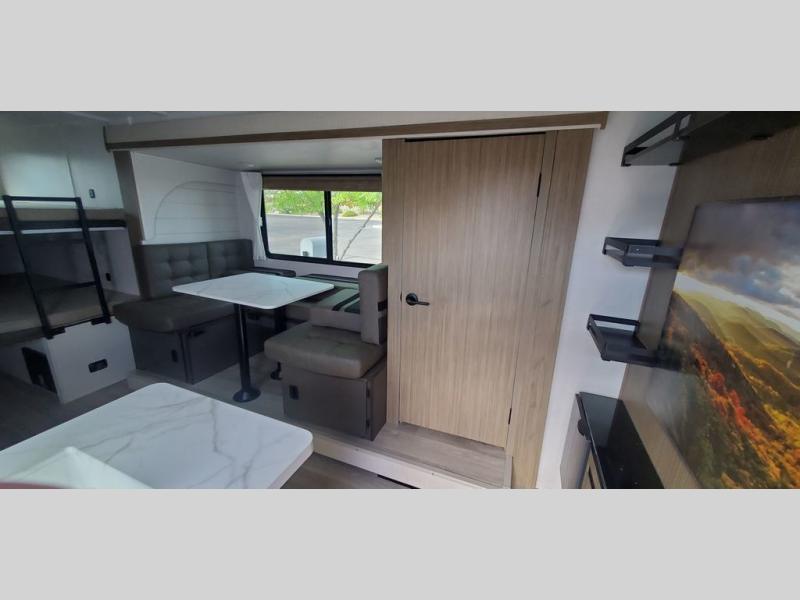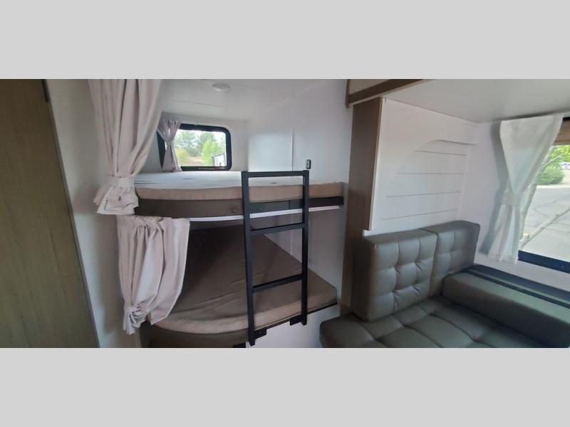 This travel trailer is big enough for the whole family to join in on the fun and weighs in at less than 6,000 lbs.! The kiddos can sleep on the corner 46" 74" double-size bunk beds, and you can sleep on the Versa Tilt custom king bed inside the front private bedroom, plus the U-shaped dinette can transform into an extra sleeping space. It also has a panoramic window for you to look out at your beautiful scenery while you eat. The rear corner bathroom has everything you will need to get squeaky clean each morning, as well as an exit/entrance door to the unit. The oversized refrigerator will keep your perishables fresh and the cooktop is just waiting for you to create a delicious meal. There is also a walk-in pantry for canned goods and an outside kitchen for the cook to enjoy!