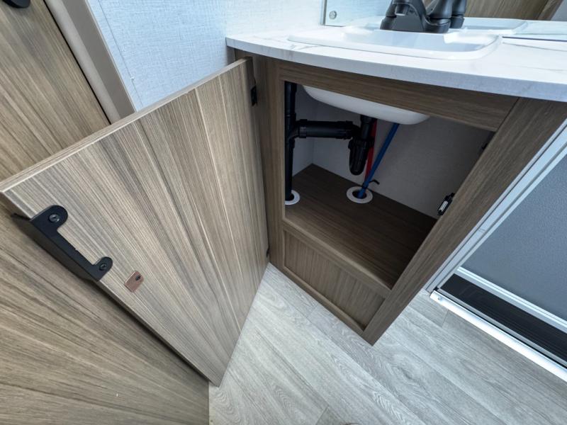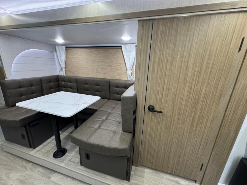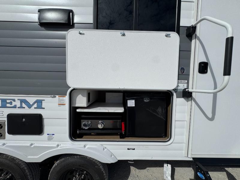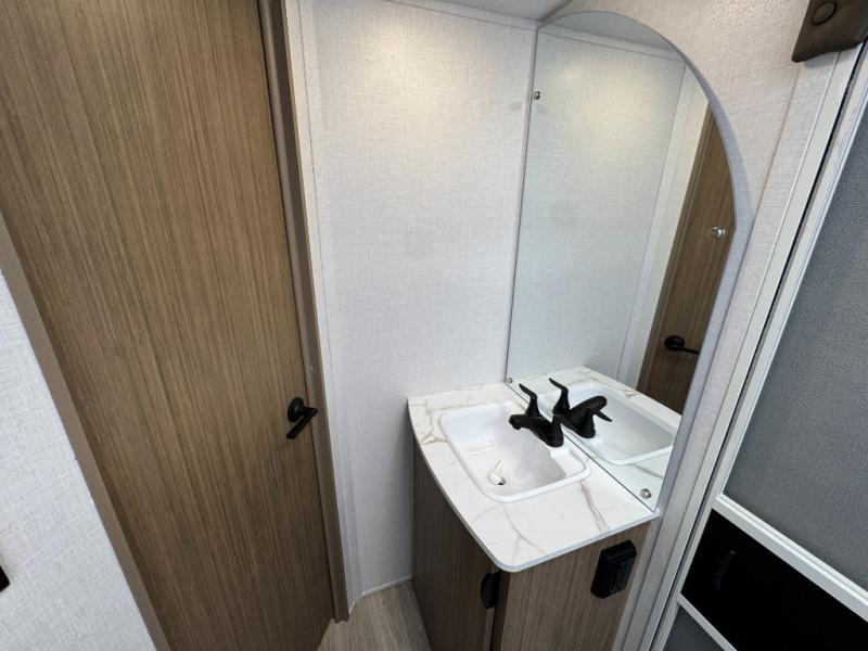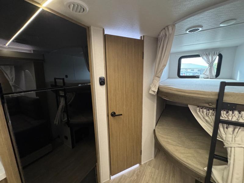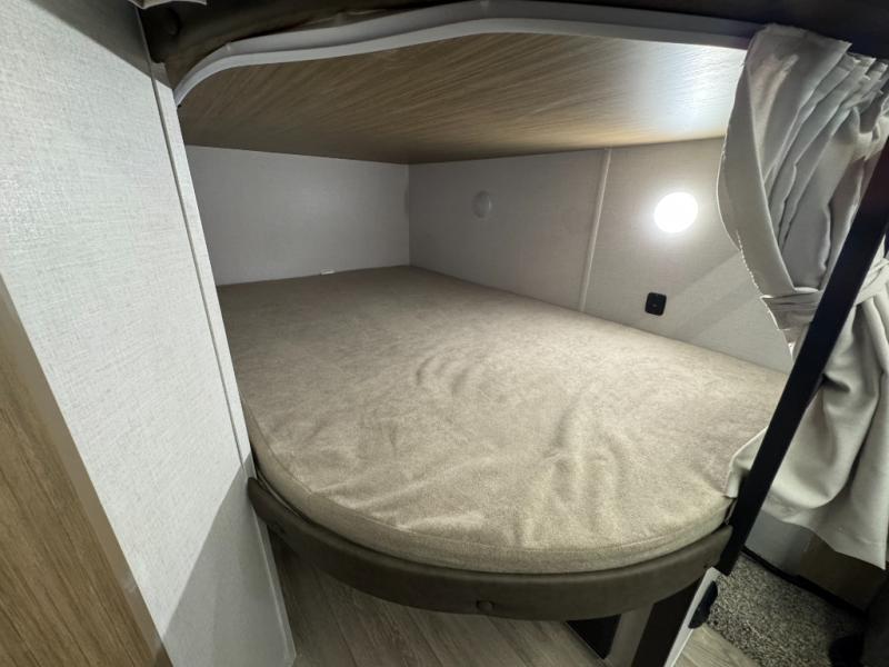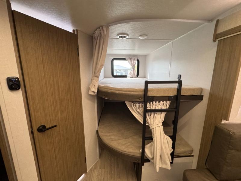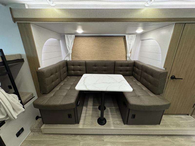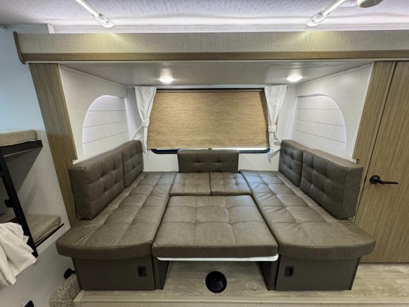 This travel trailer is big enough for the whole family to join in on the fun and weighs in at less than 6,000 lbs.! The kiddos can sleep on the corner 46" 74" double-size bunk beds, and you can sleep on the Versa Tilt custom king bed inside the front private bedroom, plus the U-shaped dinette can transform into an extra sleeping space. It also has a panoramic window for you to look out at your beautiful scenery while you eat. The rear corner bathroom has everything you will need to get squeaky clean each morning, as well as an exit/entrance door to the unit. The oversized refrigerator will keep your perishables fresh and the cooktop is just waiting for you to create a delicious meal. There is also a walk-in pantry for canned goods and an outside kitchen for the cook to enjoy!