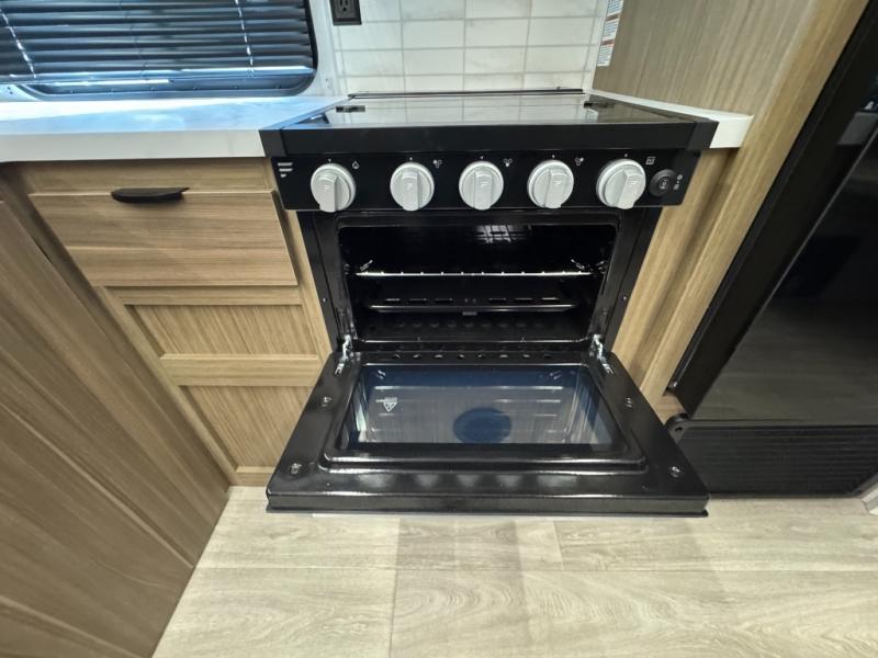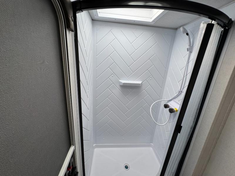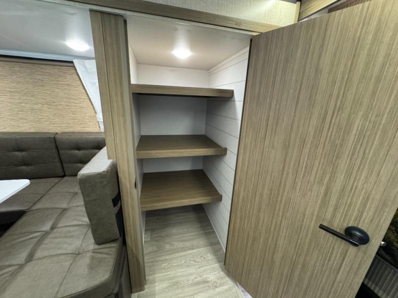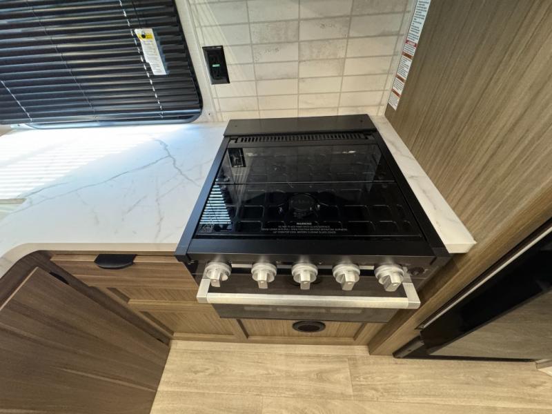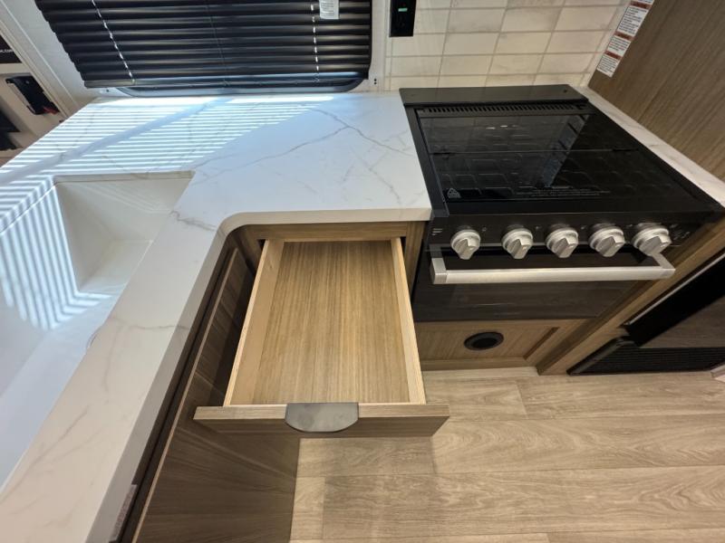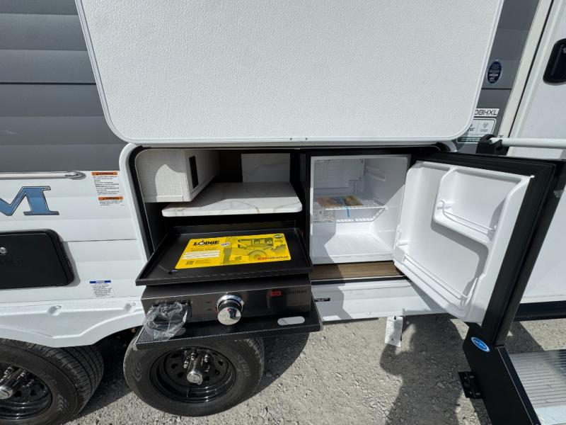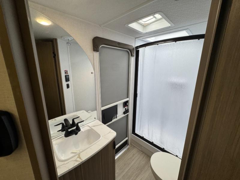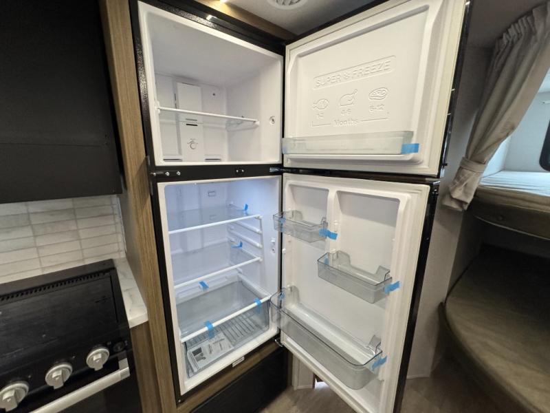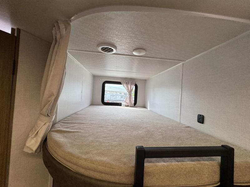 This travel trailer is big enough for the whole family to join in on the fun and weighs in at less than 6,000 lbs.! The kiddos can sleep on the corner 46" 74" double-size bunk beds, and you can sleep on the Versa Tilt custom king bed inside the front private bedroom, plus the U-shaped dinette can transform into an extra sleeping space. It also has a panoramic window for you to look out at your beautiful scenery while you eat. The rear corner bathroom has everything you will need to get squeaky clean each morning, as well as an exit/entrance door to the unit. The oversized refrigerator will keep your perishables fresh and the cooktop is just waiting for you to create a delicious meal. There is also a walk-in pantry for canned goods and an outside kitchen for the cook to enjoy!