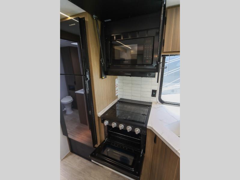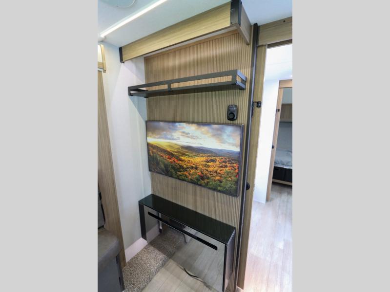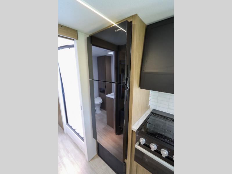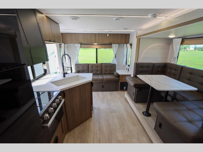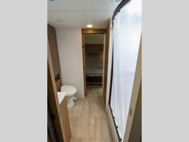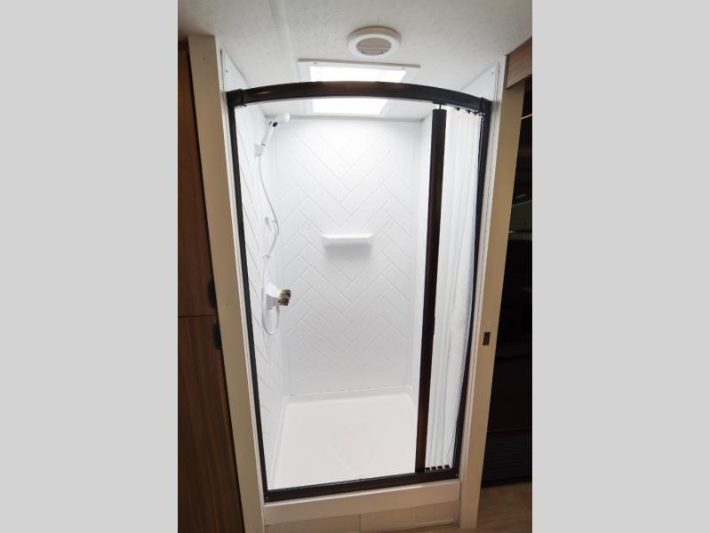 This travel trailer is packed full of features, but is still lightweight coming in at just over 5,000 lbs.! You will feel right at home in the front master bedroom with a custom king bed with Versa Tilt and a closet to keep your clothes tidy. The walk-through bathroom has a walk-in shower with fiberglass surround and a skylight above for added natural lighting as you get ready. The U-shaped dinette slide has a panoramic window for you to enjoy your beautiful scenery as you eat dinner, and there is a fireplace at the entertainment center for a relaxing evening indoors. There is a pass-through storage area to store your outdoor camping gear, and a 16' awning will provide shade as you're visiting outdoors.