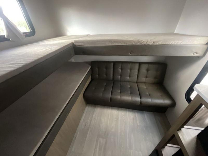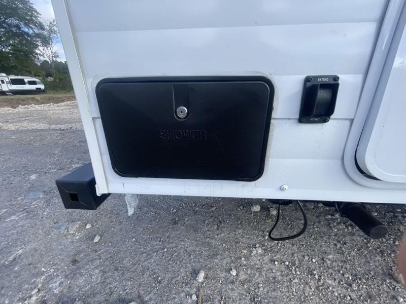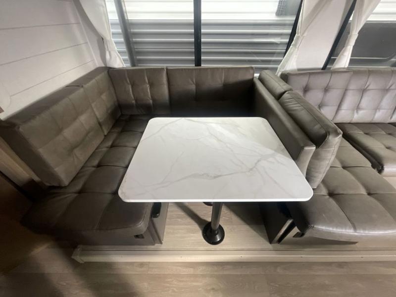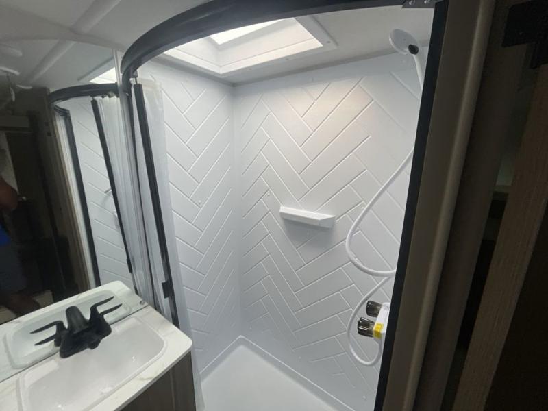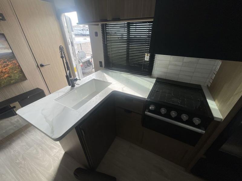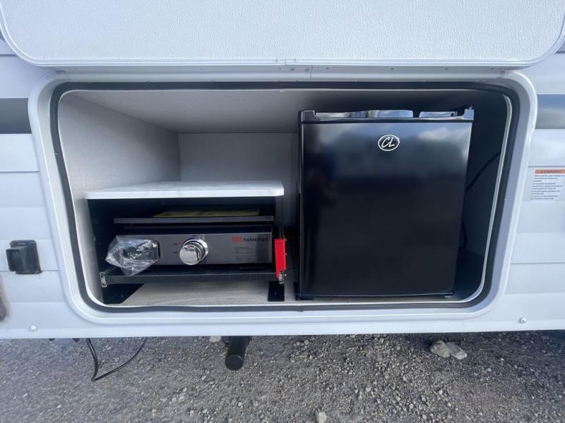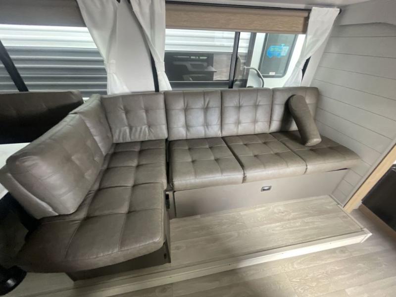 This travel trailer is packed full of features, but is still lightweight coming in at just over 5,000 lbs.! You will feel right at home in the front master bedroom with a custom king bed with Versa Tilt and a closet to keep your clothes tidy. The walk-through bathroom has a walk-in shower with fiberglass surround and a skylight above for added natural lighting as you get ready. The U-shaped dinette slide has a panoramic window for you to enjoy your beautiful scenery as you eat dinner, and there is a fireplace at the entertainment center for a relaxing evening indoors. There is a pass-through storage area to store your outdoor camping gear, and a 16' awning will provide shade as you're visiting outdoors.