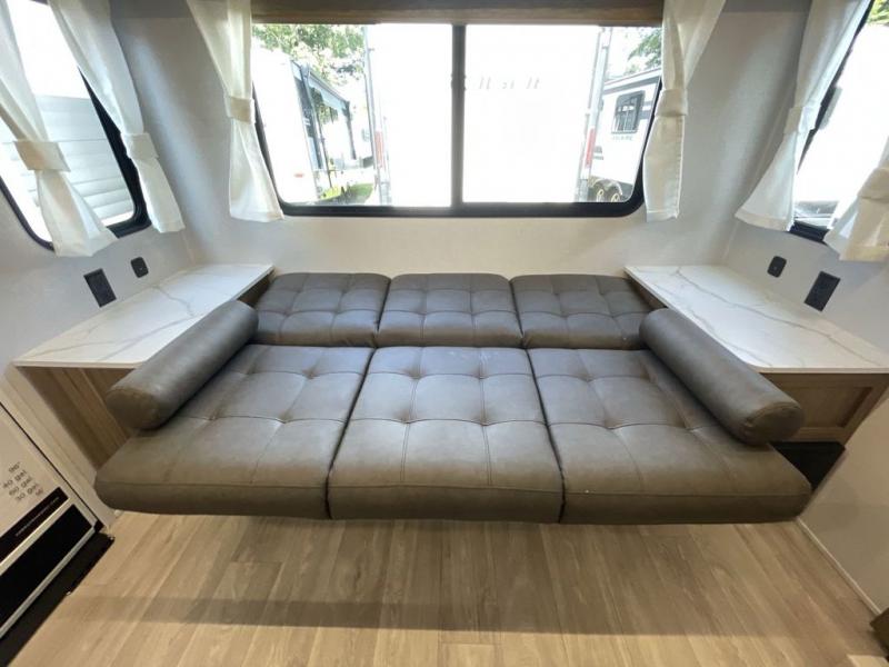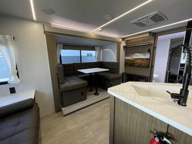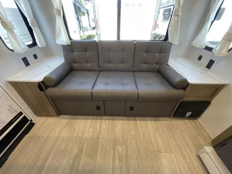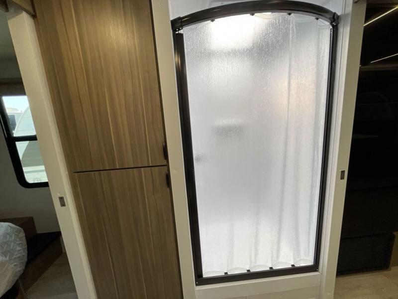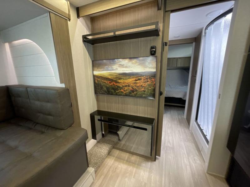 This travel trailer is packed full of features, but is still lightweight coming in at just over 5,000 lbs.! You will feel right at home in the front master bedroom with a custom king bed with Versa Tilt and a closet to keep your clothes tidy. The walk-through bathroom has a walk-in shower with fiberglass surround and a skylight above for added natural lighting as you get ready. The U-shaped dinette slide has a panoramic window for you to enjoy your beautiful scenery as you eat dinner, and there is a fireplace at the entertainment center for a relaxing evening indoors. There is a pass-through storage area to store your outdoor camping gear, and a 16' awning will provide shade as you're visiting outdoors.