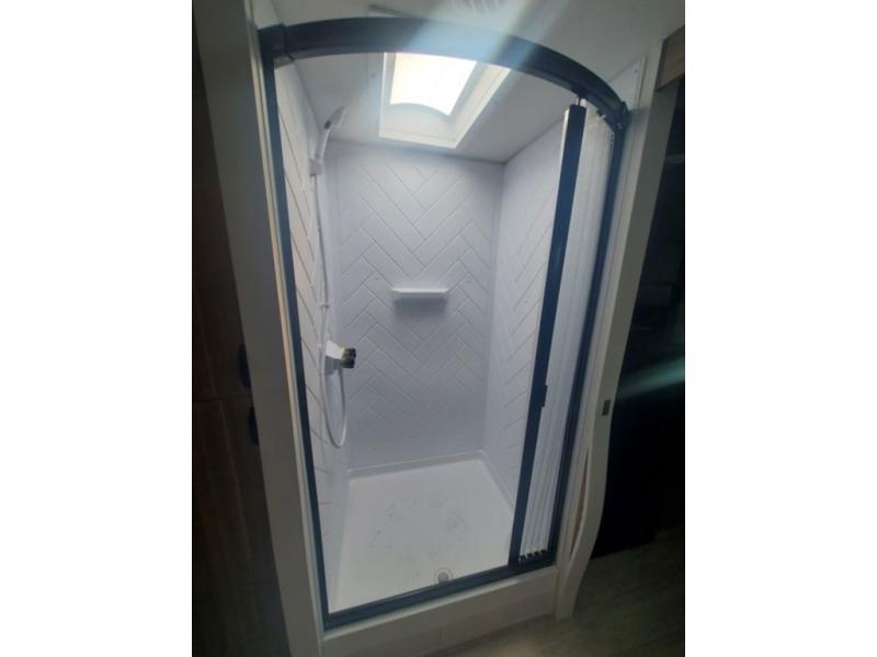 This travel trailer is packed full of features, but is still lightweight coming in at just over 5,000 lbs.! You will feel right at home in the front master bedroom with a custom king bed with Versa Tilt and a closet to keep your clothes tidy. The walk-through bathroom has a walk-in shower with fiberglass surround and a skylight above for added natural lighting as you get ready. The U-shaped dinette slide has a panoramic window for you to enjoy your beautiful scenery as you eat dinner, and there is a fireplace at the entertainment center for a relaxing evening indoors. There is a pass-through storage area to store your outdoor camping gear, and a 16' awning will provide shade as you're visiting outdoors.