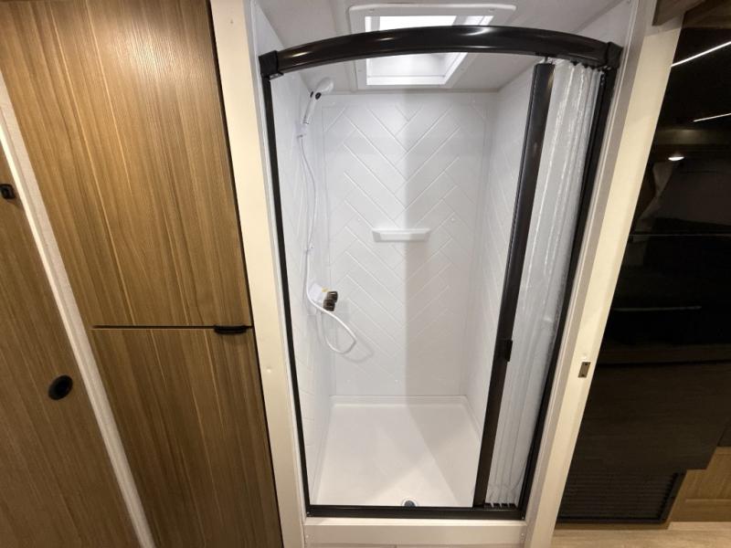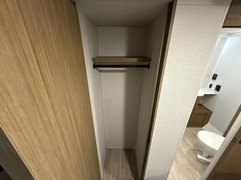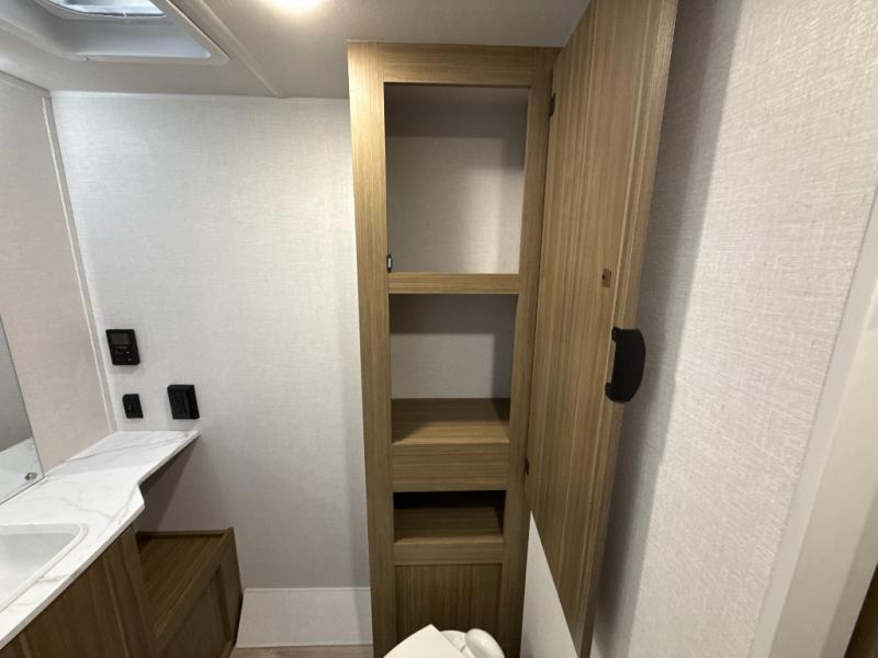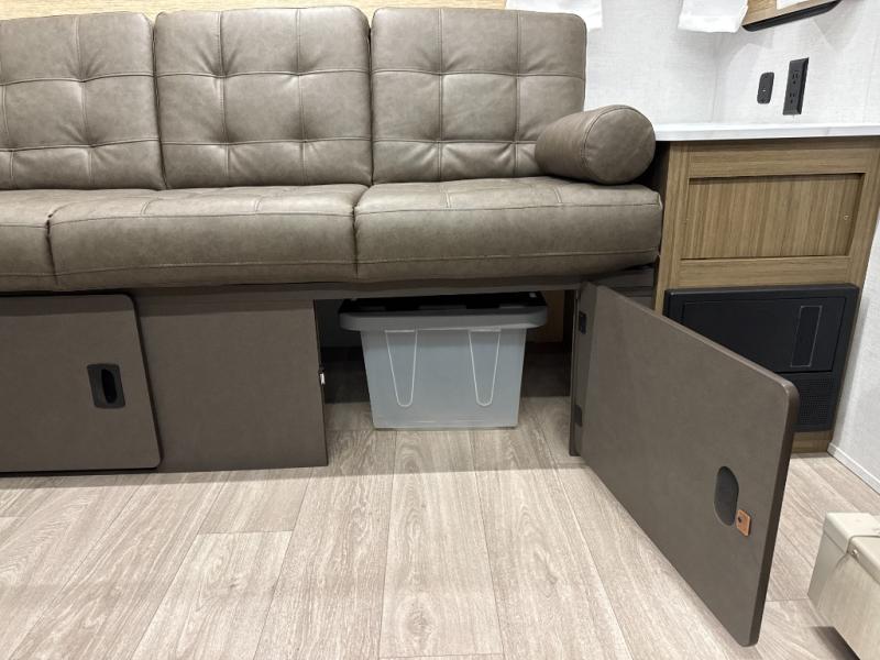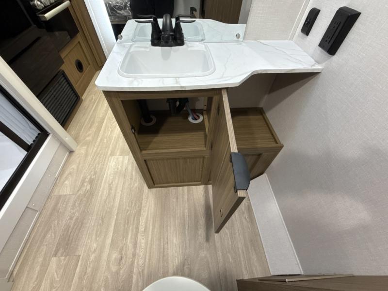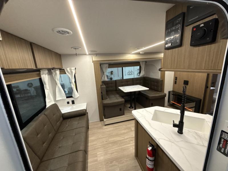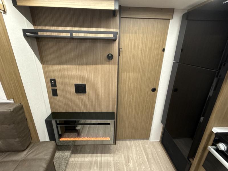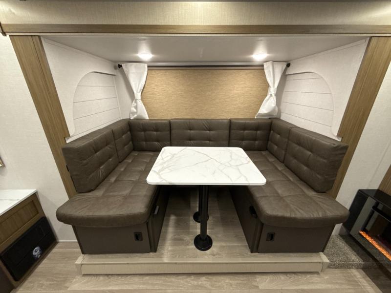 This travel trailer is packed full of features but is still lightweight coming in at just over 5,000 lbs.! You will feel right at home in the front master bedroom with a custom king bed with Versa Tilt and a closet to keep your clothes tidy. The walk-through bathroom has a walk-in shower to easily get ready each day. The U-shaped dinette slide has a panoramic window for you to enjoy your beautiful scenery as you eat dinner, and there is a fireplace at the entertainment center for a relaxing evening indoors. There is a pass-through storage area to store your outdoor camping gear, and a 16' awning will provide shade as you're visiting outdoors.