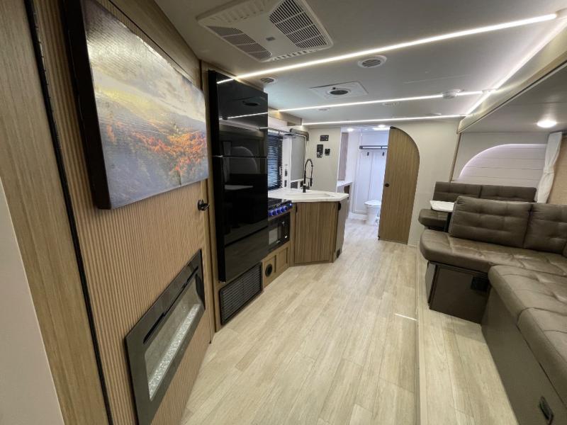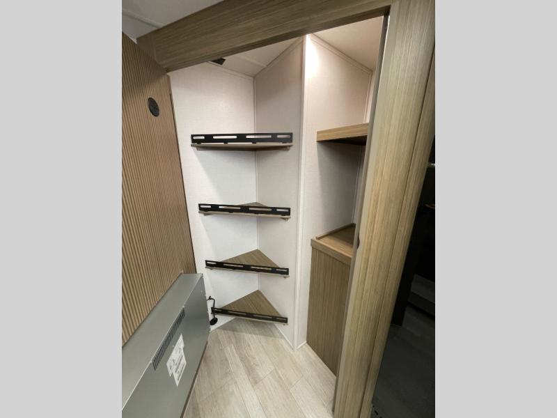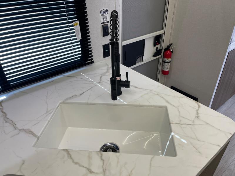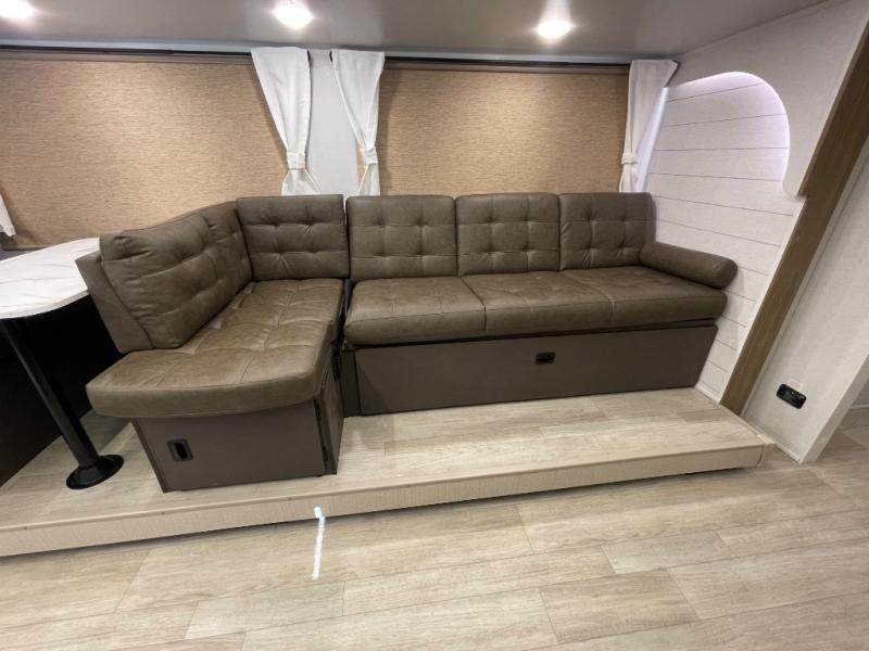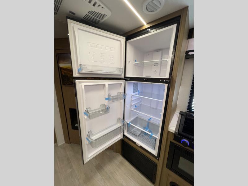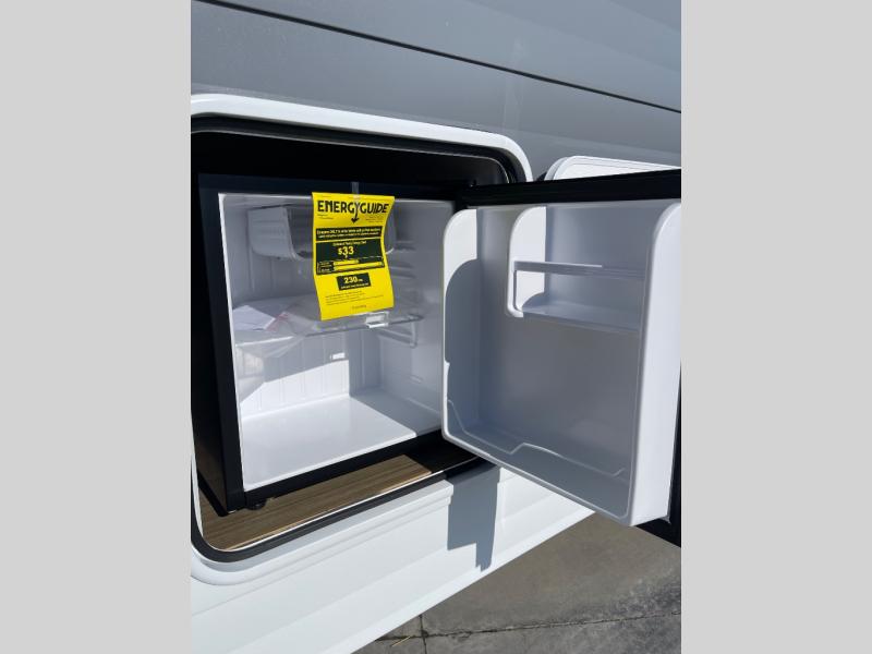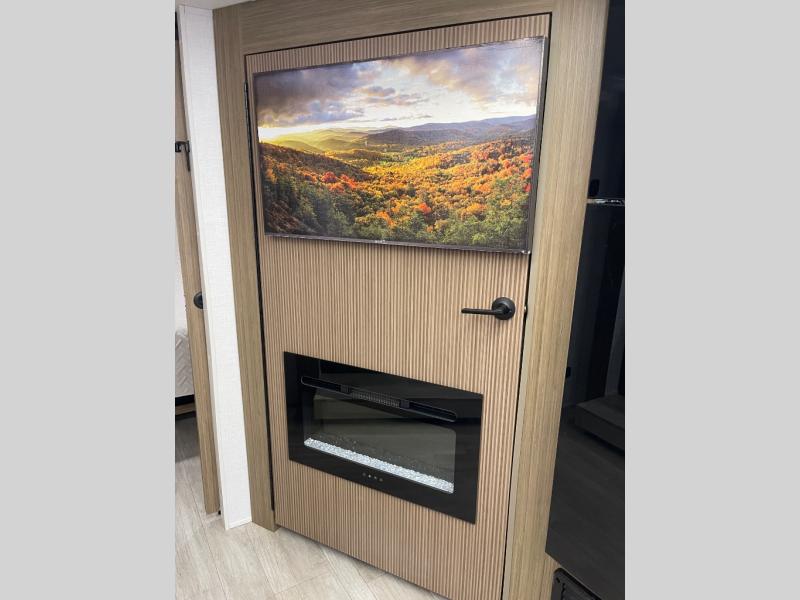 You're sure to make camping memories in this spacious travel trailer! You can sleep four to five people each night thanks to the the custom king bed with Versa Tilt in the front bedroom plus the Versa-Lounge and booth dinette within the large slide out! The full kitchen will let you make meals each day, and you'll appreciate the hidden pantry with shelves behind the fireplace. And don't overlook the full rear bath, complete with a tub/shower and ample counter space for your things.