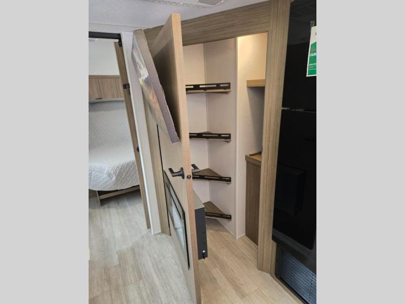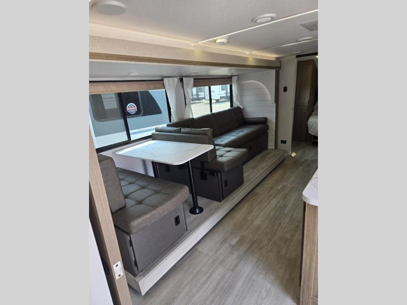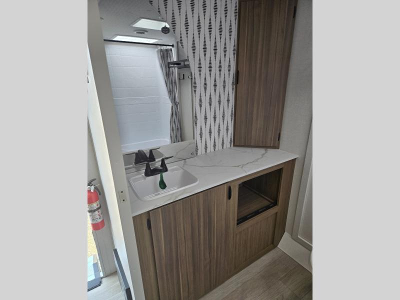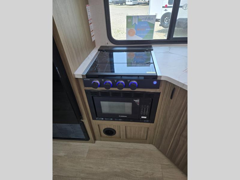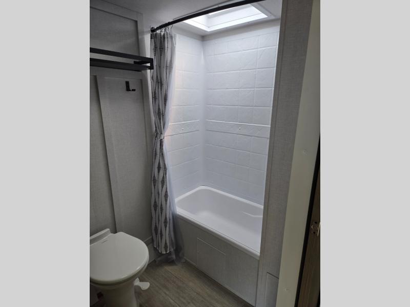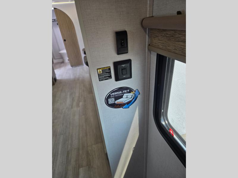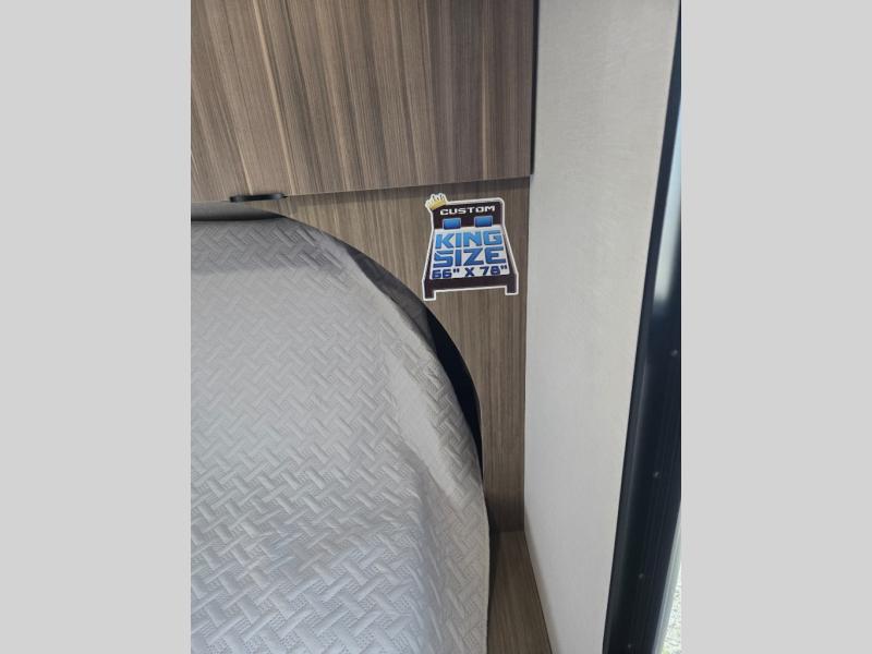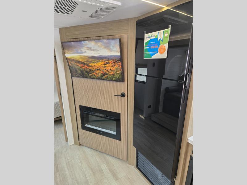 You're sure to make camping memories in this spacious travel trailer! You can sleep four to five people each night thanks to the the custom king bed with Versa Tilt in the front bedroom plus the Versa-Lounge and booth dinette within the large slide out! The full kitchen will let you make meals each day, and you'll appreciate the hidden pantry with shelves behind the fireplace. And don't overlook the full rear bath, complete with a tub/shower and ample counter space for your things.