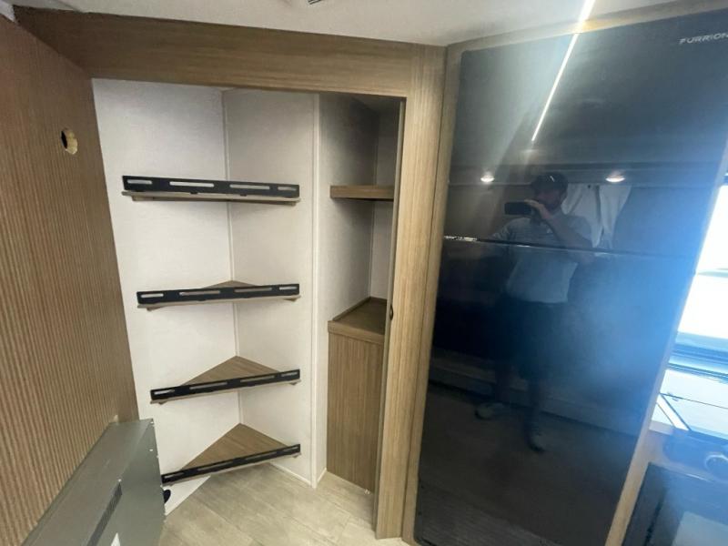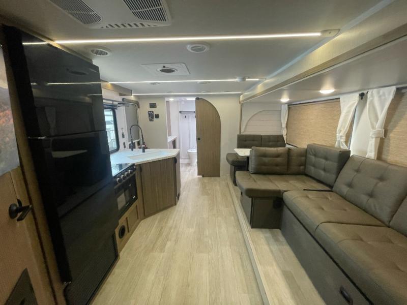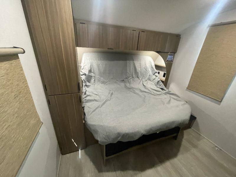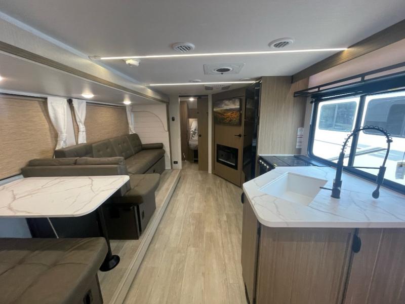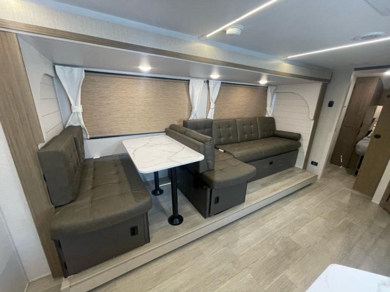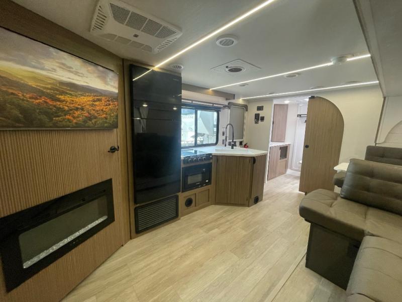 You're sure to make camping memories in this spacious travel trailer! You can sleep four to five people each night thanks to the the custom king bed with Versa Tilt in the front bedroom plus the Versa-Lounge and booth dinette within the large slide out! The full kitchen will let you make meals each day, and you'll appreciate the hidden pantry with shelves behind the fireplace. And don't overlook the full rear bath, complete with a tub/shower and ample counter space for your things.