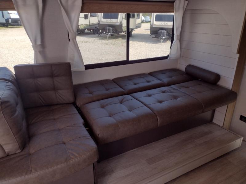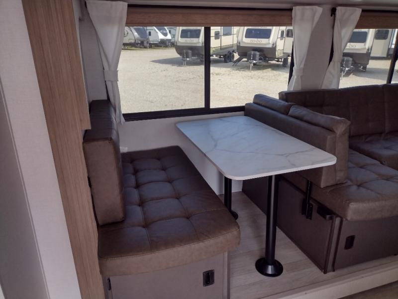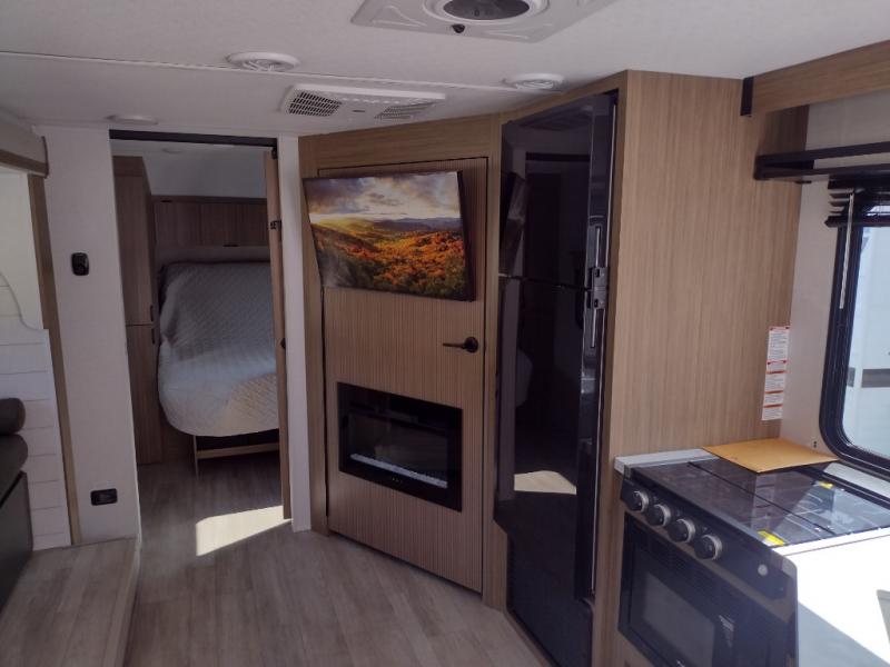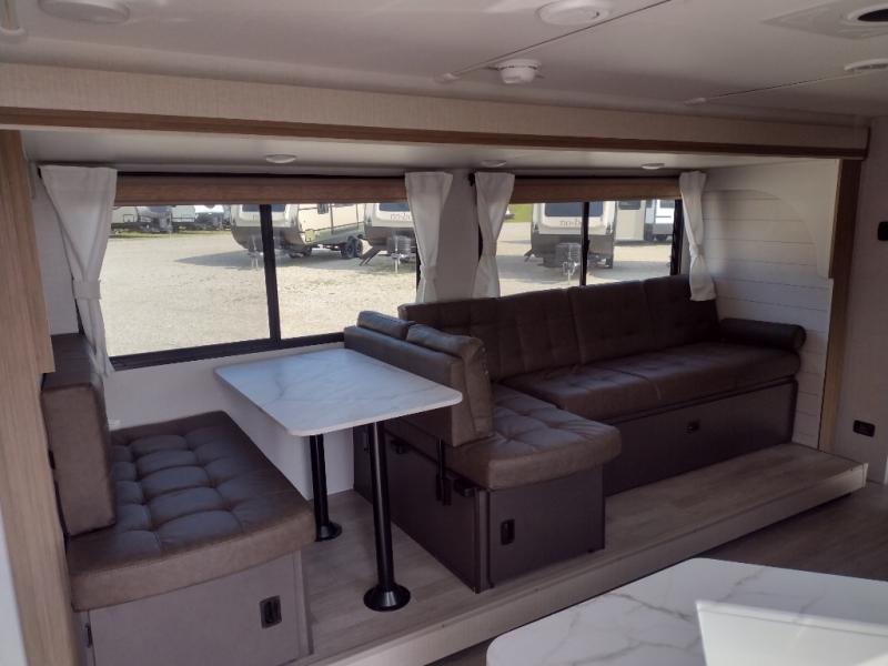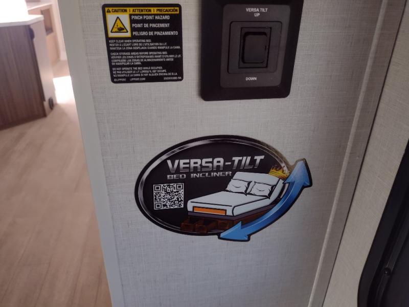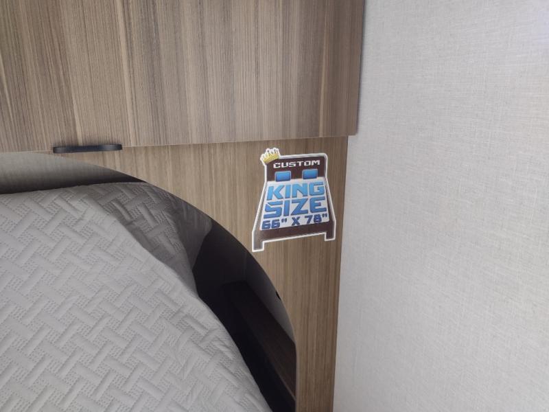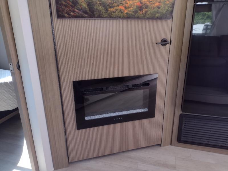 You're sure to make camping memories in this spacious travel trailer! You can sleep four to five people each night thanks to the the custom king bed with Versa Tilt in the front bedroom plus the Versa-Lounge and booth dinette within the large slide out! The full kitchen will let you make meals each day, and you'll appreciate the hidden pantry with shelves behind the fireplace. And don't overlook the full rear bath, complete with a tub/shower and ample counter space for your things.