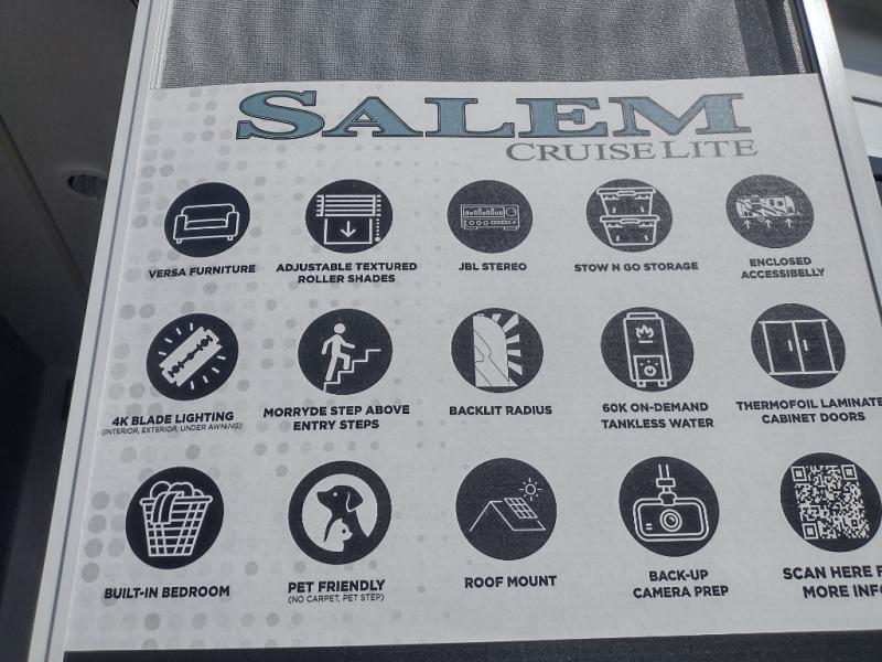 The Salem Cruise Lite travel trailers and toy haulers are value-minded units packed with great camping features! There are a variety of floorplans to choose from between two different regions. The enclosed Accessibelly will help protect against the elements and debris during transport, and the exterior retro/metal redesign is sure to be eye-catching! There are stylish roller shades inside, along with updated backsplash, elegant curtain rods and curtains, plus many more interior comforts! Choose a Salem Cruise Lite today for quality and value!