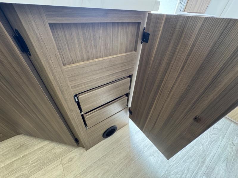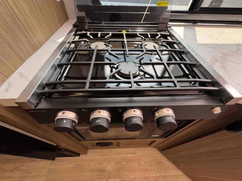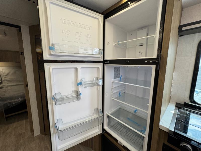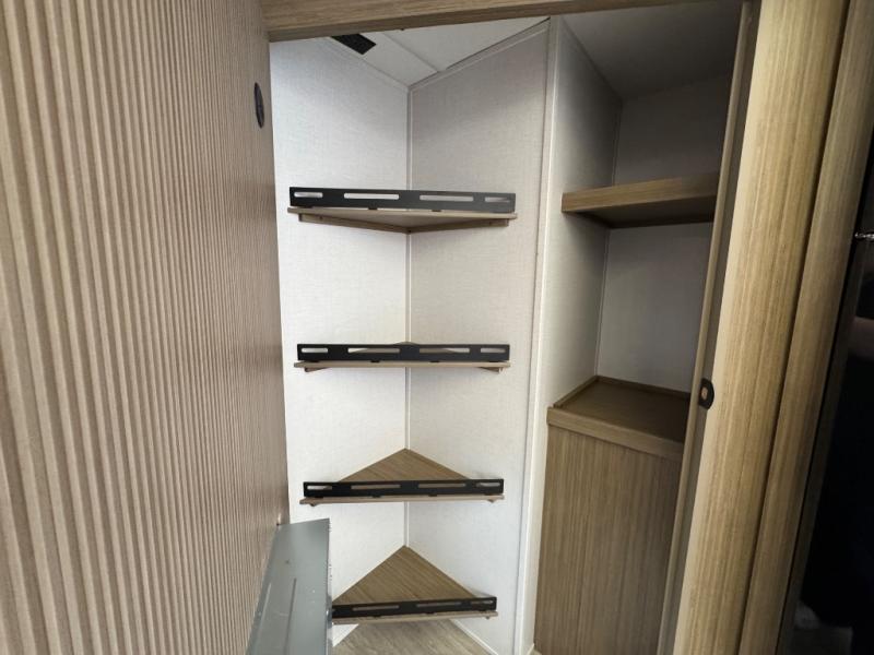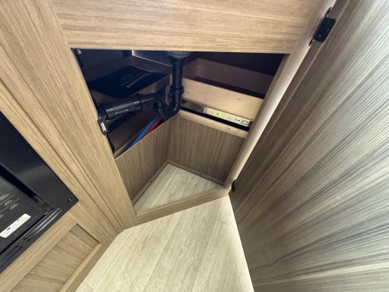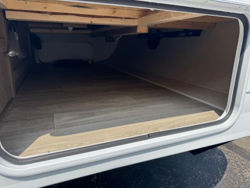 You're sure to make camping memories in this spacious travel trailer! You can sleep four to five people each night thanks to the the custom king bed with Versa Tilt in the front bedroom plus the Versa-Lounge and booth dinette within the large slide out! The full kitchen will let you make meals each day, and you'll appreciate the hidden pantry with shelves behind the fireplace. And don't overlook the full rear bath, complete with a tub/shower and ample counter space for your things.