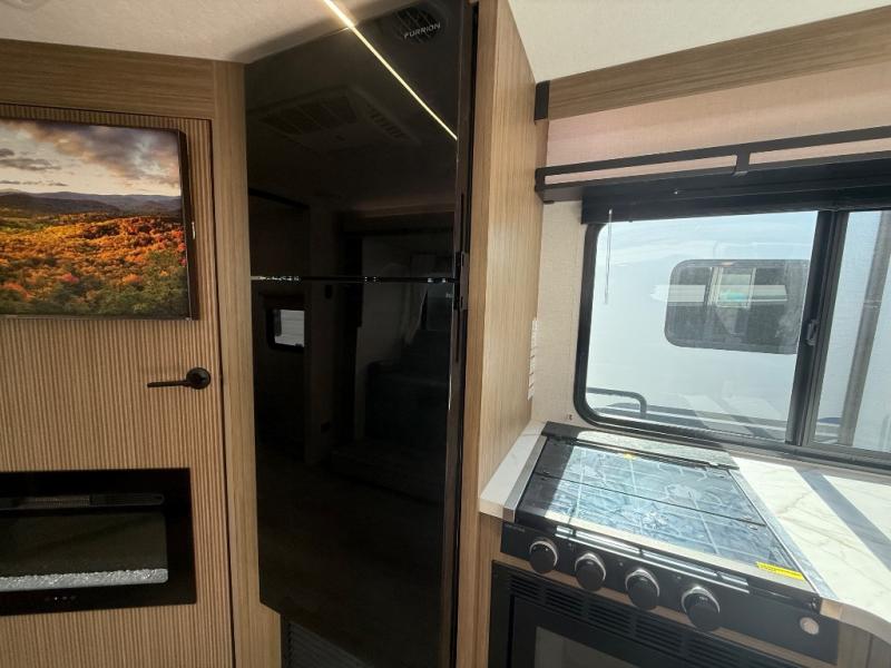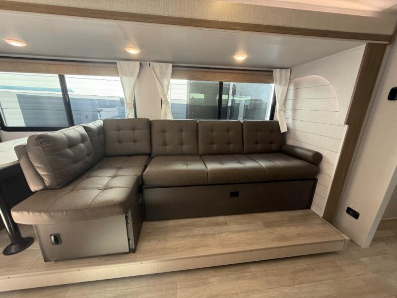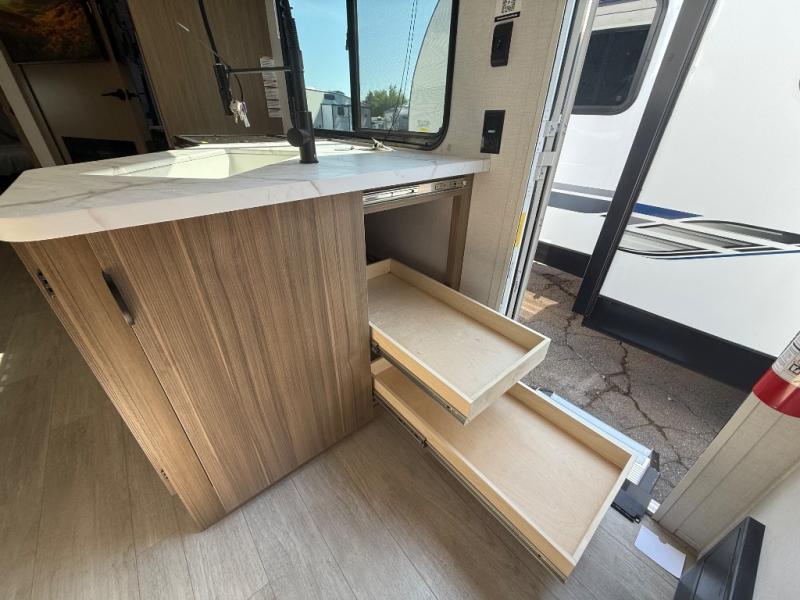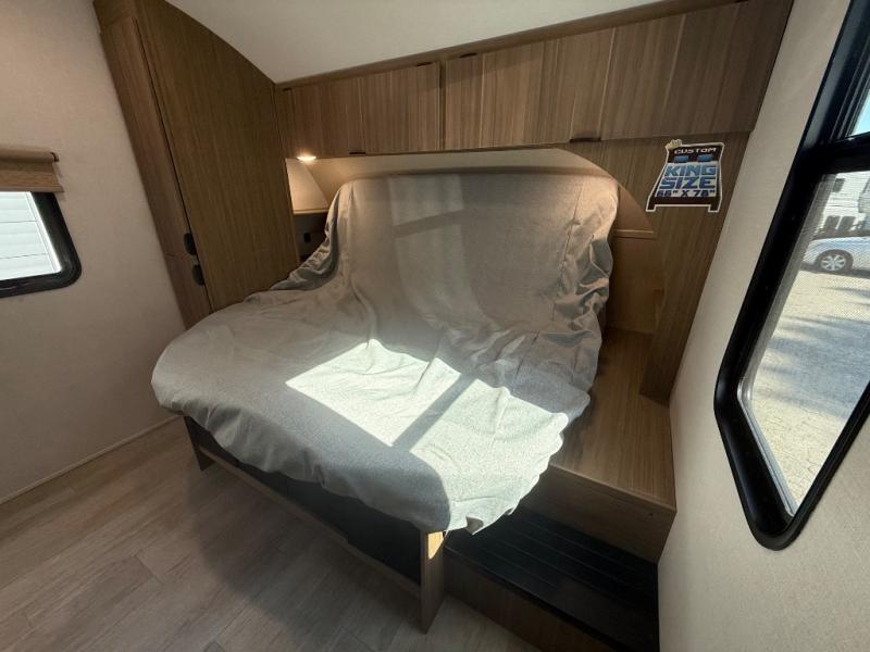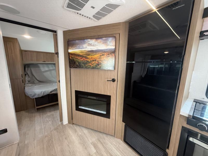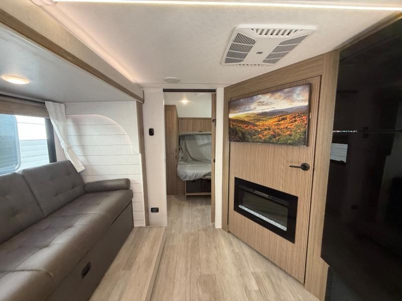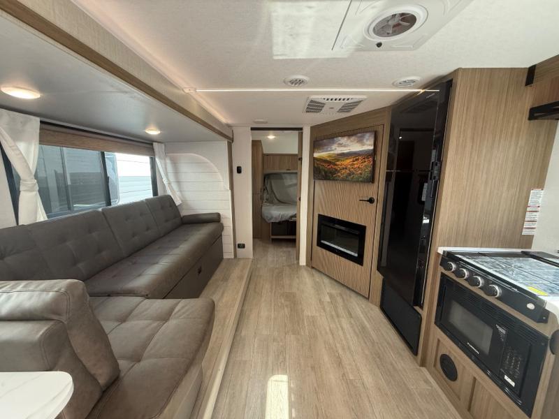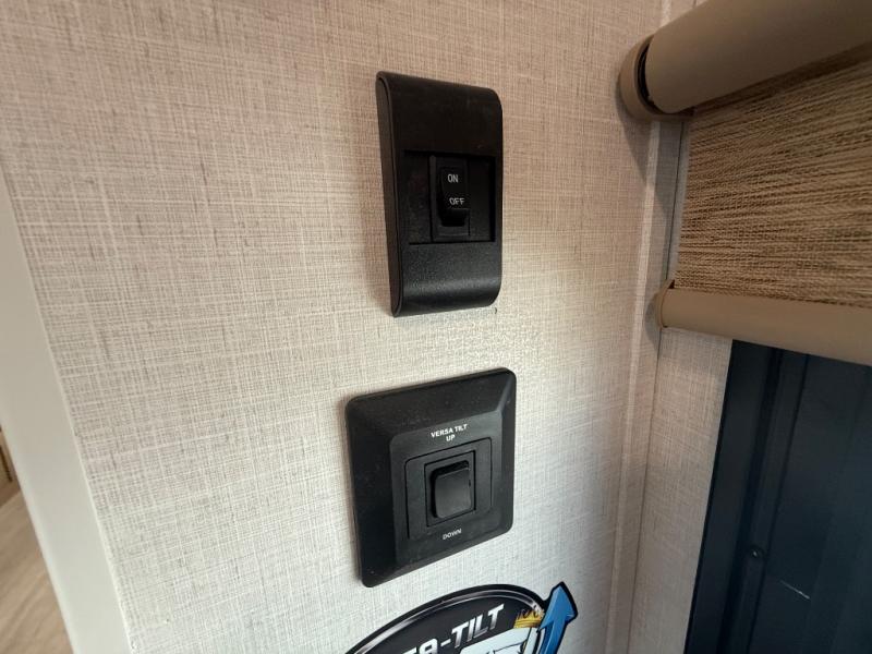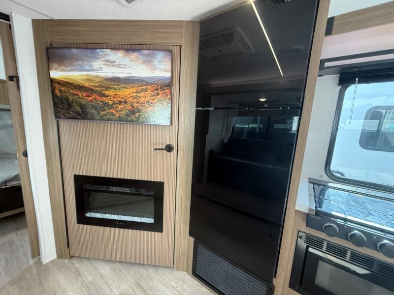 You're sure to make camping memories in this spacious travel trailer! You can sleep four to five people each night thanks to the the custom king bed with Versa Tilt in the front bedroom plus the Versa-Lounge and booth dinette within the large slide out! The full kitchen will let you make meals each day, and you'll appreciate the hidden pantry with shelves behind the fireplace. And don't overlook the full rear bath, complete with a tub/shower and ample counter space for your things.