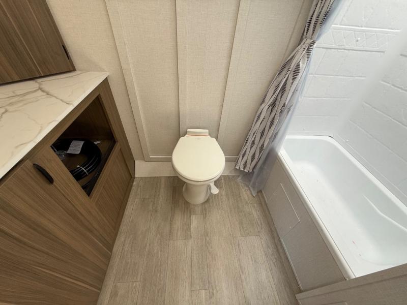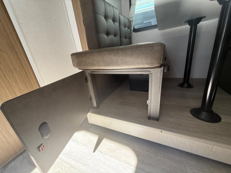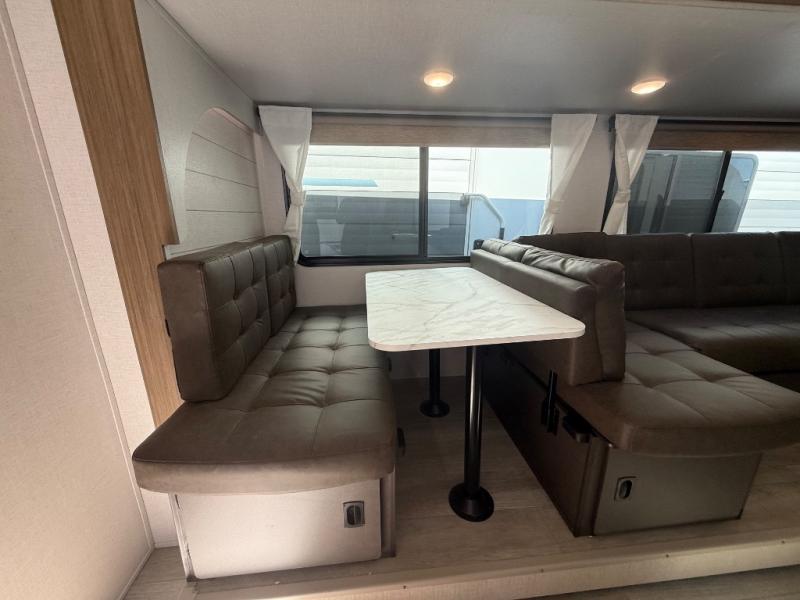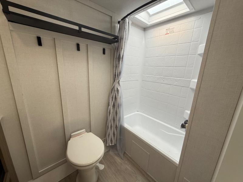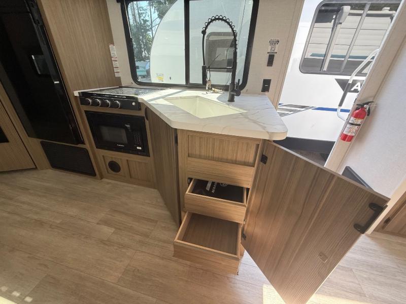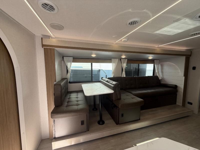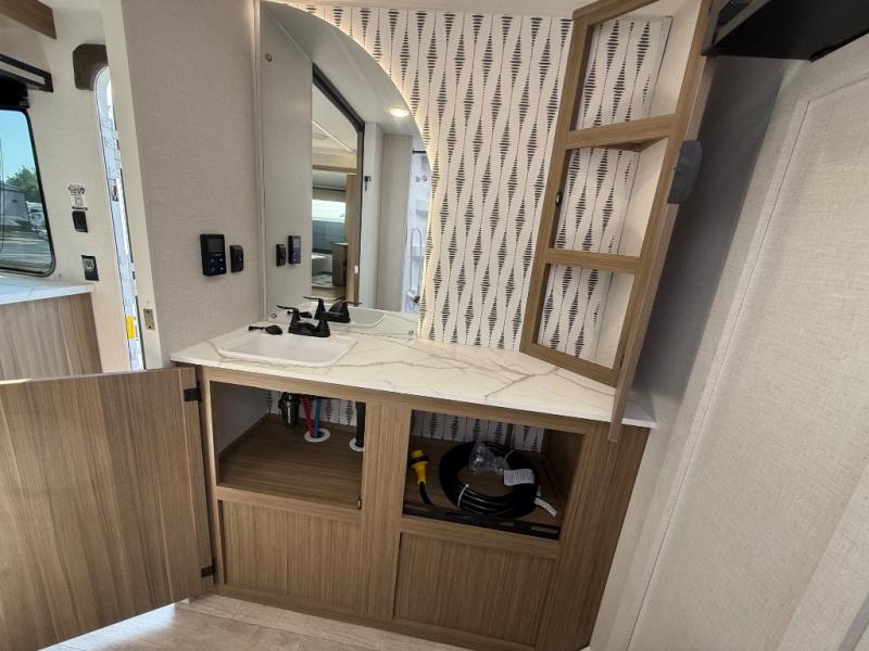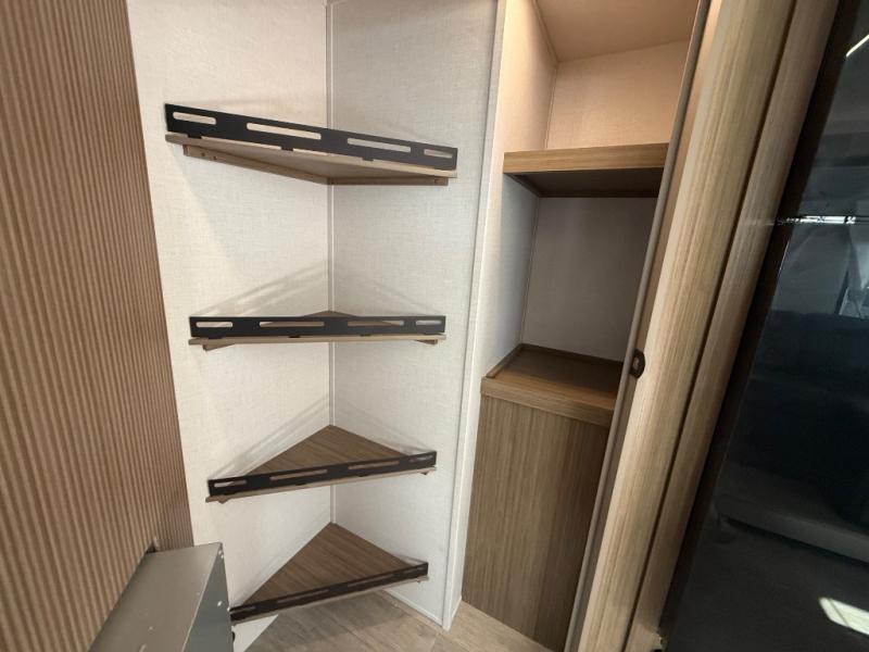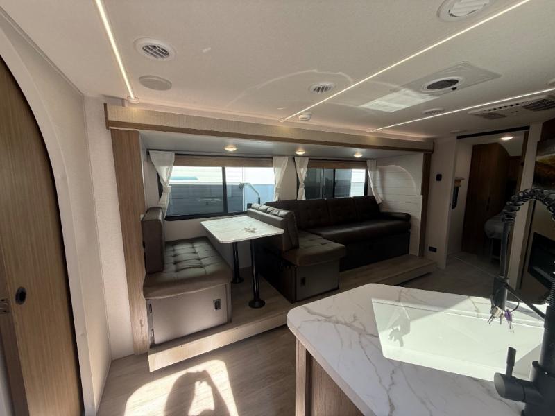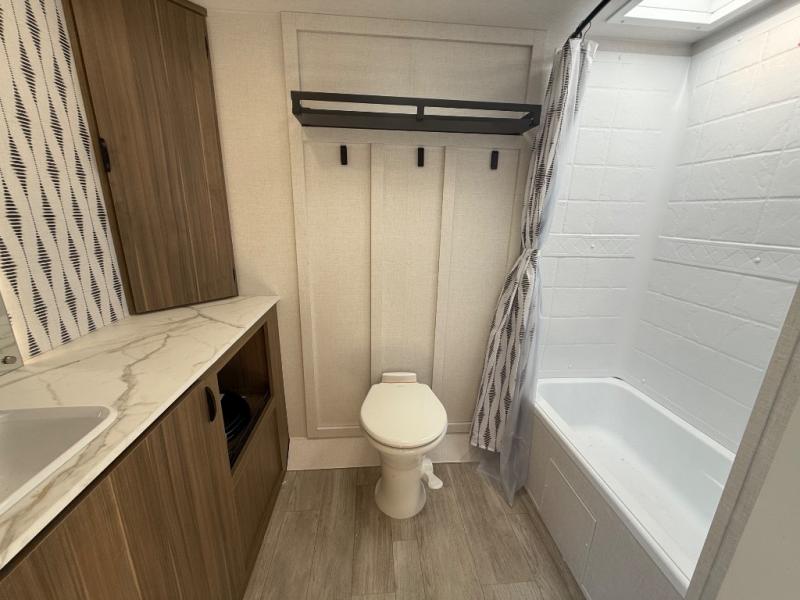 You're sure to make camping memories in this spacious travel trailer! You can sleep four to five people each night thanks to the the custom king bed with Versa Tilt in the front bedroom plus the Versa-Lounge and booth dinette within the large slide out! The full kitchen will let you make meals each day, and you'll appreciate the hidden pantry with shelves behind the fireplace. And don't overlook the full rear bath, complete with a tub/shower and ample counter space for your things.