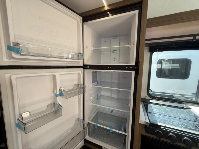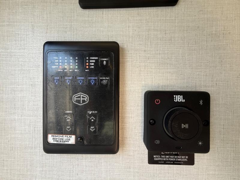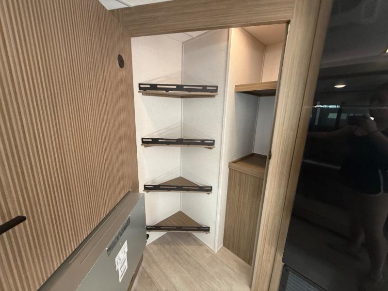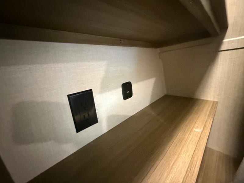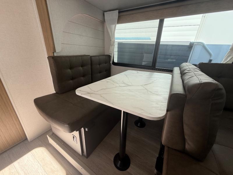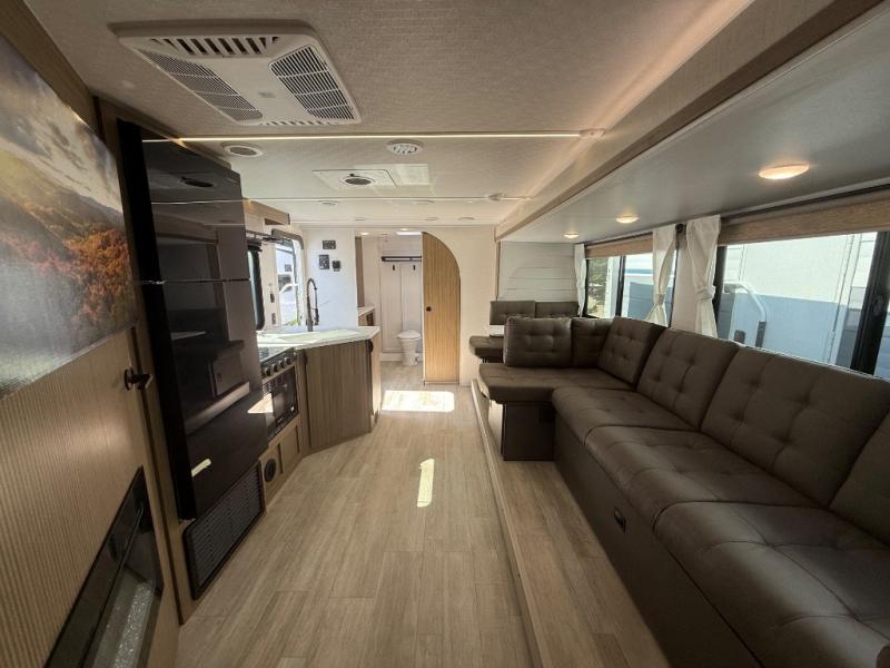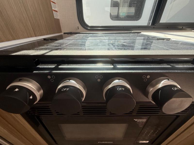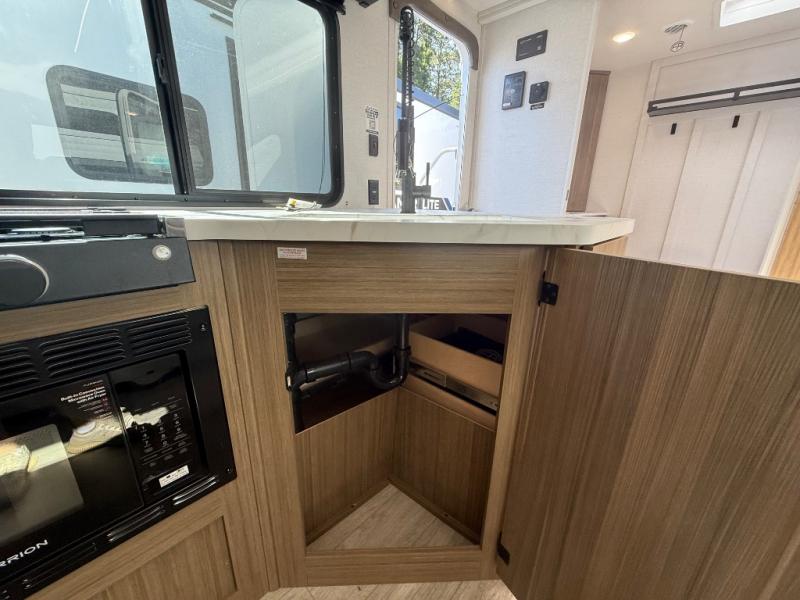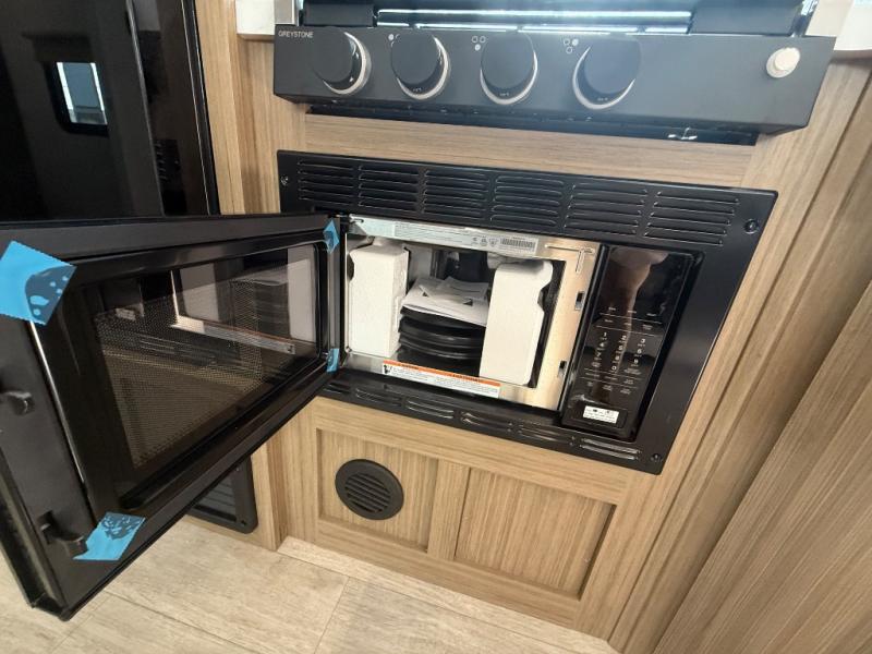 You're sure to make camping memories in this spacious travel trailer! You can sleep four to five people each night thanks to the the custom king bed with Versa Tilt in the front bedroom plus the Versa-Lounge and booth dinette within the large slide out! The full kitchen will let you make meals each day, and you'll appreciate the hidden pantry with shelves behind the fireplace. And don't overlook the full rear bath, complete with a tub/shower and ample counter space for your things.