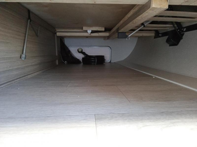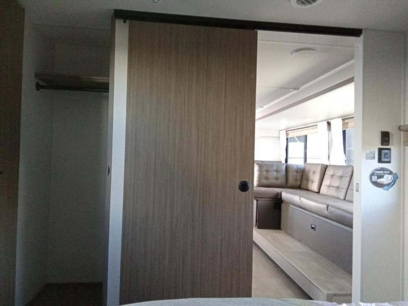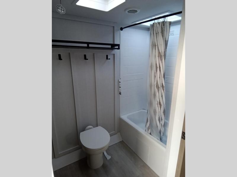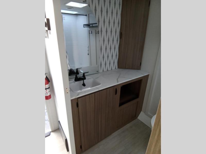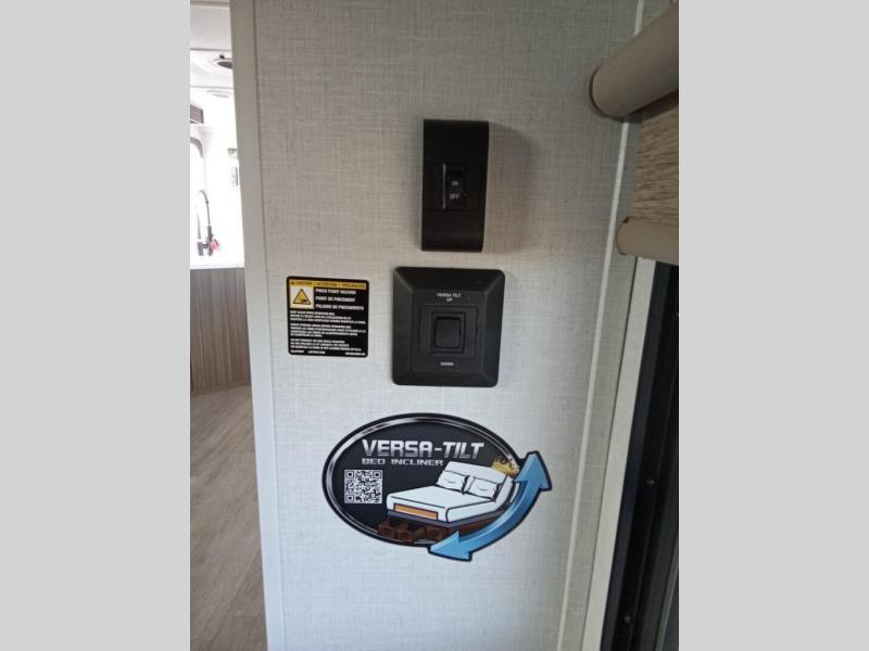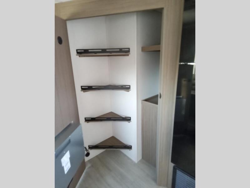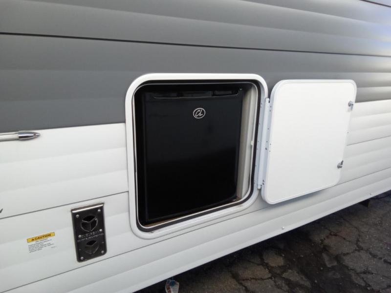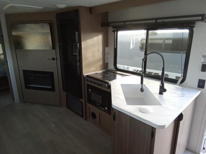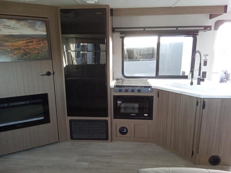 You're sure to make camping memories in this spacious travel trailer! You can sleep four to five people each night thanks to the the custom king bed with Versa Tilt in the front bedroom plus the Versa-Lounge and booth dinette within the large slide out! The full kitchen will let you make meals each day, and you'll appreciate the hidden pantry with shelves behind the fireplace. And don't overlook the full rear bath, complete with a tub/shower and ample counter space for your things.