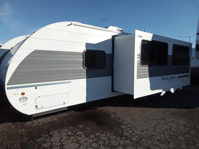 The Salem Cruise Lite travel trailers and toy haulers are value-minded units packed with great camping features! There are a variety of floorplans to choose from between two different regions. The enclosed Accessibelly will help protect against the elements and debris during transport, and the exterior retro/metal redesign is sure to be eye-catching! There are stylish roller shades inside, along with updated backsplash, elegant curtain rods and curtains, plus many more interior comforts! Choose a Salem Cruise Lite today for quality and value!