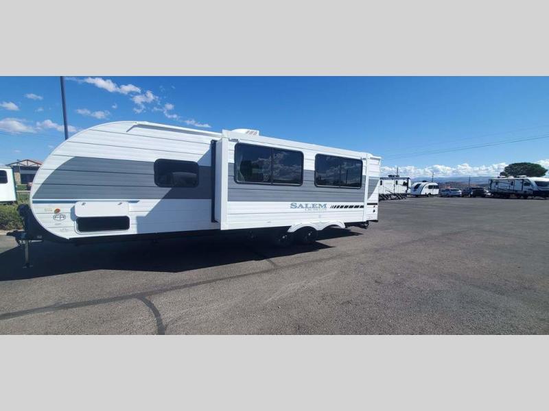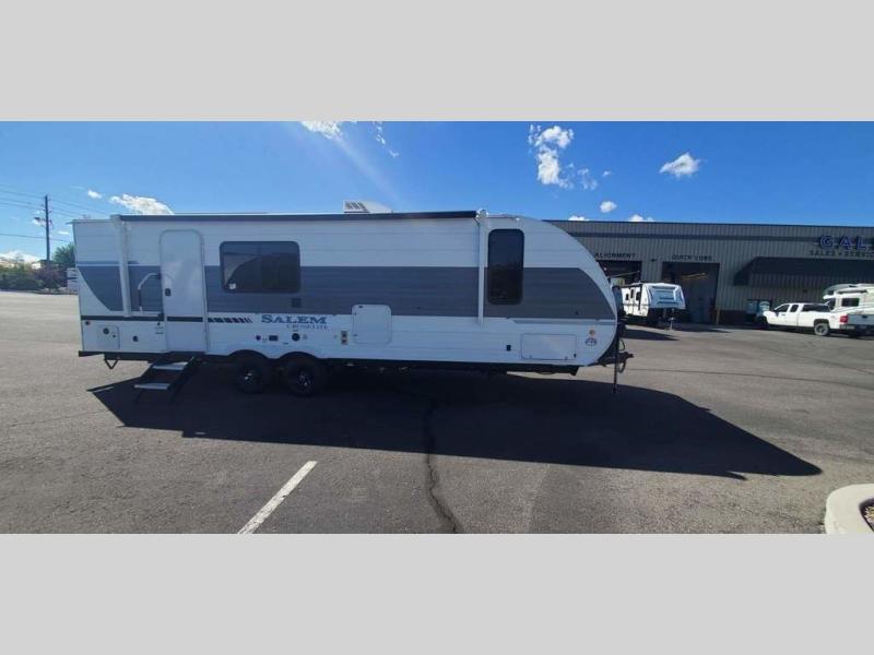 The Salem Cruise Lite travel trailers and toy haulers are value-minded units packed with great camping features! There are a variety of floorplans to choose from between two different regions. The enclosed Accessibelly will help protect against the elements and debris during transport, and the exterior retro/metal redesign is sure to be eye-catching! There are stylish roller shades inside, along with updated backsplash, elegant curtain rods and curtains, plus many more interior comforts! Choose a Salem Cruise Lite today for quality and value!