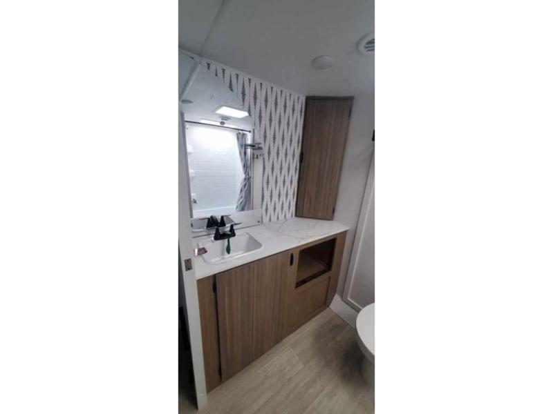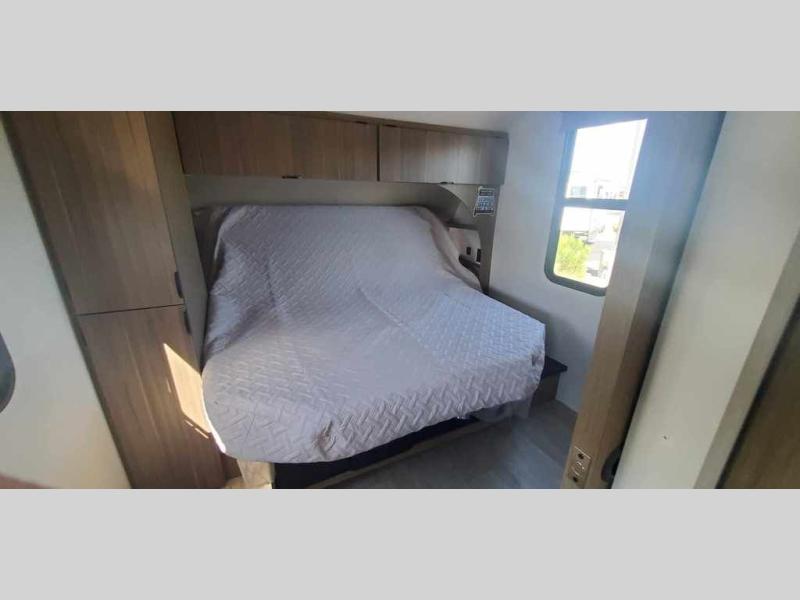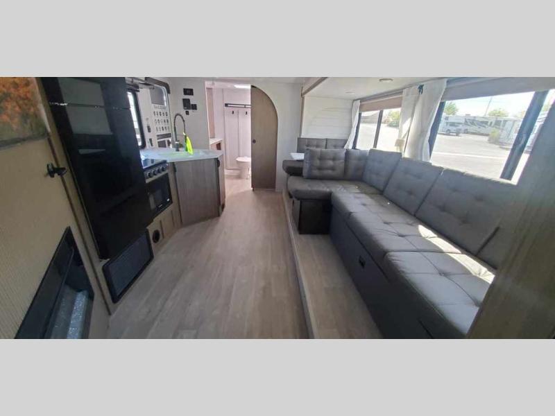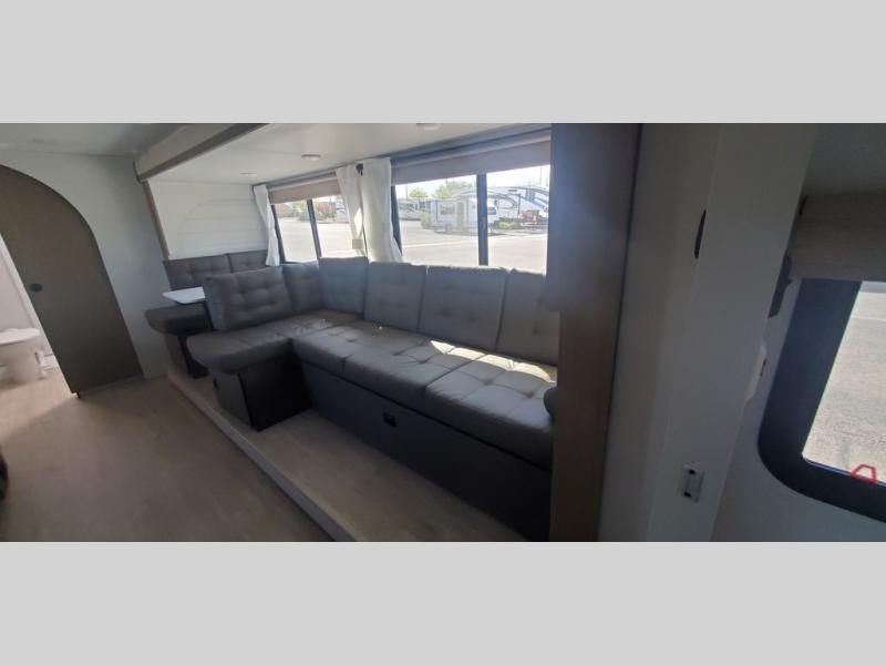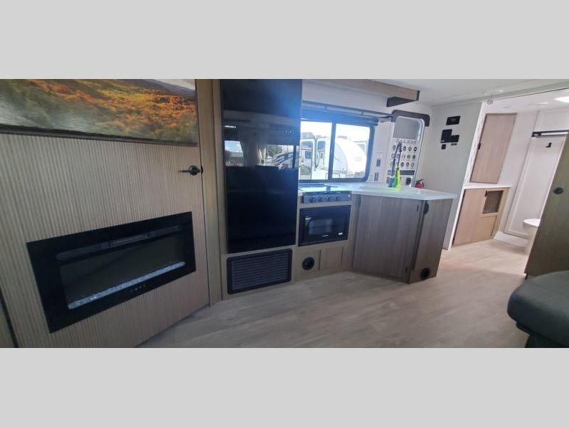 You're sure to make camping memories in this spacious travel trailer! You can sleep four to five people each night thanks to the the custom king bed with Versa Tilt in the front bedroom plus the Versa-Lounge and booth dinette within the large slide out! The full kitchen will let you make meals each day, and you'll appreciate the hidden pantry with shelves behind the fireplace. And don't overlook the full rear bath, complete with a tub/shower and ample counter space for your things.