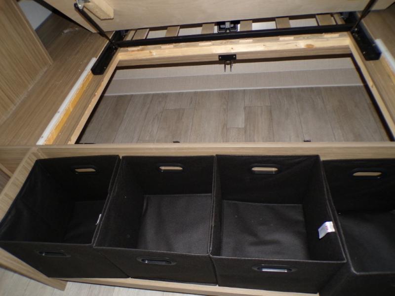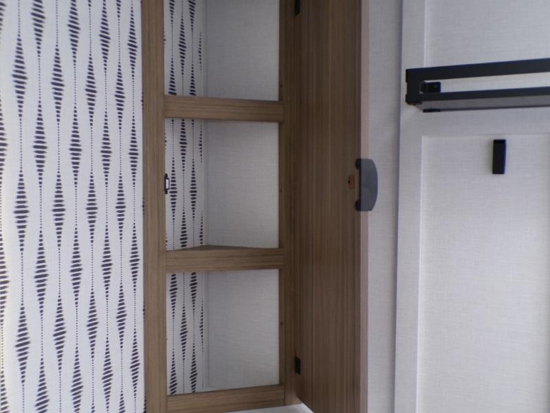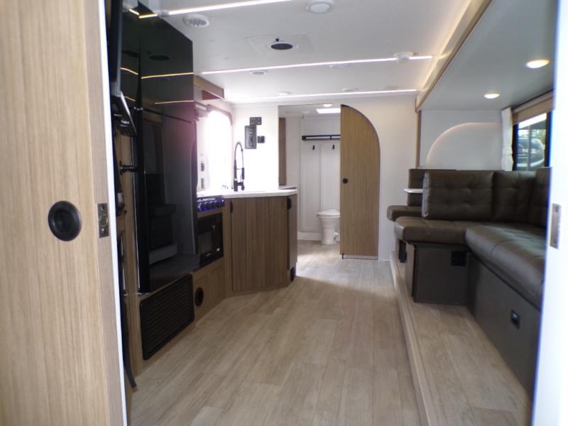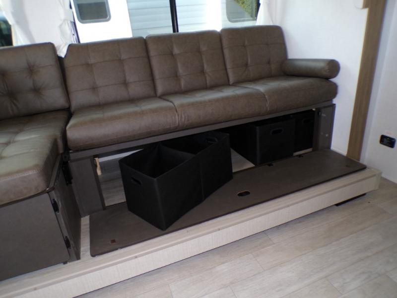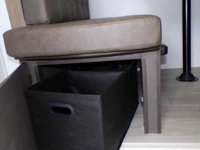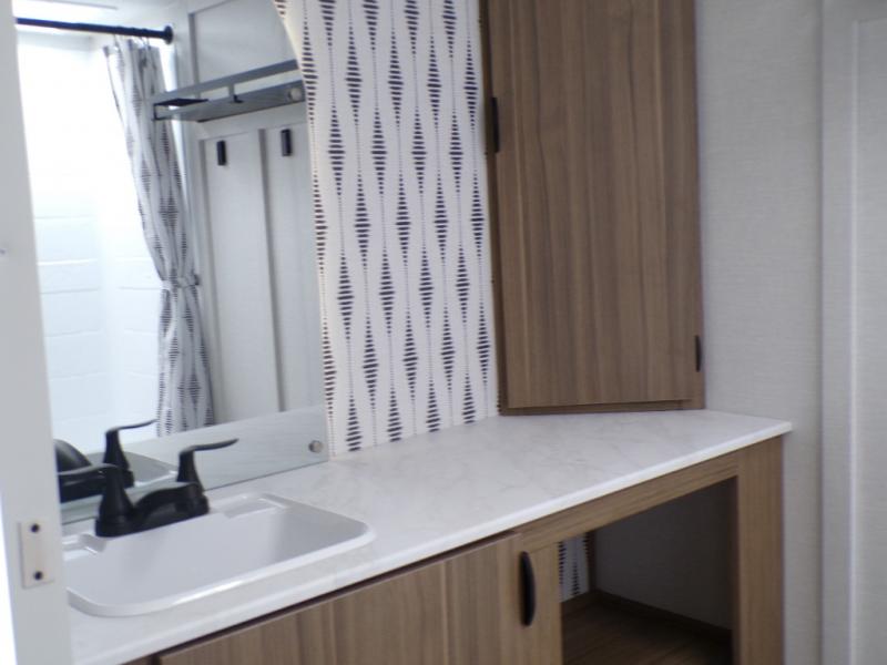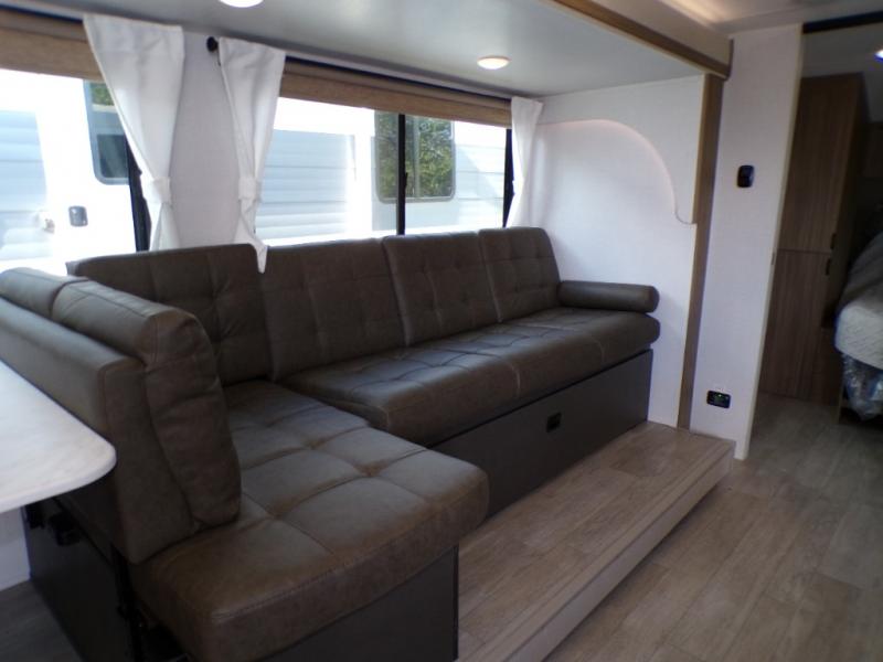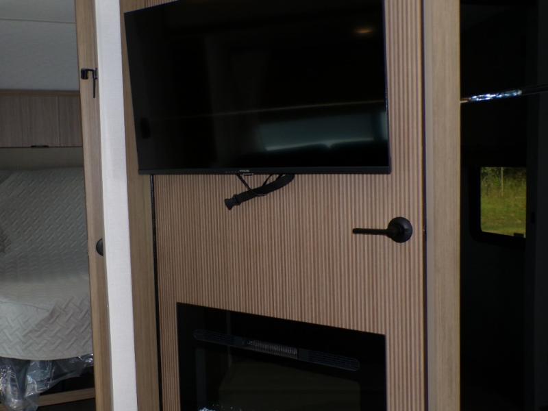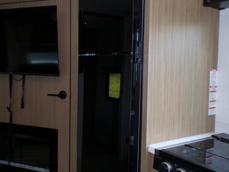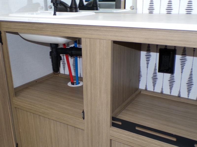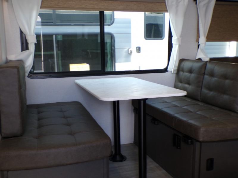 You're sure to make camping memories in this spacious travel trailer! You can sleep four to five people each night thanks to the the custom king bed with Versa Tilt in the front bedroom plus the Versa-Lounge and booth dinette within the large slide out! The full kitchen will let you make meals each day, and you'll appreciate the hidden pantry with shelves behind the fireplace. And don't overlook the full rear bath, complete with a tub/shower and ample counter space for your things.