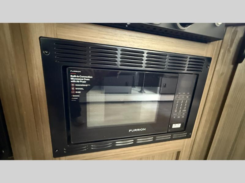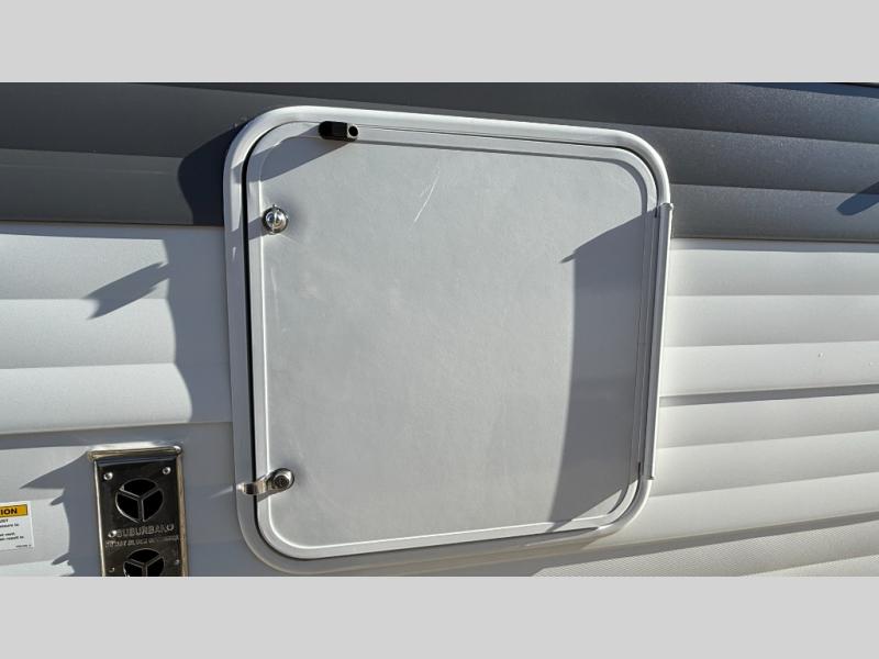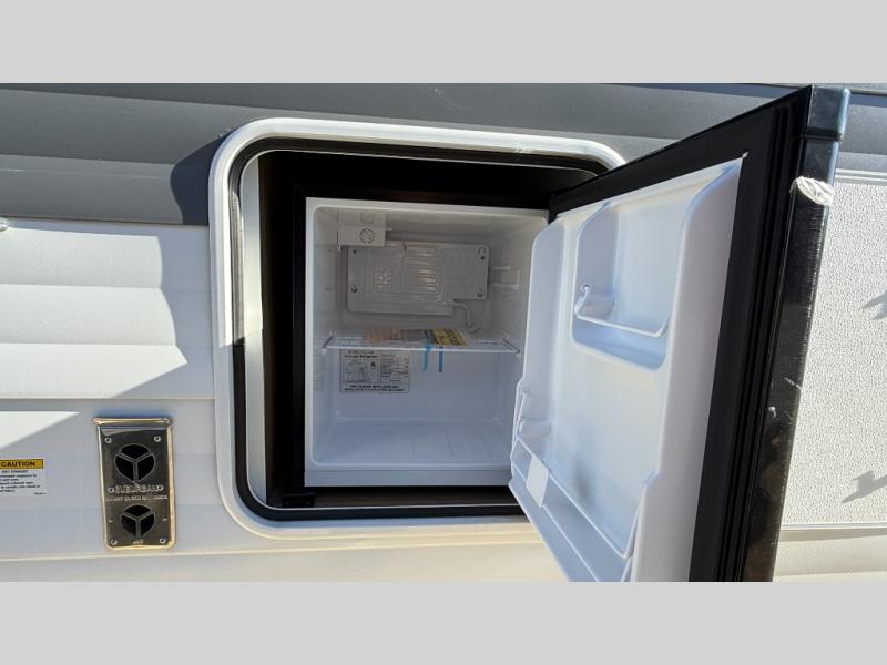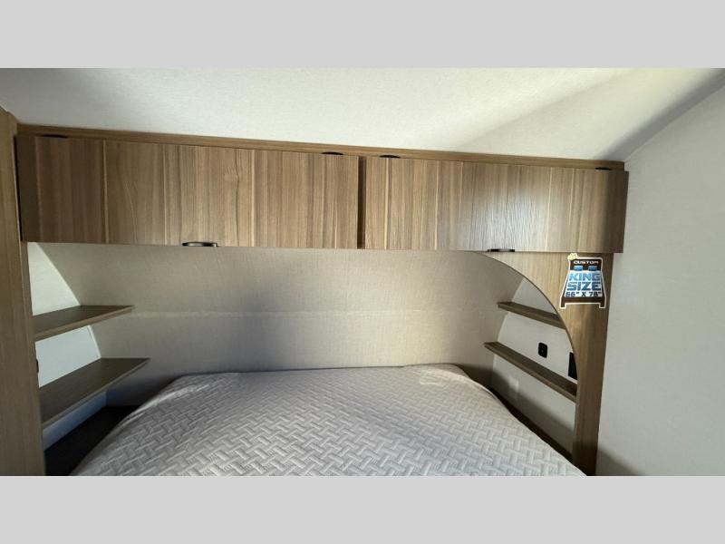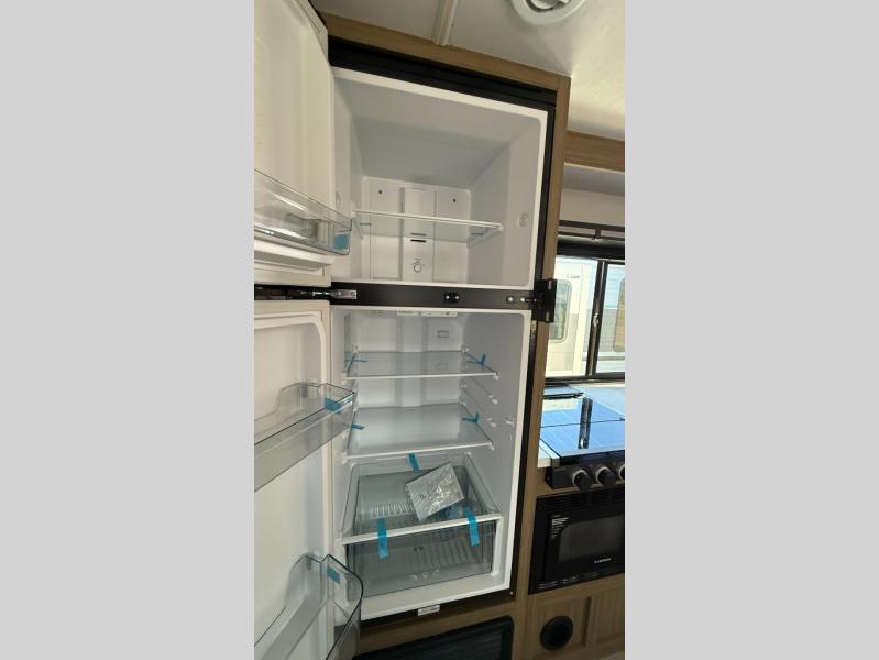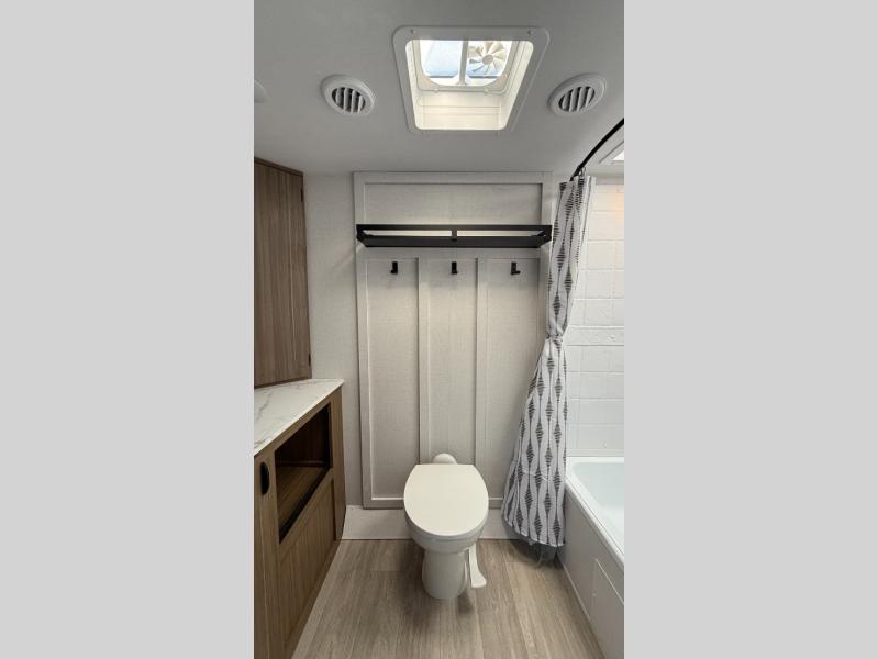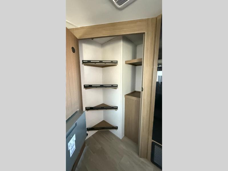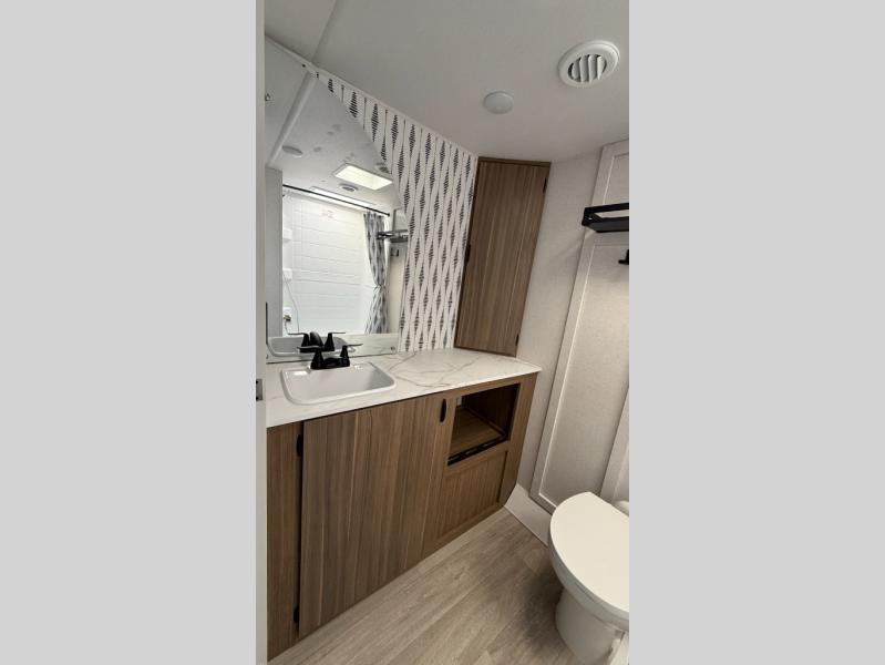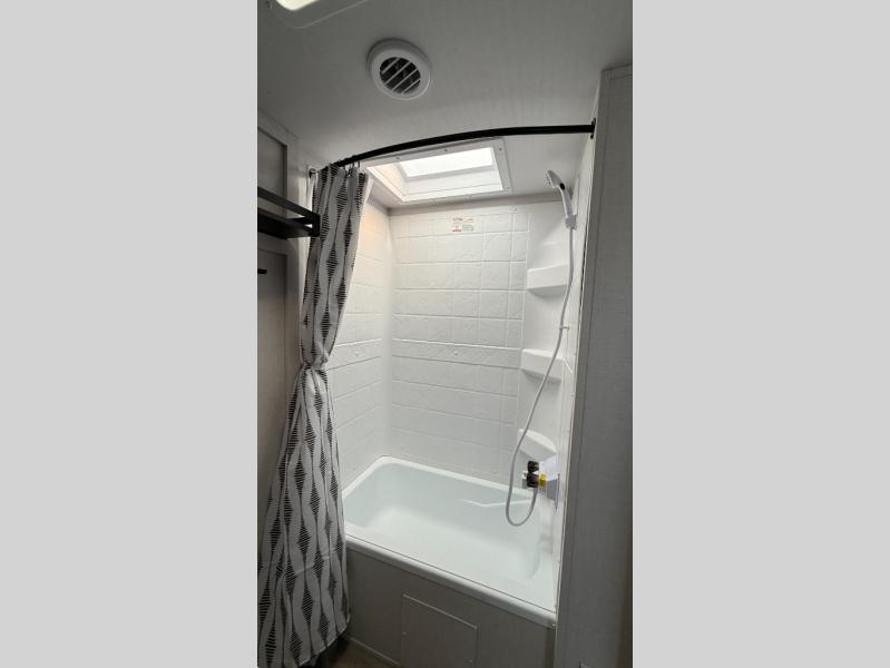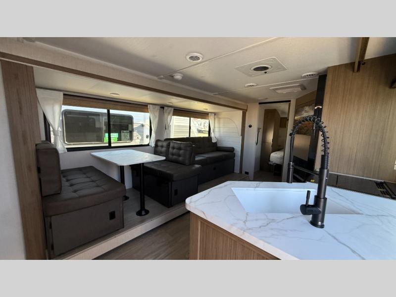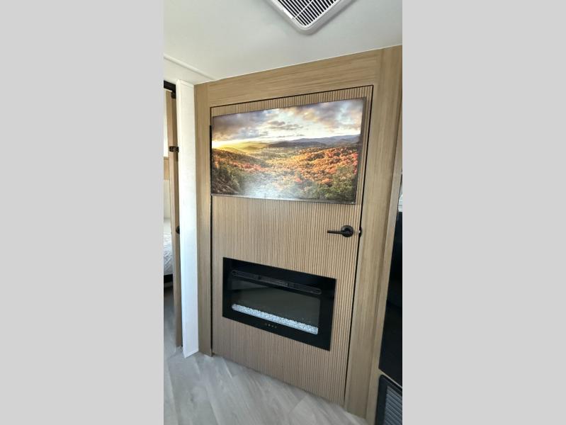 You're sure to make camping memories in this spacious travel trailer! You can sleep four to five people each night thanks to the the custom king bed with Versa Tilt in the front bedroom plus the Versa-Lounge and booth dinette within the large slide out! The full kitchen will let you make meals each day, and you'll appreciate the hidden pantry with shelves behind the fireplace. And don't overlook the full rear bath, complete with a tub/shower and ample counter space for your things.