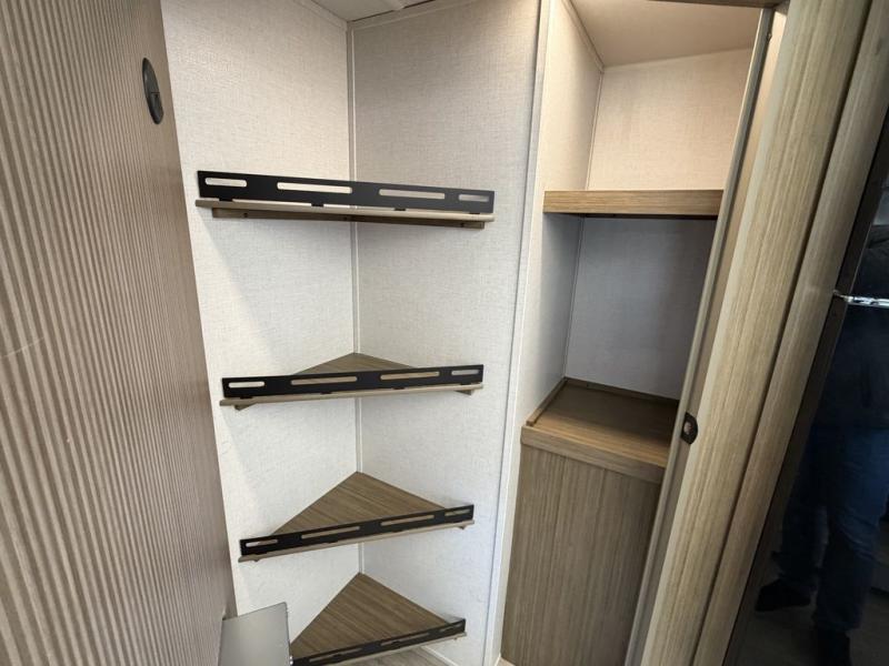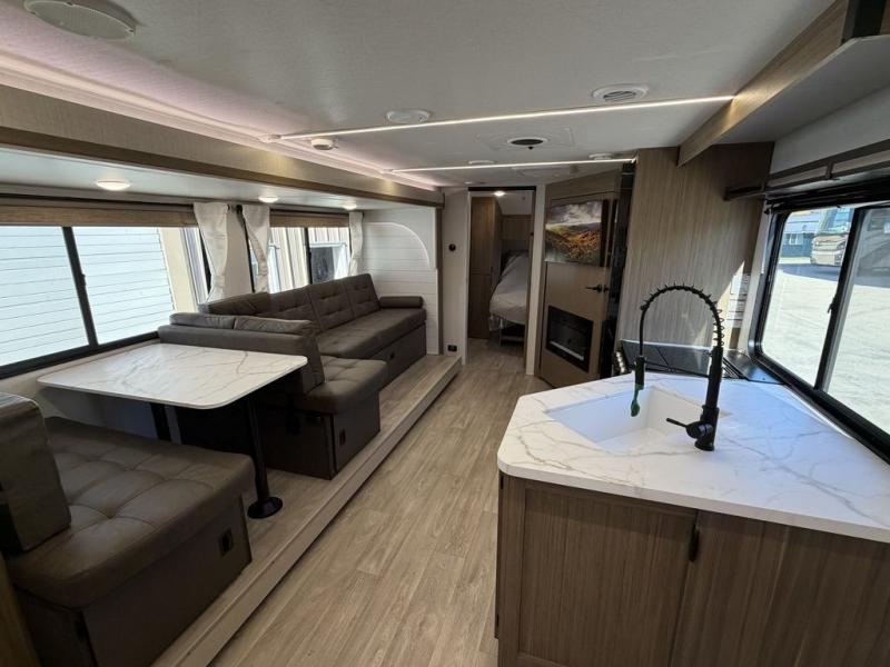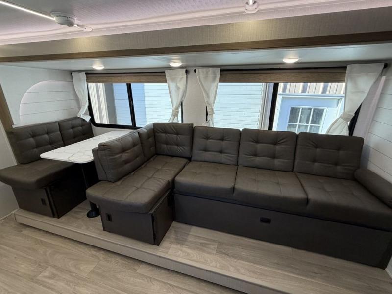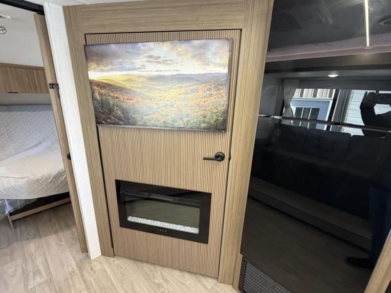 You're sure to make camping memories in this spacious travel trailer! You can sleep four to five people each night thanks to the the custom king bed with Versa Tilt in the front bedroom plus the Versa-Lounge and booth dinette within the large slide out! The full kitchen will let you make meals each day, and you'll appreciate the hidden pantry with shelves behind the fireplace. And don't overlook the full rear bath, complete with a tub/shower and ample counter space for your things.