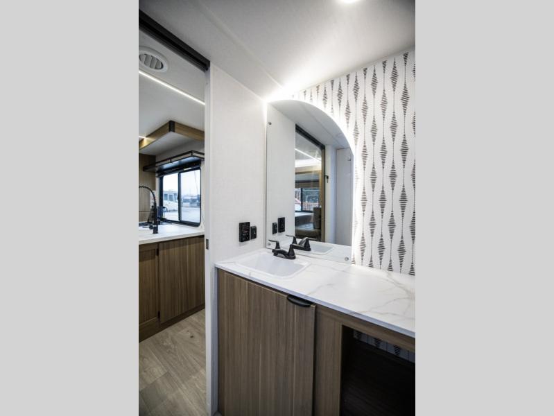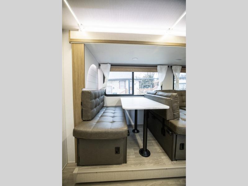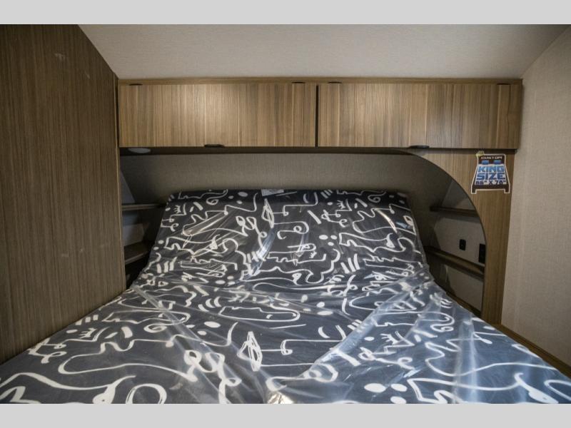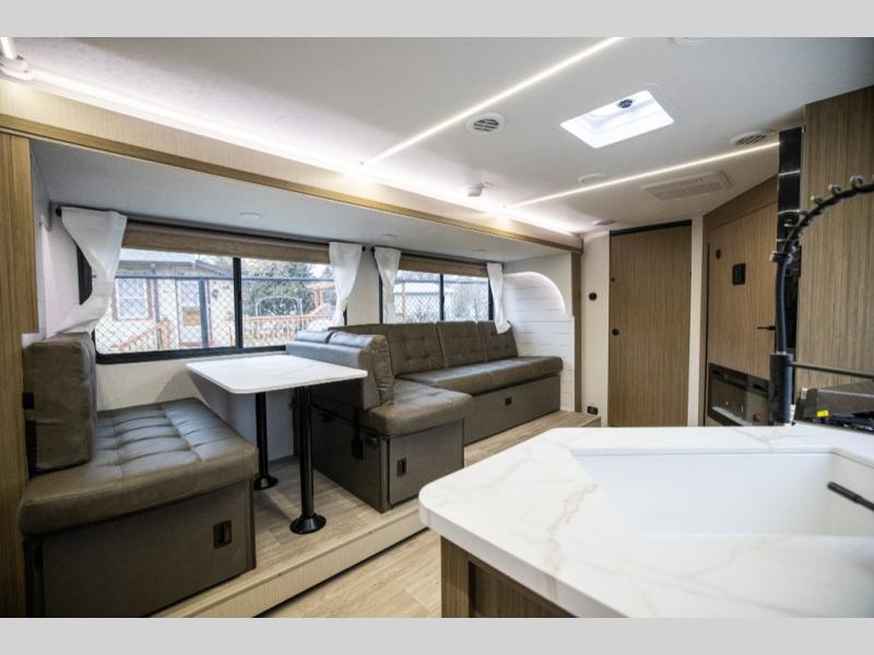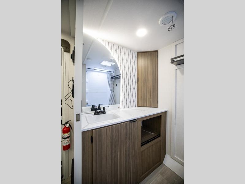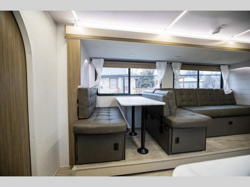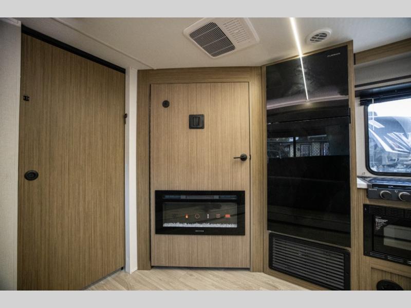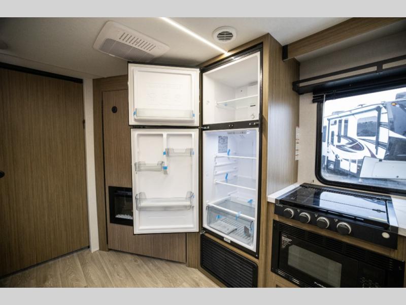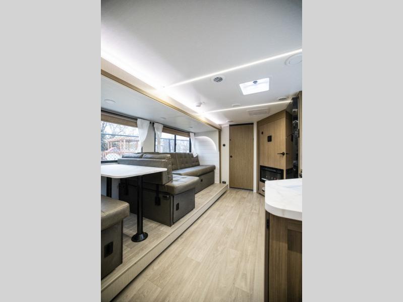 You're sure to make camping memories in this spacious travel trailer! You can sleep four to five people each night thanks to the the custom king bed with Versa Tilt in the front bedroom plus the Versa-Lounge and booth dinette within the large slide out! The full kitchen will let you make meals each day, and you'll appreciate the hidden pantry with shelves behind the fireplace. And don't overlook the full rear bath, complete with a tub/shower and ample counter space for your things.