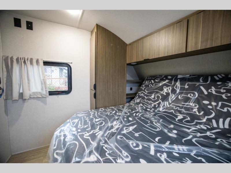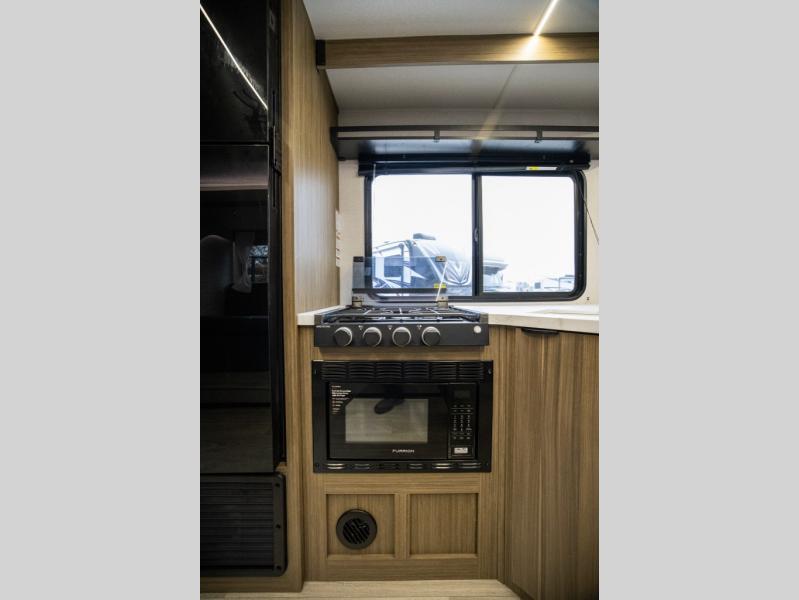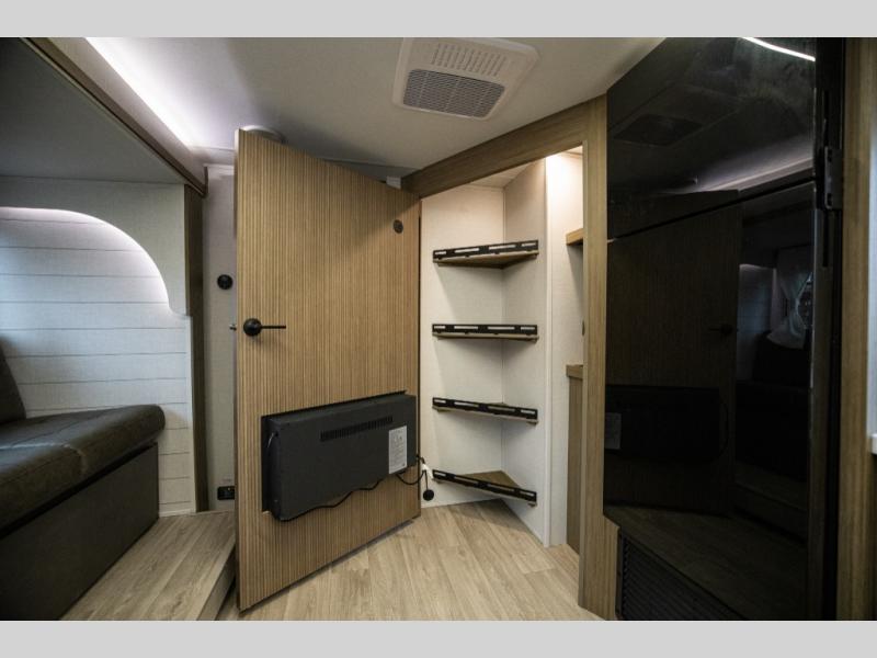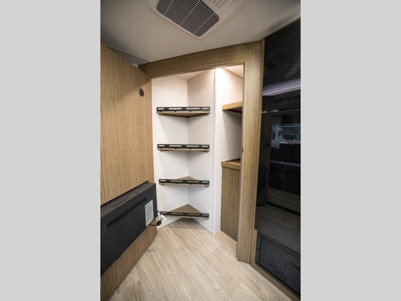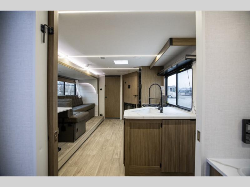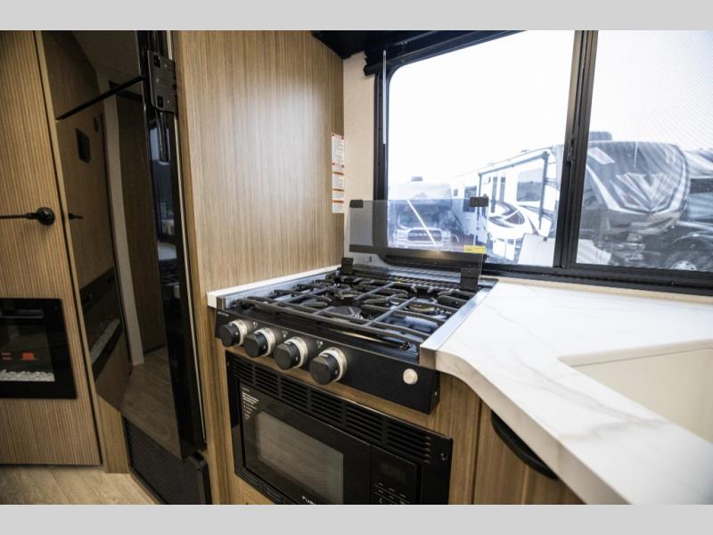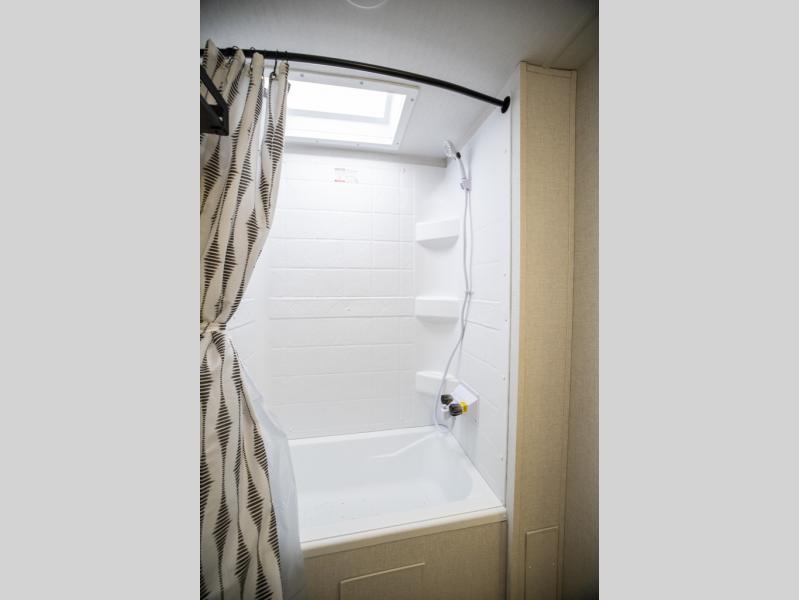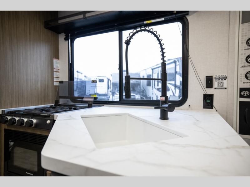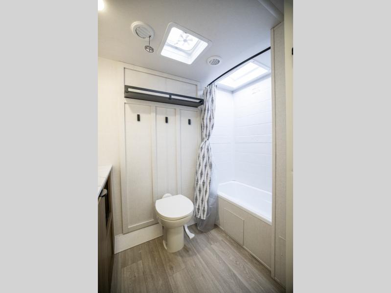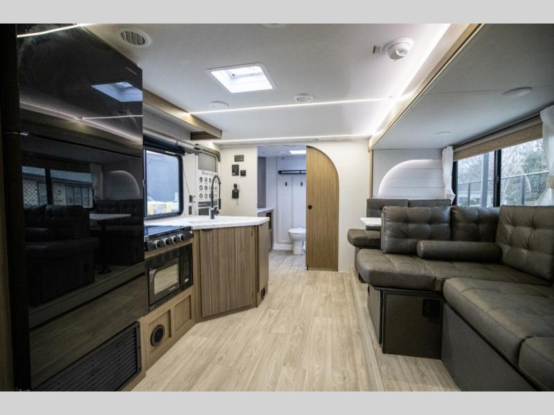 You're sure to make camping memories in this spacious travel trailer! You can sleep four to five people each night thanks to the the custom king bed with Versa Tilt in the front bedroom plus the Versa-Lounge and booth dinette within the large slide out! The full kitchen will let you make meals each day, and you'll appreciate the hidden pantry with shelves behind the fireplace. And don't overlook the full rear bath, complete with a tub/shower and ample counter space for your things.