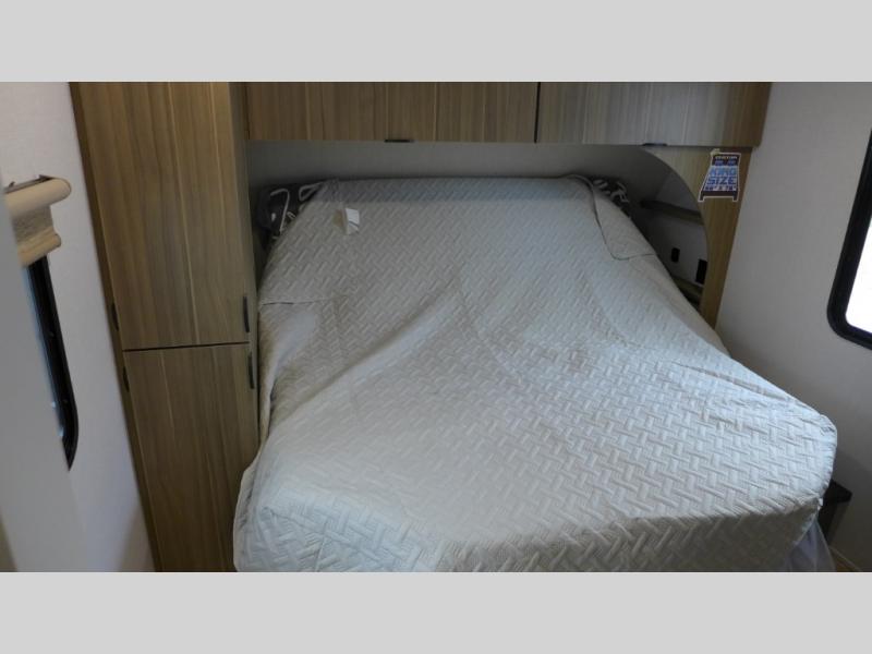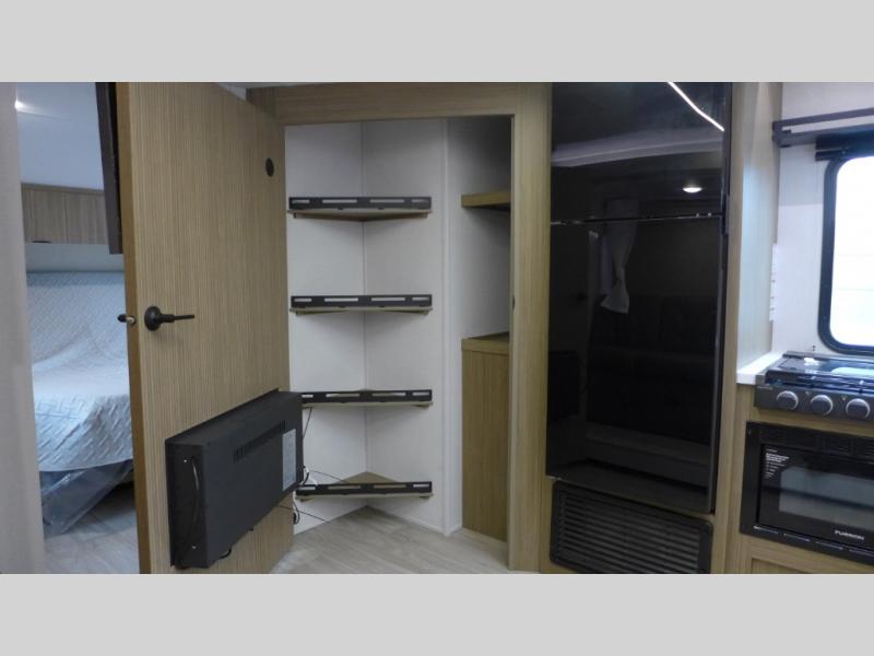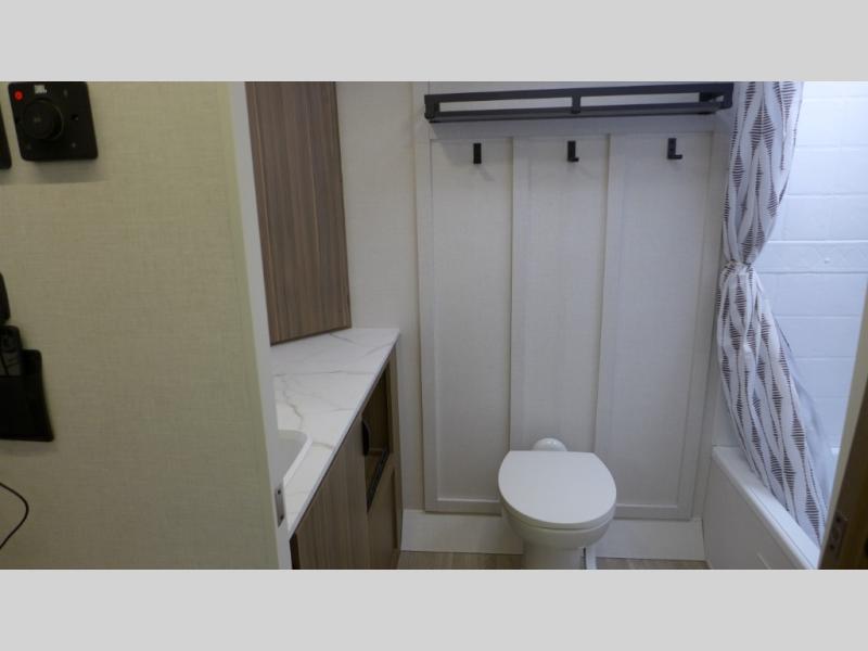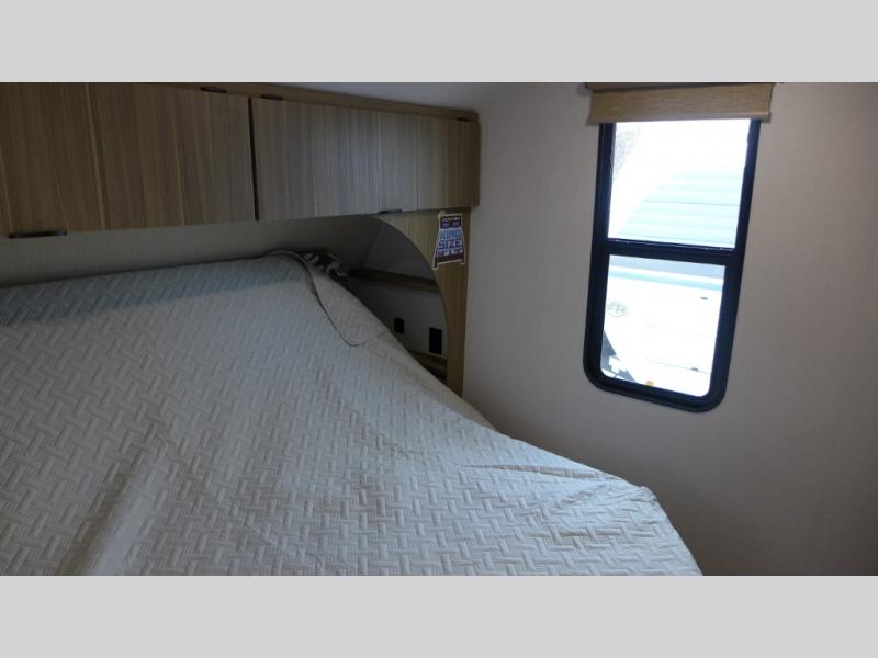 You're sure to make camping memories in this spacious travel trailer! You can sleep four to five people each night thanks to the the custom king bed with Versa Tilt in the front bedroom plus the Versa-Lounge and booth dinette within the large slide out! The full kitchen will let you make meals each day, and you'll appreciate the hidden pantry with shelves behind the fireplace. And don't overlook the full rear bath, complete with a tub/shower and ample counter space for your things.
