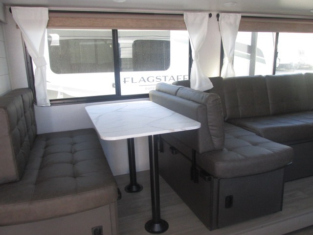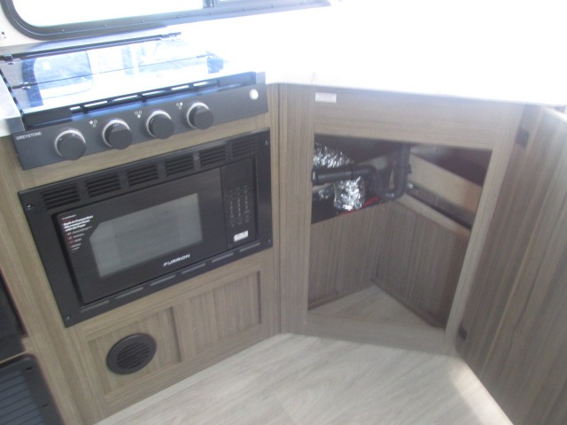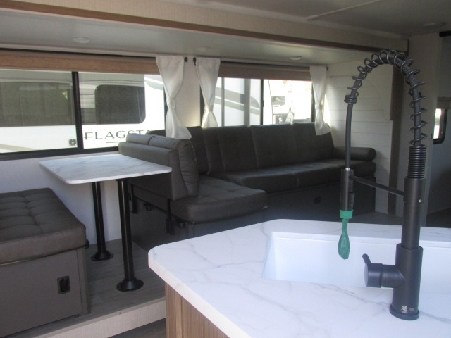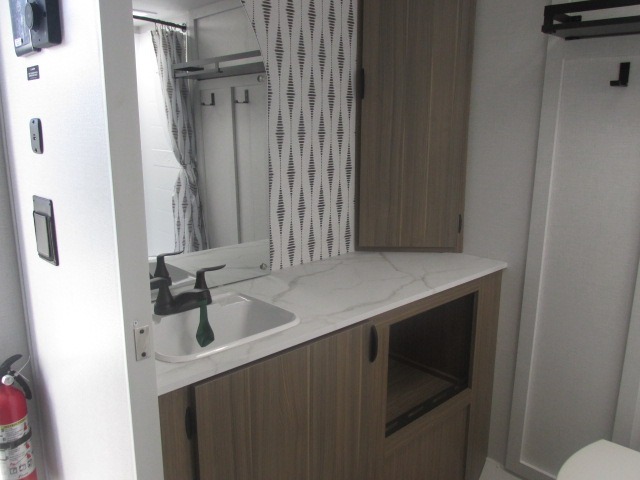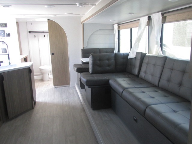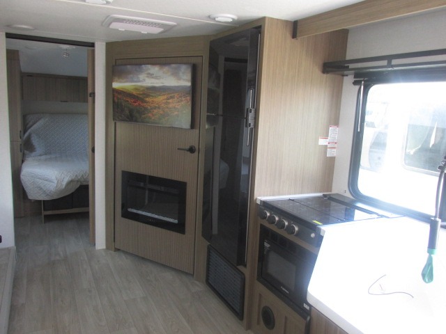 You're sure to make camping memories in this spacious travel trailer! You can sleep four to five people each night thanks to the the custom king bed with Versa Tilt in the front bedroom plus the Versa-Lounge and booth dinette within the large slide out! The full kitchen will let you make meals each day, and you'll appreciate the hidden pantry with shelves behind the fireplace. And don't overlook the full rear bath, complete with a tub/shower and ample counter space for your things.