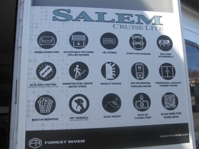 The Salem Cruise Lite travel trailers and toy haulers are value-minded units packed with great camping features! There are a variety of floorplans to choose from between two different regions. The enclosed Accessibelly will help protect against the elements and debris during transport, and the exterior retro/metal redesign is sure to be eye-catching! There are stylish roller shades inside, along with updated backsplash, elegant curtain rods and curtains, plus many more interior comforts! Choose a Salem Cruise Lite today for quality and value!