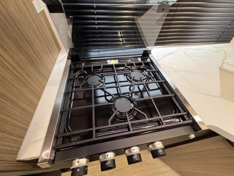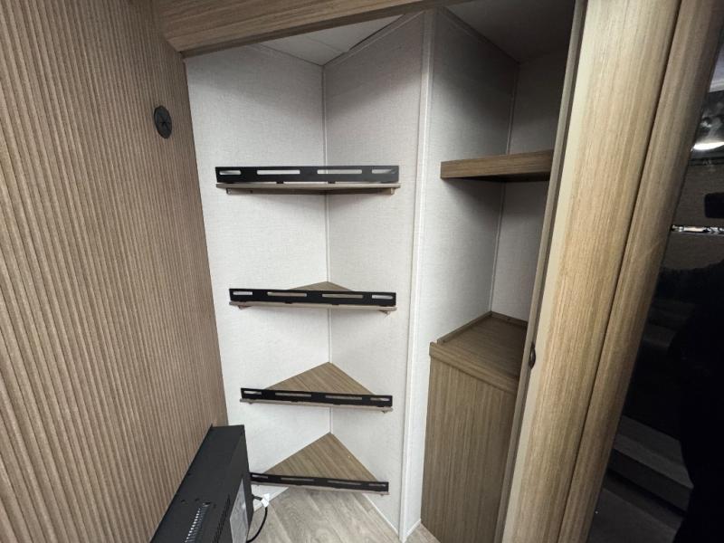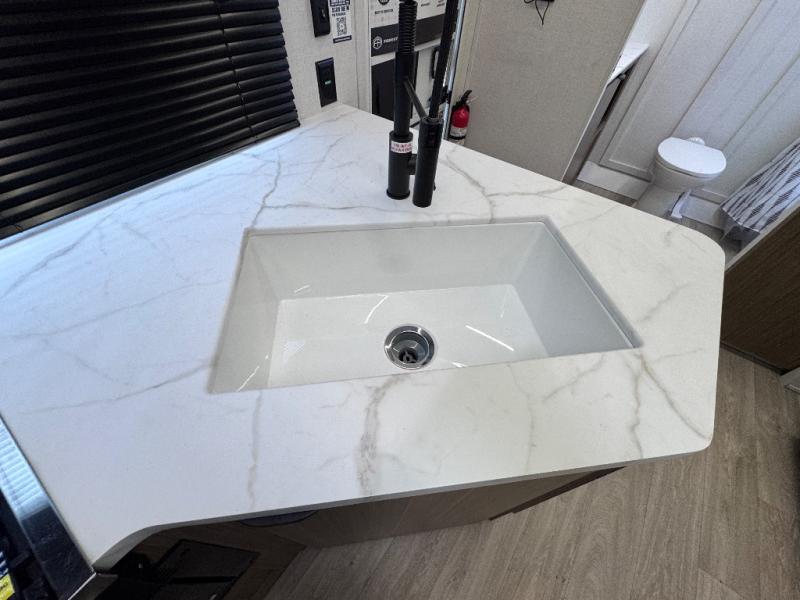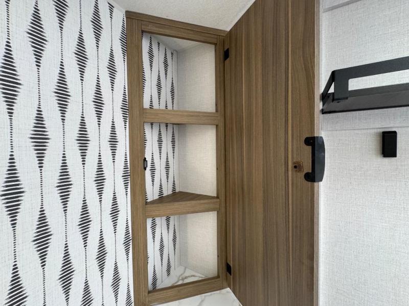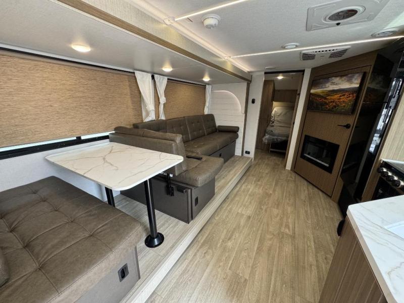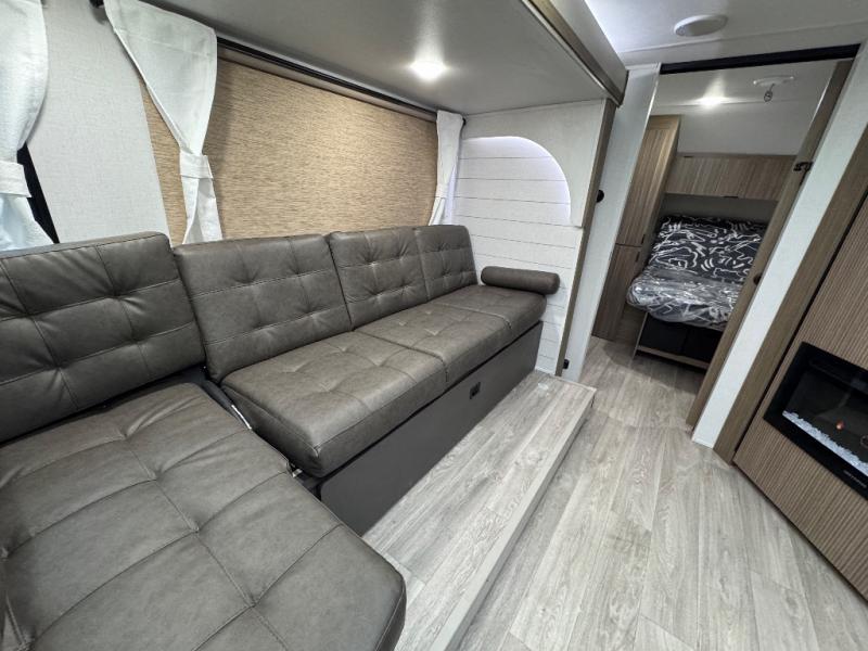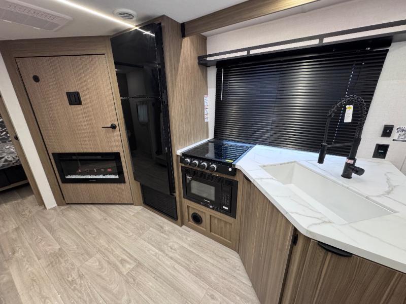 You're sure to make camping memories in this spacious travel trailer! You can sleep four to five people each night thanks to the custom king bed with Versa Tilt in the front bedroom plus the Versa-Lounge and booth dinette within the large slide out! The full kitchen will let you make meals each day, and you'll appreciate the hidden pantry with shelves behind the fireplace. And don't overlook the full rear bath, complete with a tub/shower and ample counter space for your things.