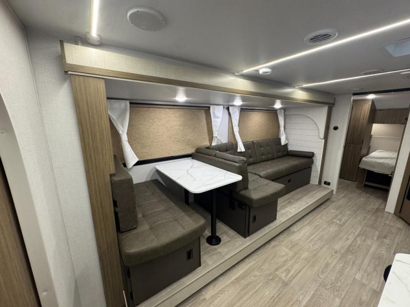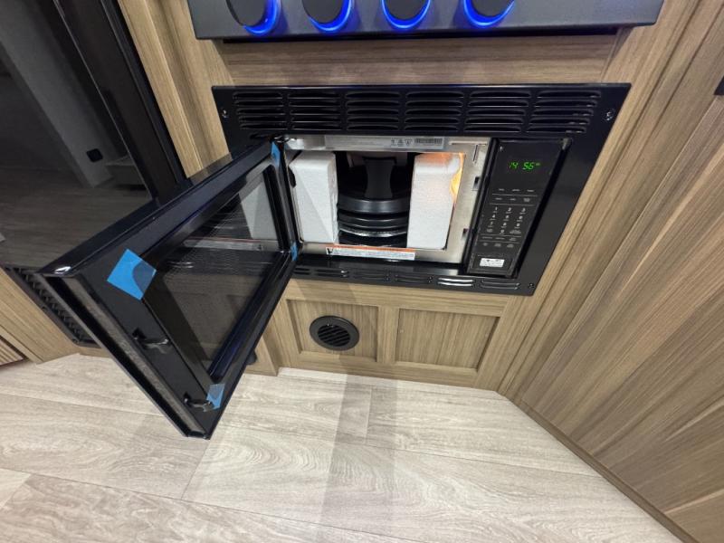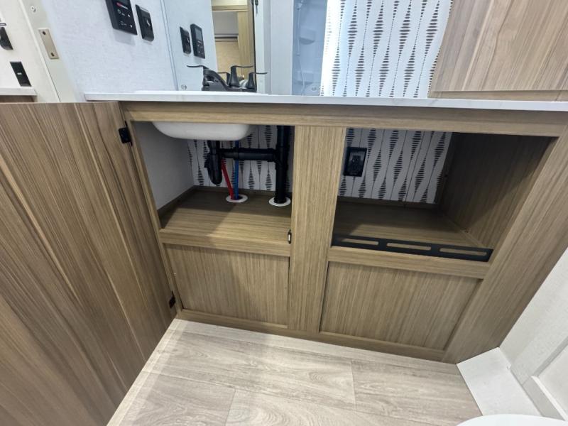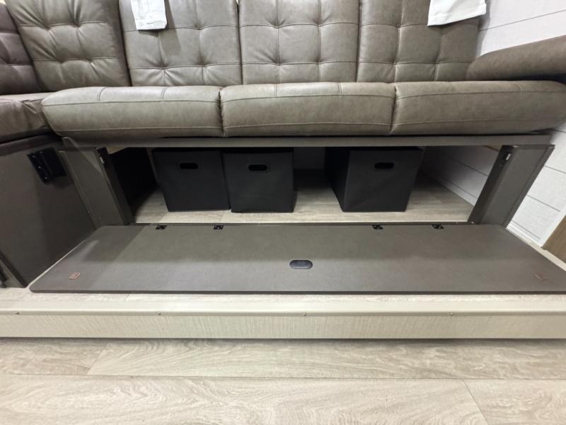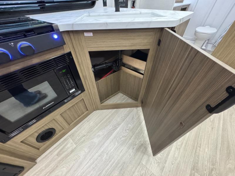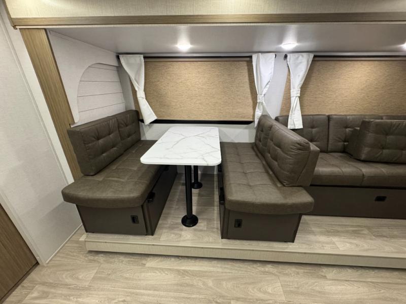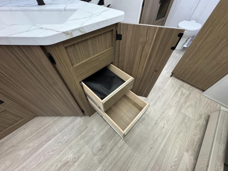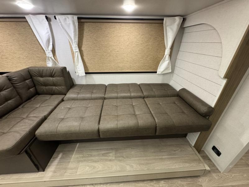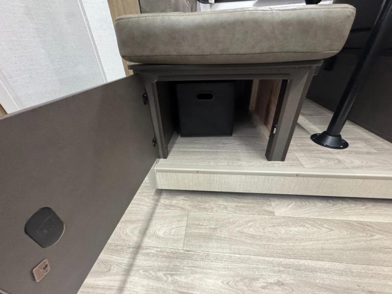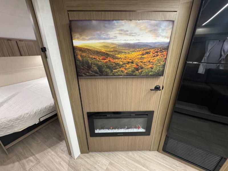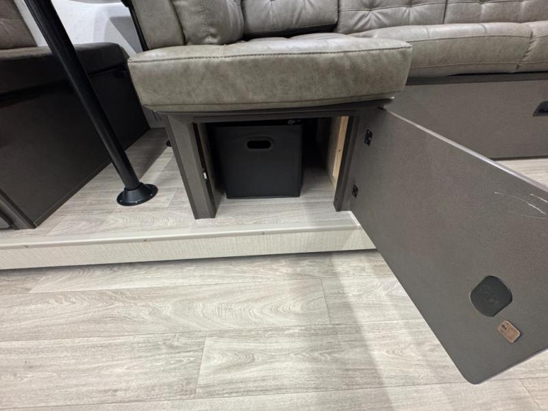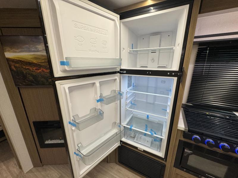 You're sure to make camping memories in this spacious travel trailer! You can sleep four to five people each night thanks to the custom king bed with Versa Tilt in the front bedroom plus the Versa-Lounge and booth dinette within the large slide out! The full kitchen will let you make meals each day, and you'll appreciate the hidden pantry with shelves behind the fireplace. And don't overlook the full rear bath, complete with a tub/shower and ample counter space for your things.