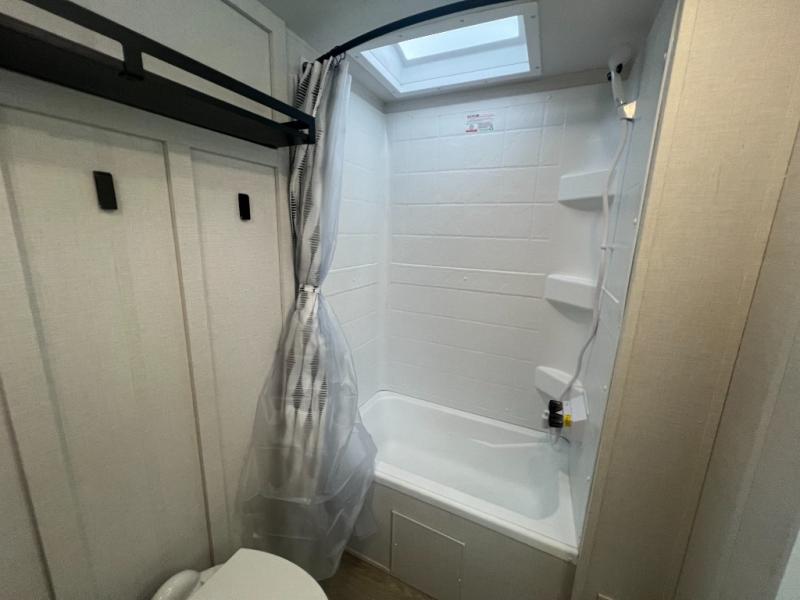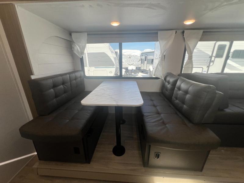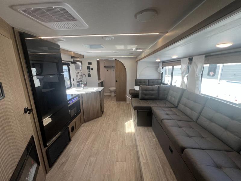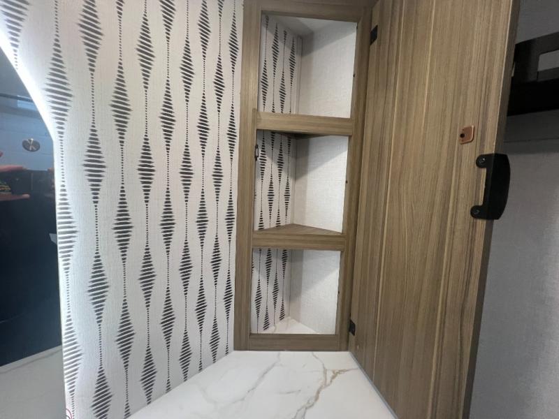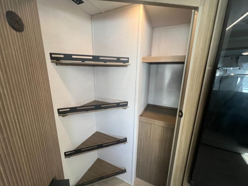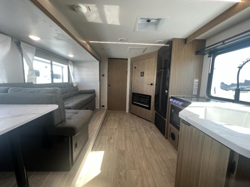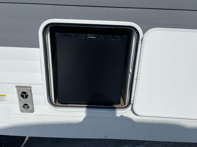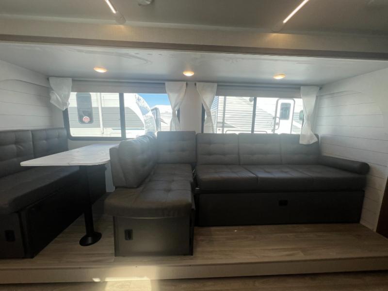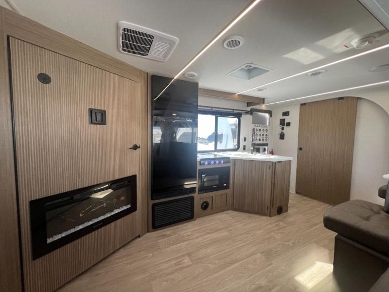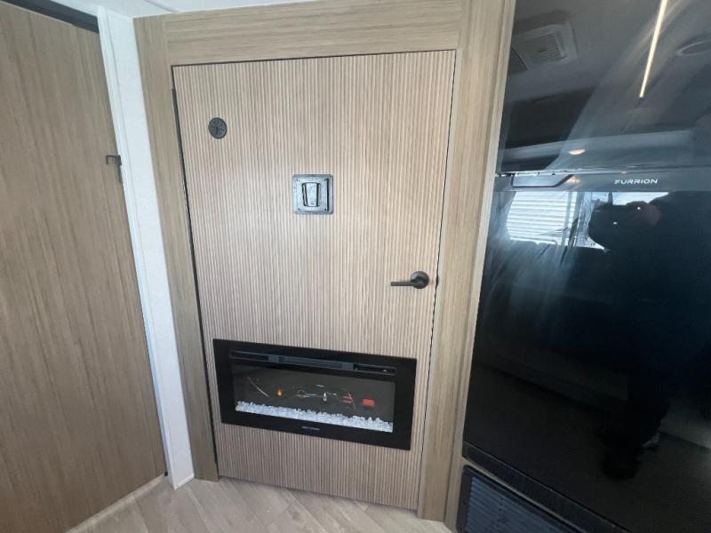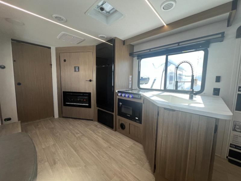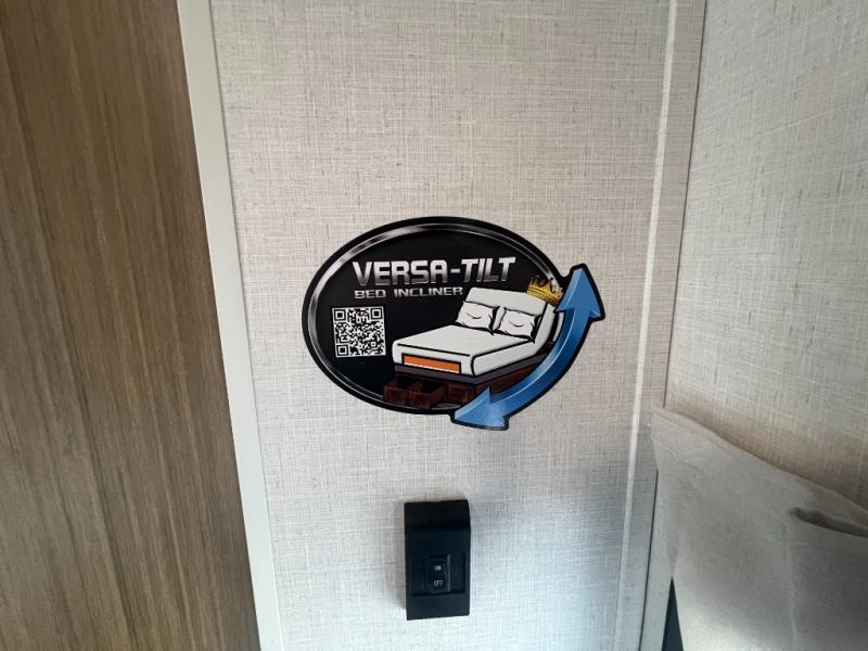 You're sure to make camping memories in this spacious travel trailer! You can sleep four to five people each night thanks to the custom king bed with Versa Tilt in the front bedroom plus the Versa-Lounge and booth dinette within the large slide out! The full kitchen will let you make meals each day, and you'll appreciate the hidden pantry with shelves behind the fireplace. And don't overlook the full rear bath, complete with a tub/shower and ample counter space for your things.