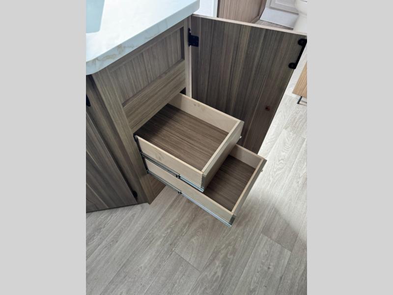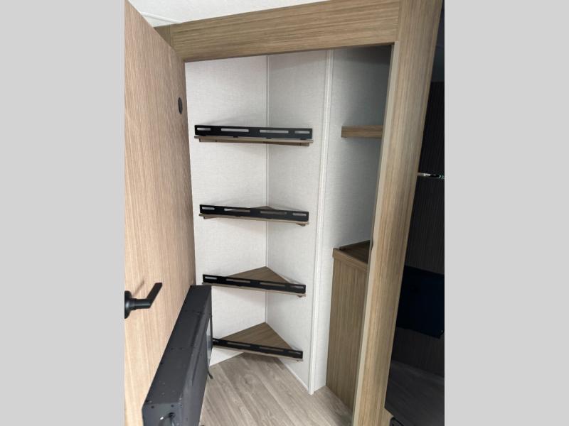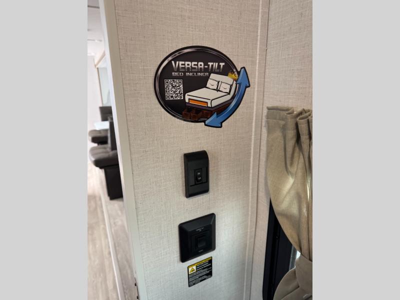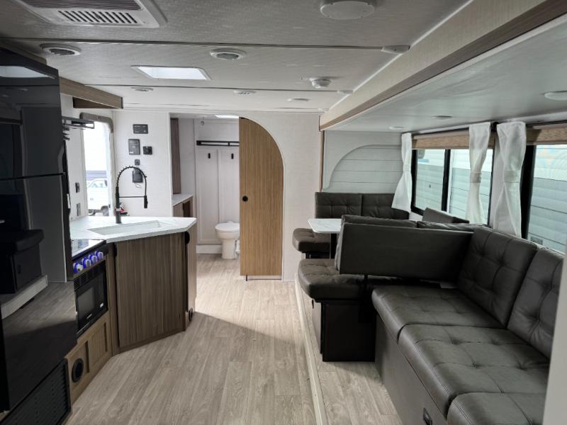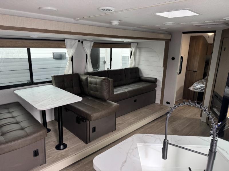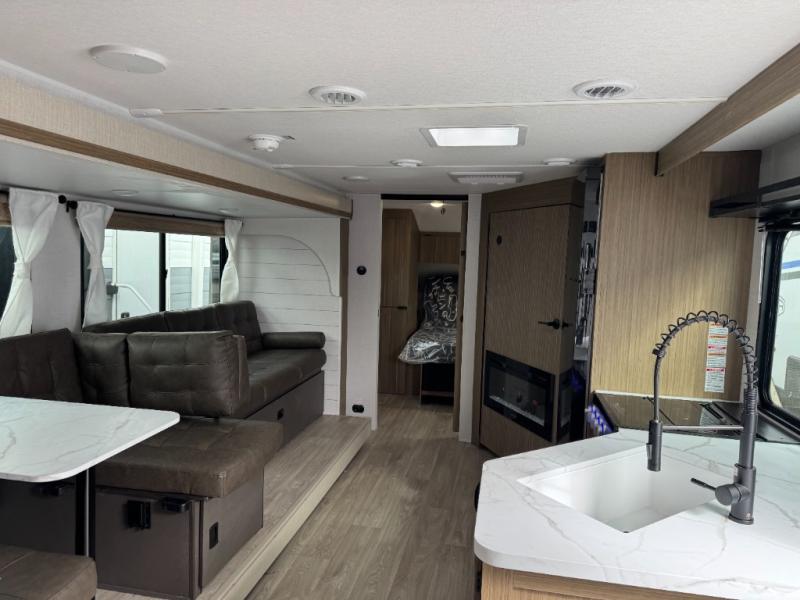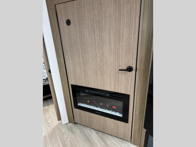 You're sure to make camping memories in this spacious travel trailer! You can sleep four to five people each night thanks to the custom king bed with Versa Tilt in the front bedroom plus the Versa-Lounge and booth dinette within the large slide out! The full kitchen will let you make meals each day, and you'll appreciate the hidden pantry with shelves behind the fireplace. And don't overlook the full rear bath, complete with a tub/shower and ample counter space for your things.
