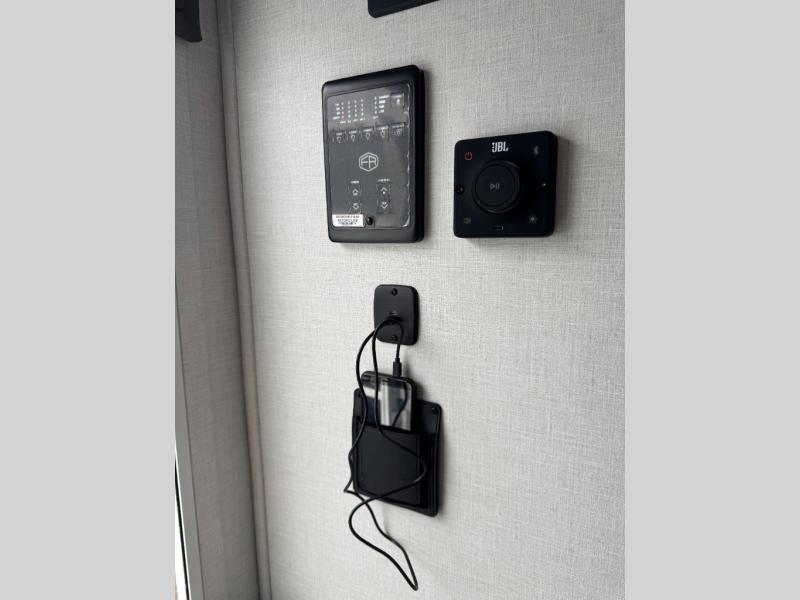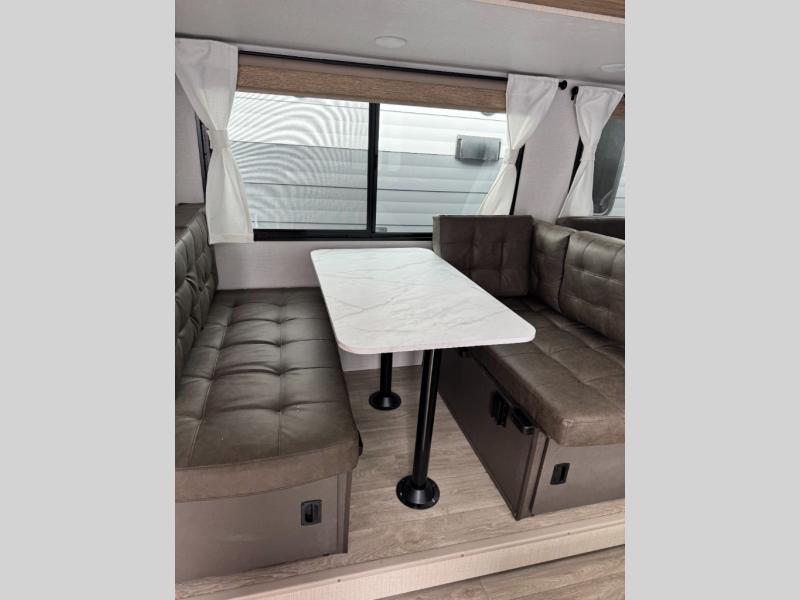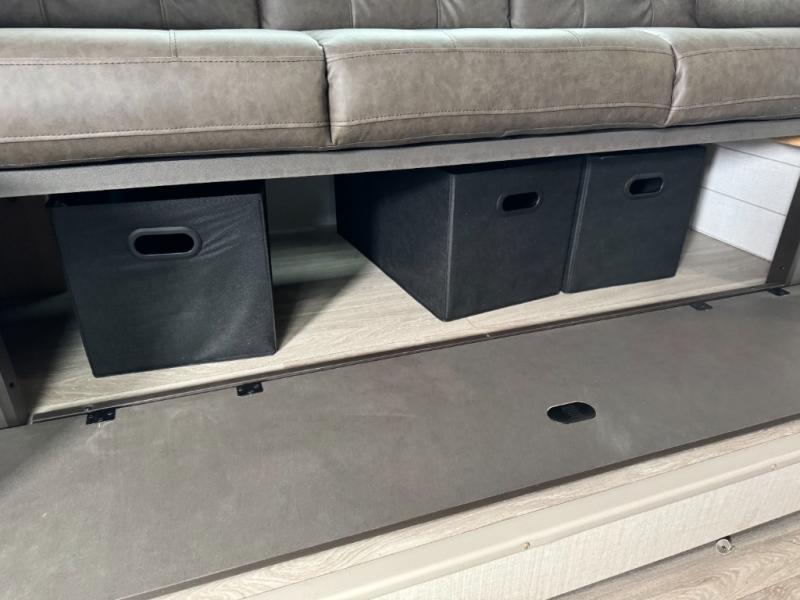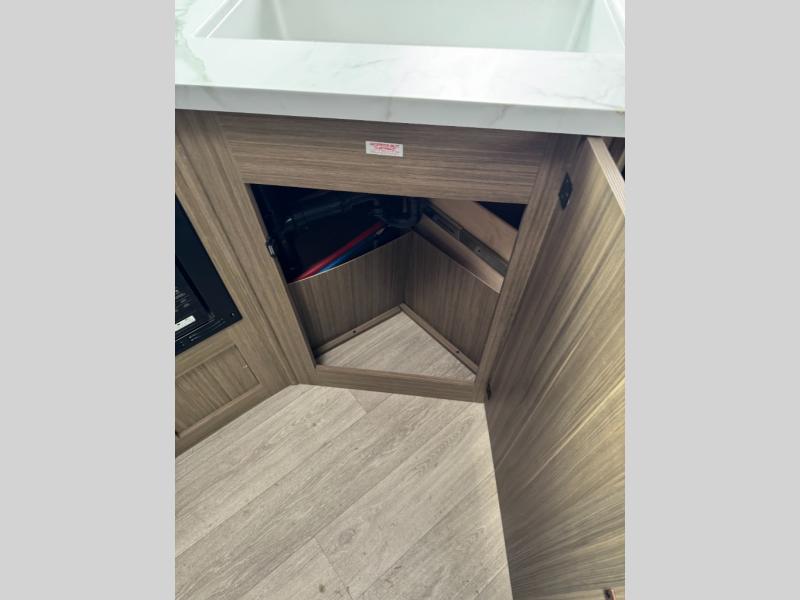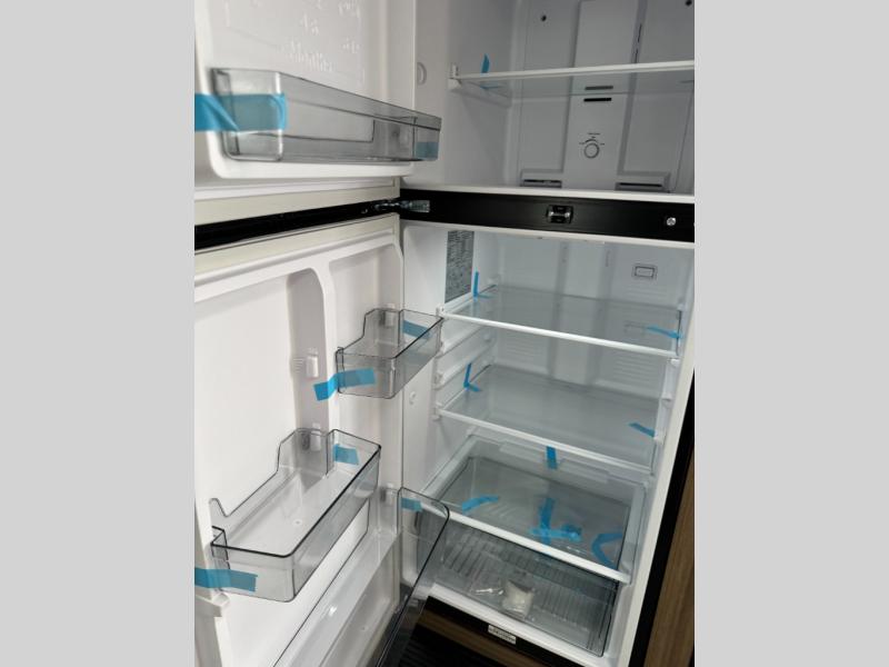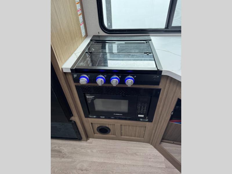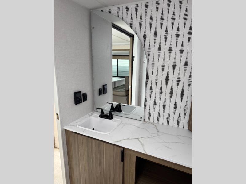 You're sure to make camping memories in this spacious travel trailer! You can sleep four to five people each night thanks to the custom king bed with Versa Tilt in the front bedroom plus the Versa-Lounge and booth dinette within the large slide out! The full kitchen will let you make meals each day, and you'll appreciate the hidden pantry with shelves behind the fireplace. And don't overlook the full rear bath, complete with a tub/shower and ample counter space for your things.