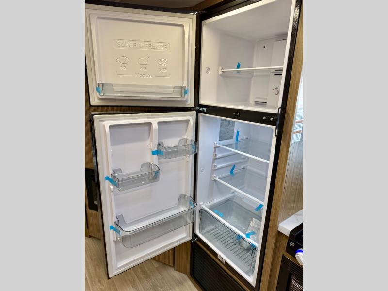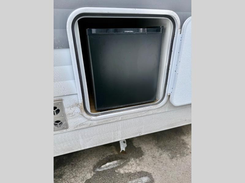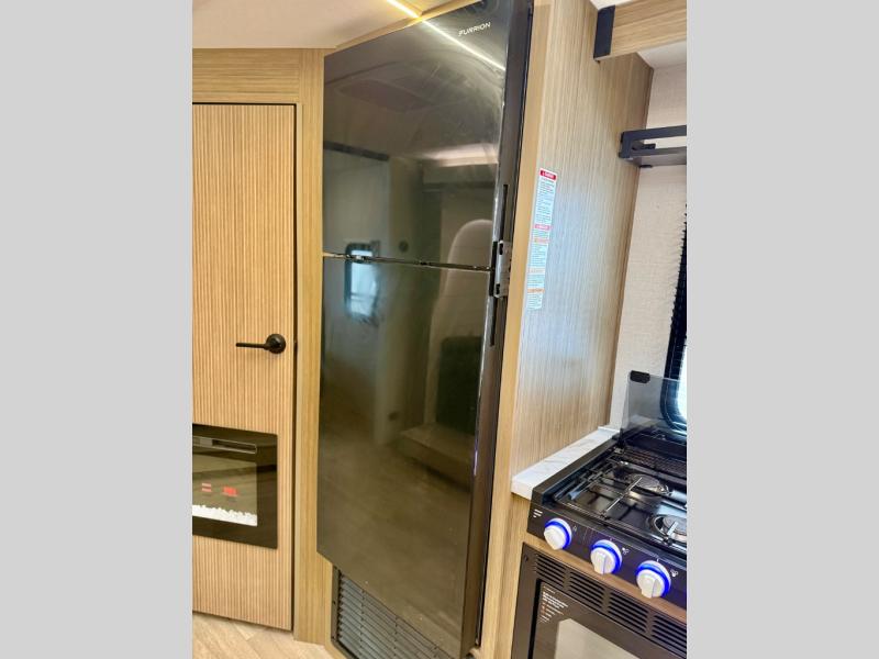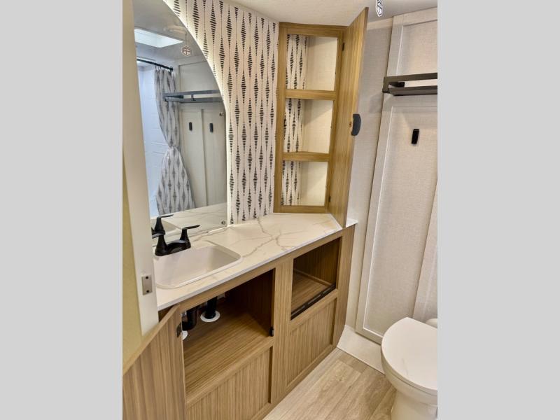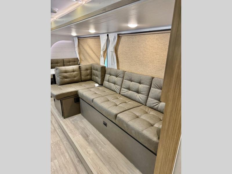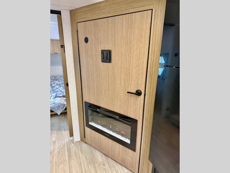 You're sure to make camping memories in this spacious travel trailer! You can sleep four to five people each night thanks to the custom king bed with Versa Tilt in the front bedroom plus the Versa-Lounge and booth dinette within the large slide out! The full kitchen will let you make meals each day, and you'll appreciate the hidden pantry with shelves behind the fireplace. And don't overlook the full rear bath, complete with a tub/shower and ample counter space for your things.