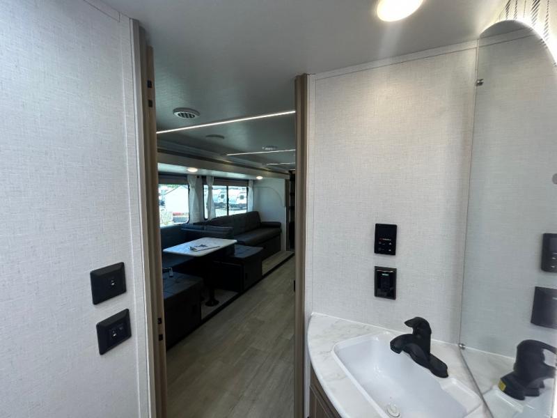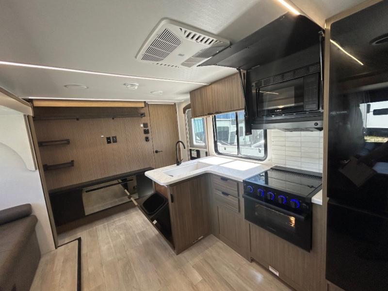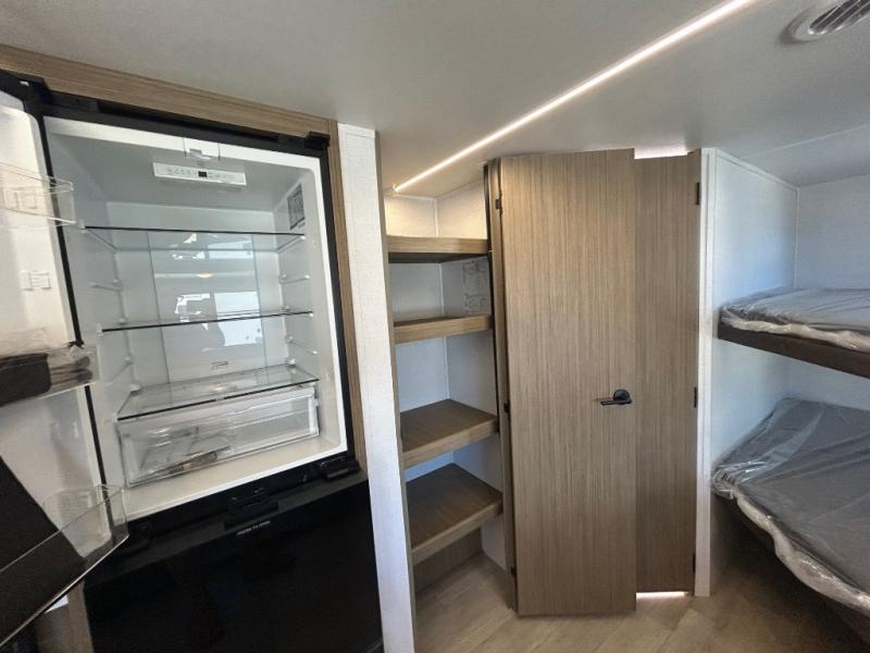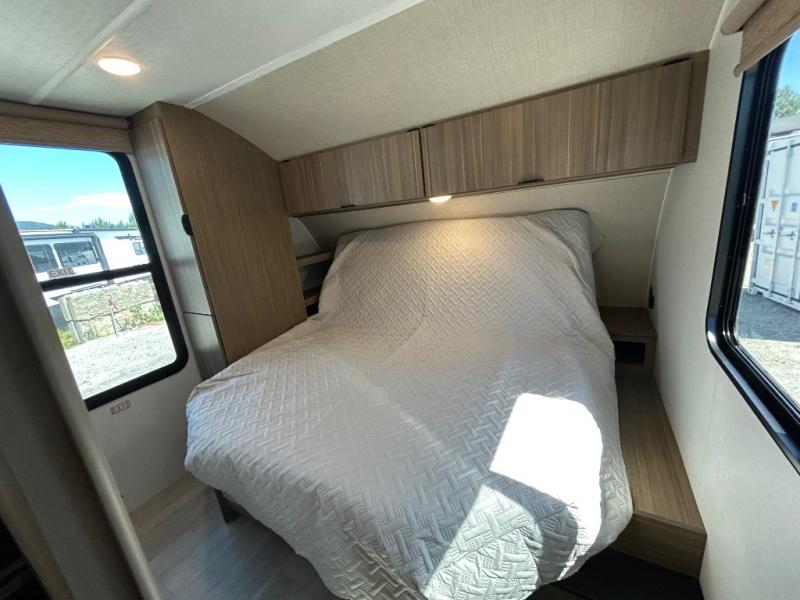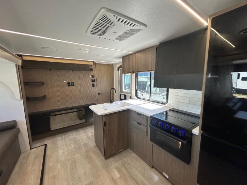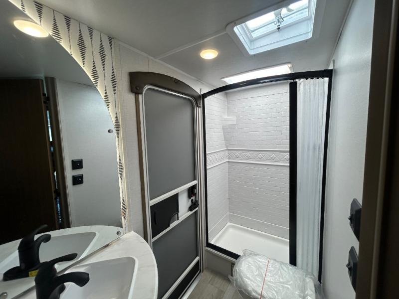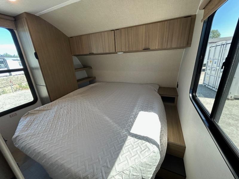 At the rear, you’ll find oversized corner bunks, perfect for the kids to stretch out and unwind. The private front bedroom features a custom king bed with Versa-Tilt, dual hanging closets, and under-bed Stow N Go Storage for added convenience.