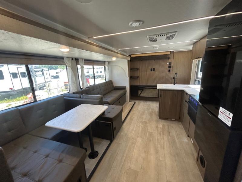 The central living area is designed for family comfort with panoramic windows, an entertainment center with a fireplace, and the versatile Versa Lounge for relaxing or hosting guests. The U-shaped dinette offers the ideal space for family meals, game nights, or an additional sleeping area.