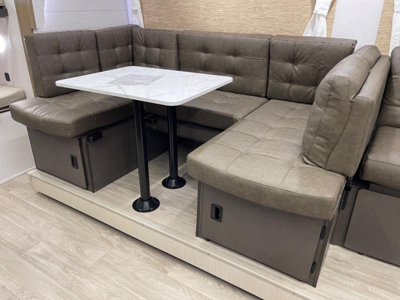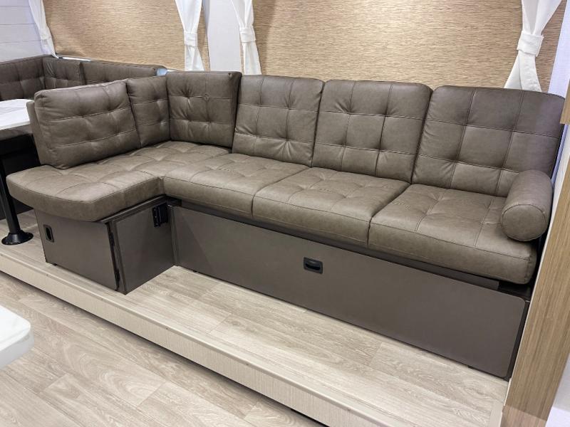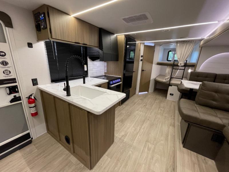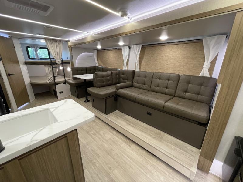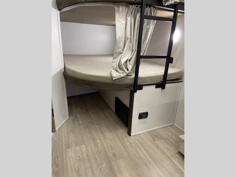 If you're looking for a travel trailer that will meet your family's needs then this one is for you! The kiddos will enjoy a good night's rest on the rear corner double-size bunk beds and you will enjoy a good night's rest on the custom king bed with Versa Tilt inside the front private bedroom. You can also transform the U-shaped dinette and Versa-lounge into extra sleeping spaces. One of the dual entrances leads directly into the rear corner bathroom which has a walk-in shower for you to get squeaky clean each morning. The walk-in pantry is big enough to store your favorite snacks and the oversized refrigerator will keep your beverages nice and cold. There is also an exterior camp kitchen you are sure to love!
