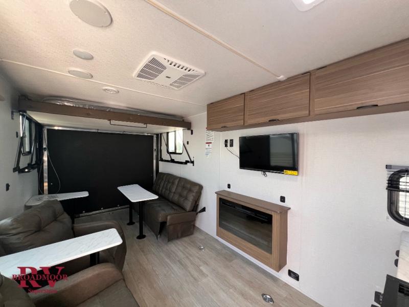 There is ample space in this toy hauler for your gear, guests and more! Once you've unloaded your dirt bikes using the ramp door, you can set up the party patio, relax on the flip sofa and dual lounge chairs, or set up the pull-down bed for guests if it's late. The entertainment center and fireplace in the main living area will make this space more cozy, and you can whip up your best meals in the kitchen. A large walk-thru bath lets you freshen up after trail riding, and a front master bedroom is sure to bring comfort with its custom king bed with Versa-Tilt.