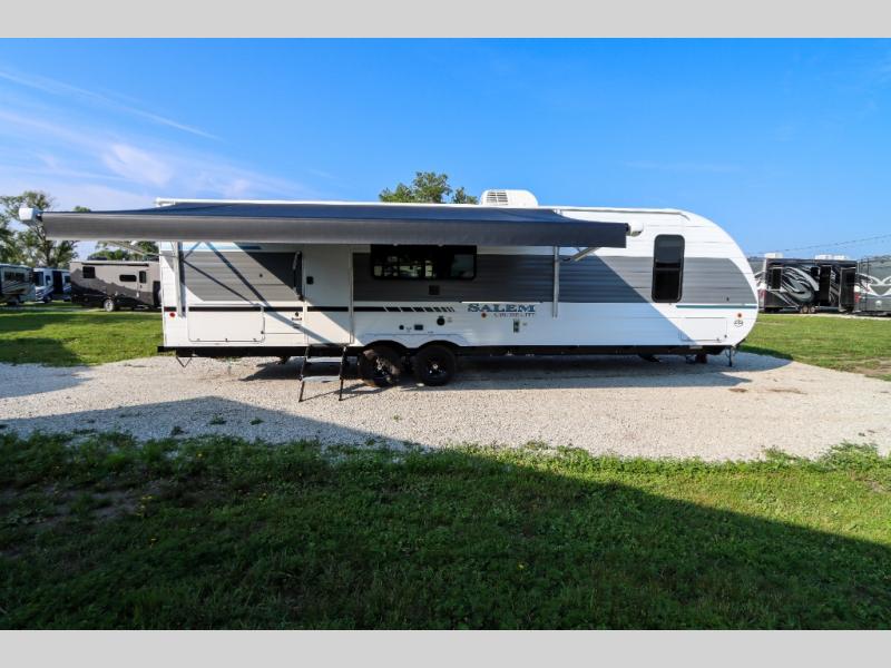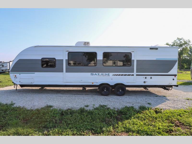 The Salem Cruise Lite travel trailers and toy haulers are value-minded units packed with great camping features! There are a variety of floorplans to choose from between three different regions. The enclosed Accessibelly will help protect against the elements and debris during transport, and the exterior retro/metal redesign is sure to be eye-catching! There are stylish roller shades inside, along with updated backsplash, elegant curtain rods and curtains, plus many more interior comforts! Choose a Salem Cruise Lite today for quality and value!