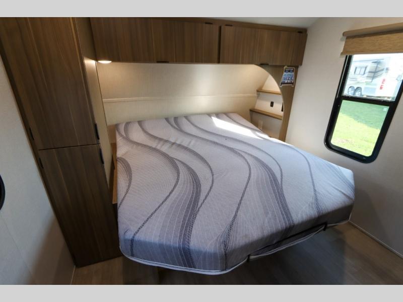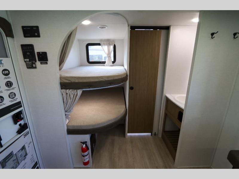 You're sure to make camping memories in this spacious travel trailer! You can easily sleep eight people each night thanks to the double-size bunks, the custom king bed with Versa Tilt in the front bedroom plus the Versa-Lounge within the large slide out! The cooktop and microwave oven will let you make meals each day, and you'll appreciate the hidden pantry with shelves behind the fireplace. There is also a booth dinette where you can dine together or play a game of cards after dinner is cleaned up, or you may just find yourselves outdoors under the 18' awning with 4K blade lighting. And don't overlook the full bath, complete with a tub/shower that will make bath time easier if you have little ones.