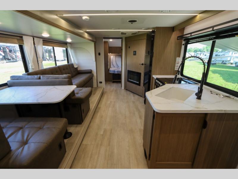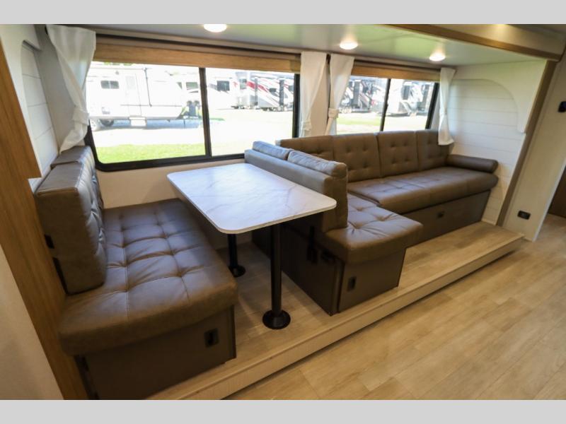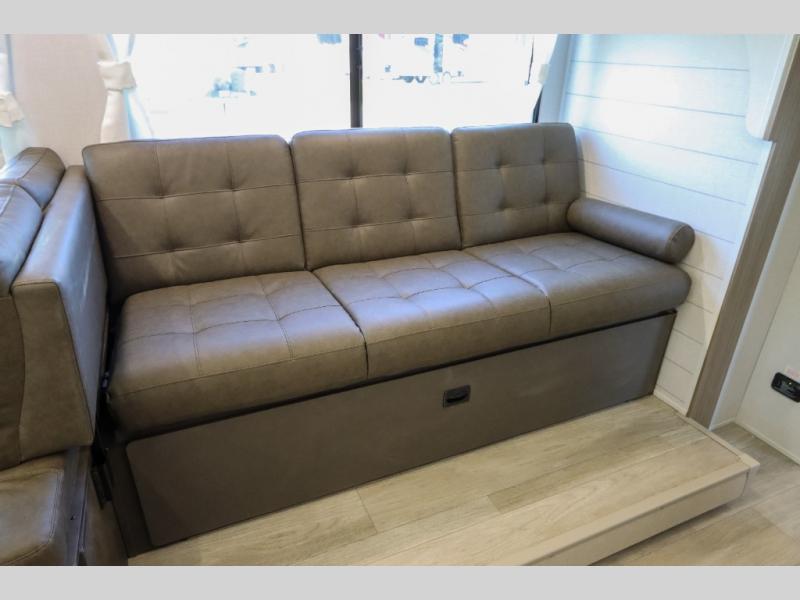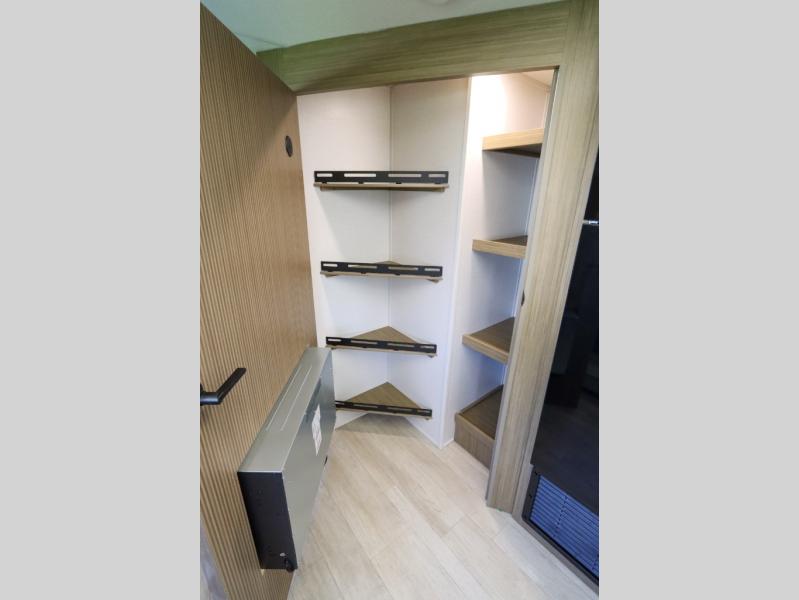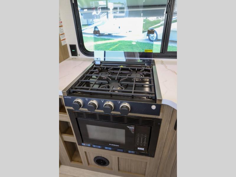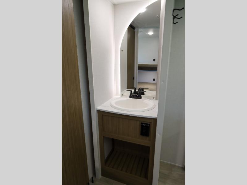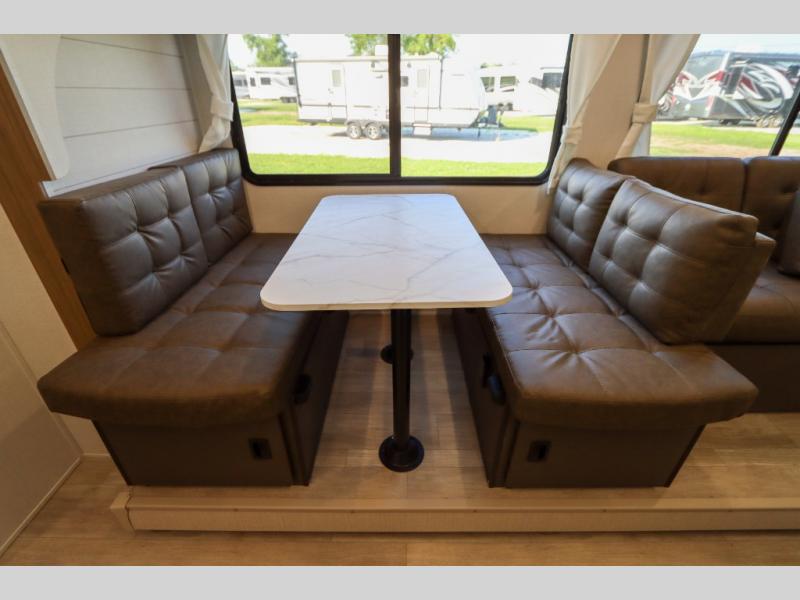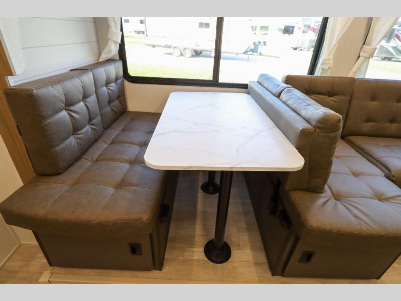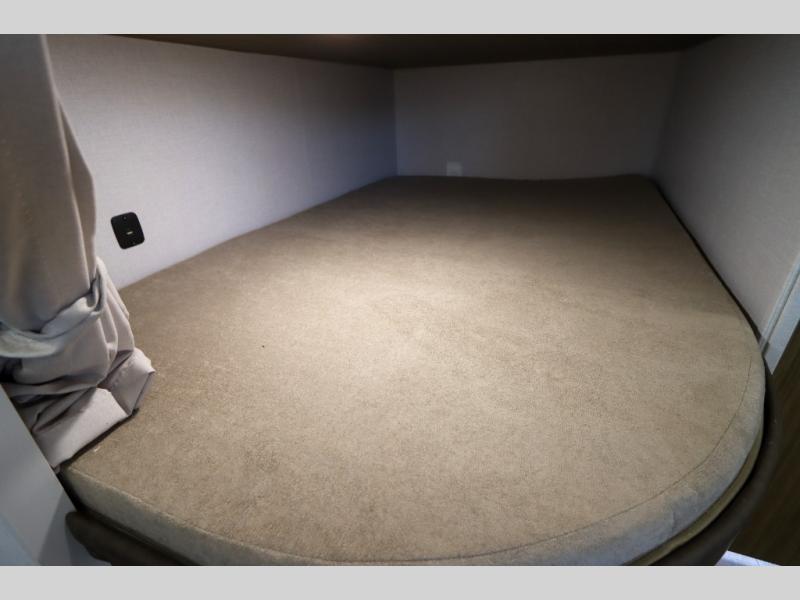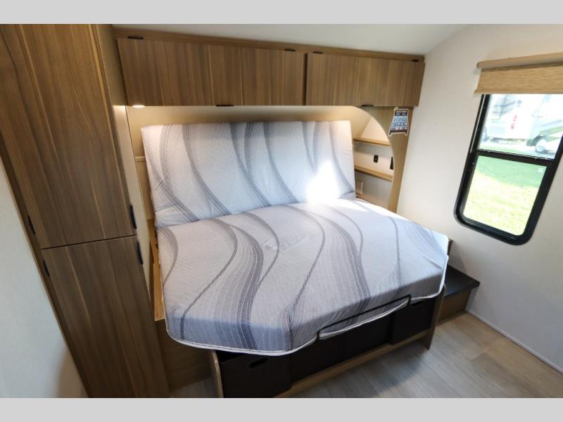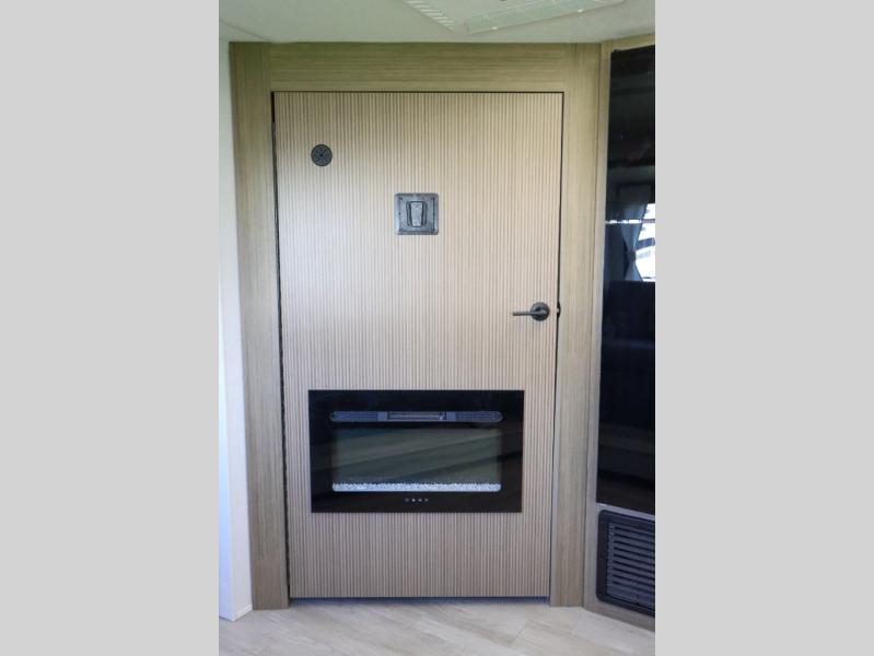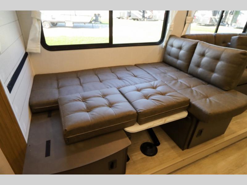You're sure to make camping memories in this spacious travel trailer! You can easily sleep eight people each night thanks to the double-size bunks, the custom king bed with Versa Tilt in the front bedroom plus the Versa-Lounge within the large slide out! The cooktop and microwave oven will let you make meals each day, and you'll appreciate the hidden pantry with shelves behind the fireplace. There is also a booth dinette where you can dine together or play a game of cards after dinner is cleaned up, or you may just find yourselves outdoors under the 18' awning with 4K blade lighting. And don't overlook the full bath, complete with a tub/shower that will make bath time easier if you have little ones.