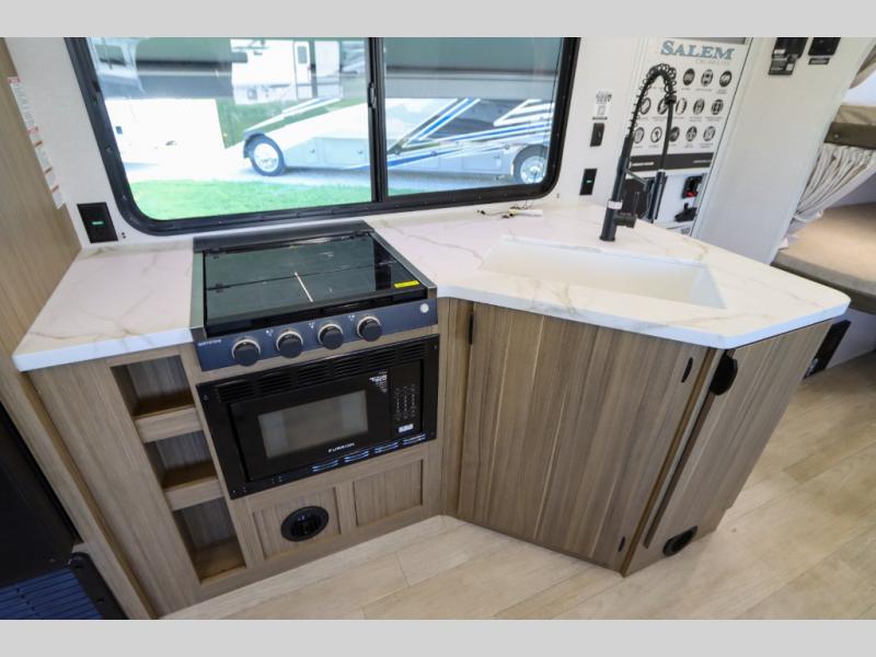 The Salem Cruise Lite travel trailers and toy haulers are value-minded units packed with great camping features! There are a variety of floorplans to choose from between three different regions. The enclosed Accessibelly will help protect against the elements and debris during transport, and the exterior retro/metal redesign is sure to be eye-catching! There are stylish roller shades inside, along with updated backsplash, elegant curtain rods and curtains, plus many more interior comforts! Choose a Salem Cruise Lite today for quality and value!