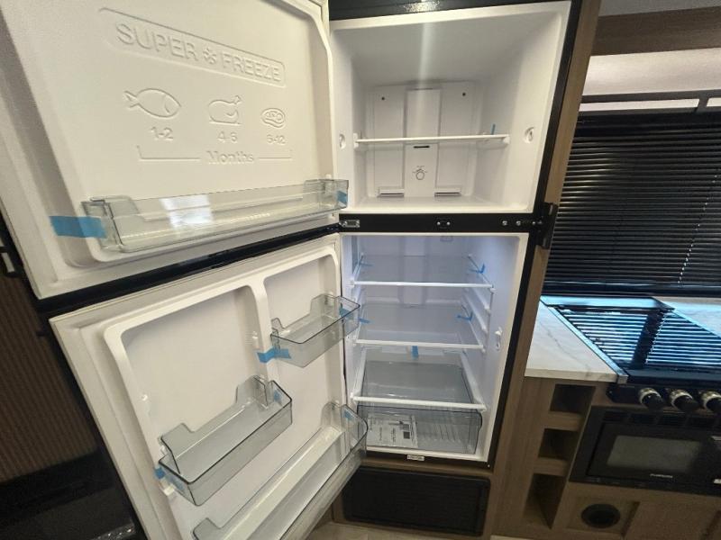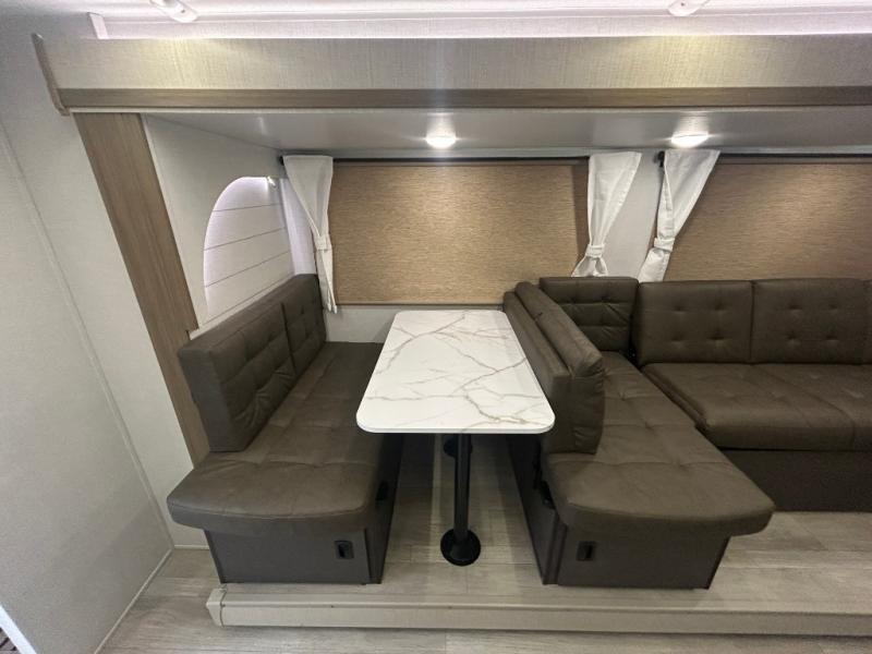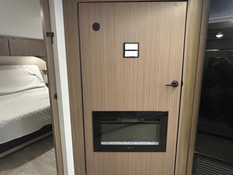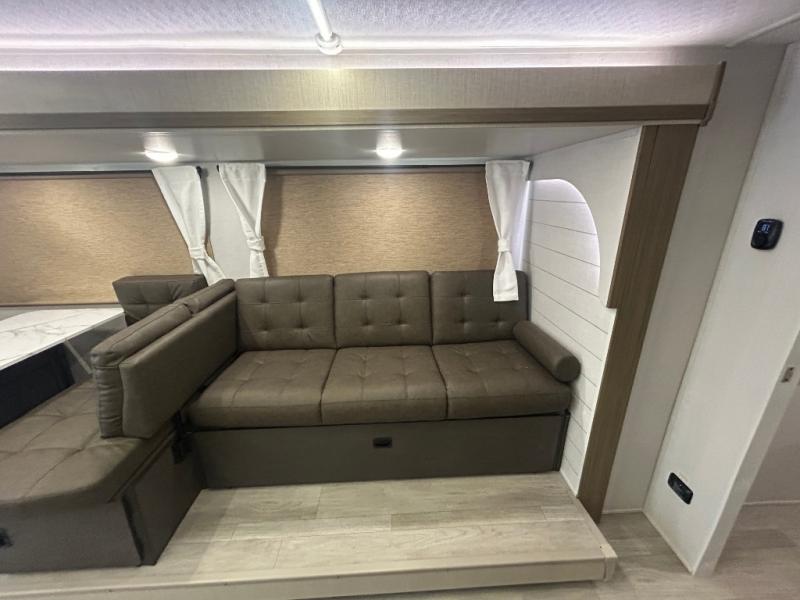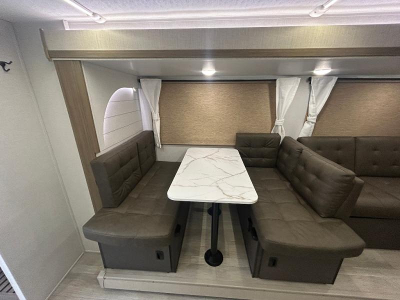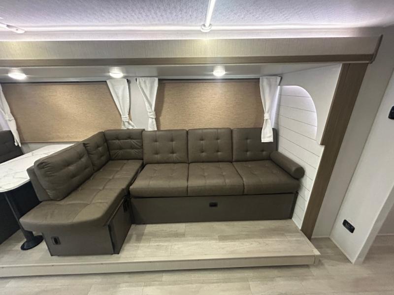 You're sure to make camping memories in this spacious travel trailer! You can easily sleep eight people each night thanks to the double-size bunks, the custom king bed with Versa Tilt in the front bedroom plus the Versa-Lounge within the large slide out! The cooktop and microwave oven will let you make meals each day, and you'll appreciate the hidden pantry with shelves behind the fireplace. There is also a booth dinette where you can dine together or play a game of cards after dinner is cleaned up, or you may just find yourselves outdoors under the 18' awning with 4K blade lighting. And don't overlook the full bath, complete with a tub/shower that will make bath time easier if you have little ones.
