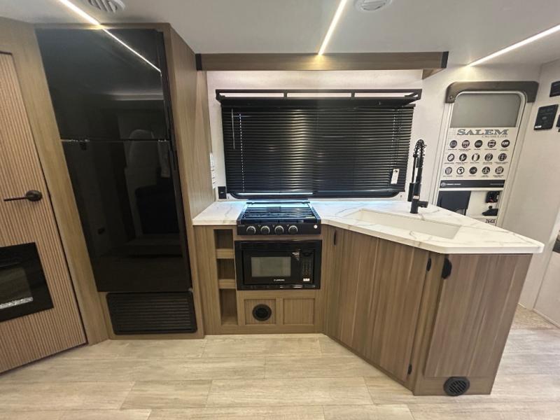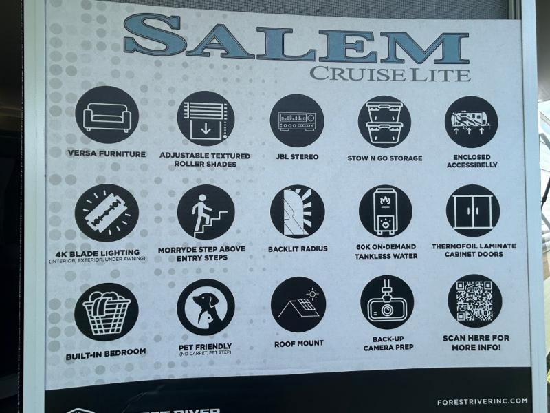 The Salem travel trailers and toy haulers are value-minded units packed with great camping features! There are a variety of floorplans to choose from between two different regions. The enclosed Accessibelly will help protect against the elements and debris during transport, and the exterior retro/metal redesign is sure to be eye-catching! There are stylish roller shades inside, along with updated backsplash, elegant curtain rods and curtains, plus many more interior comforts! Choose a Salem Cruise Lite today for quality and value!